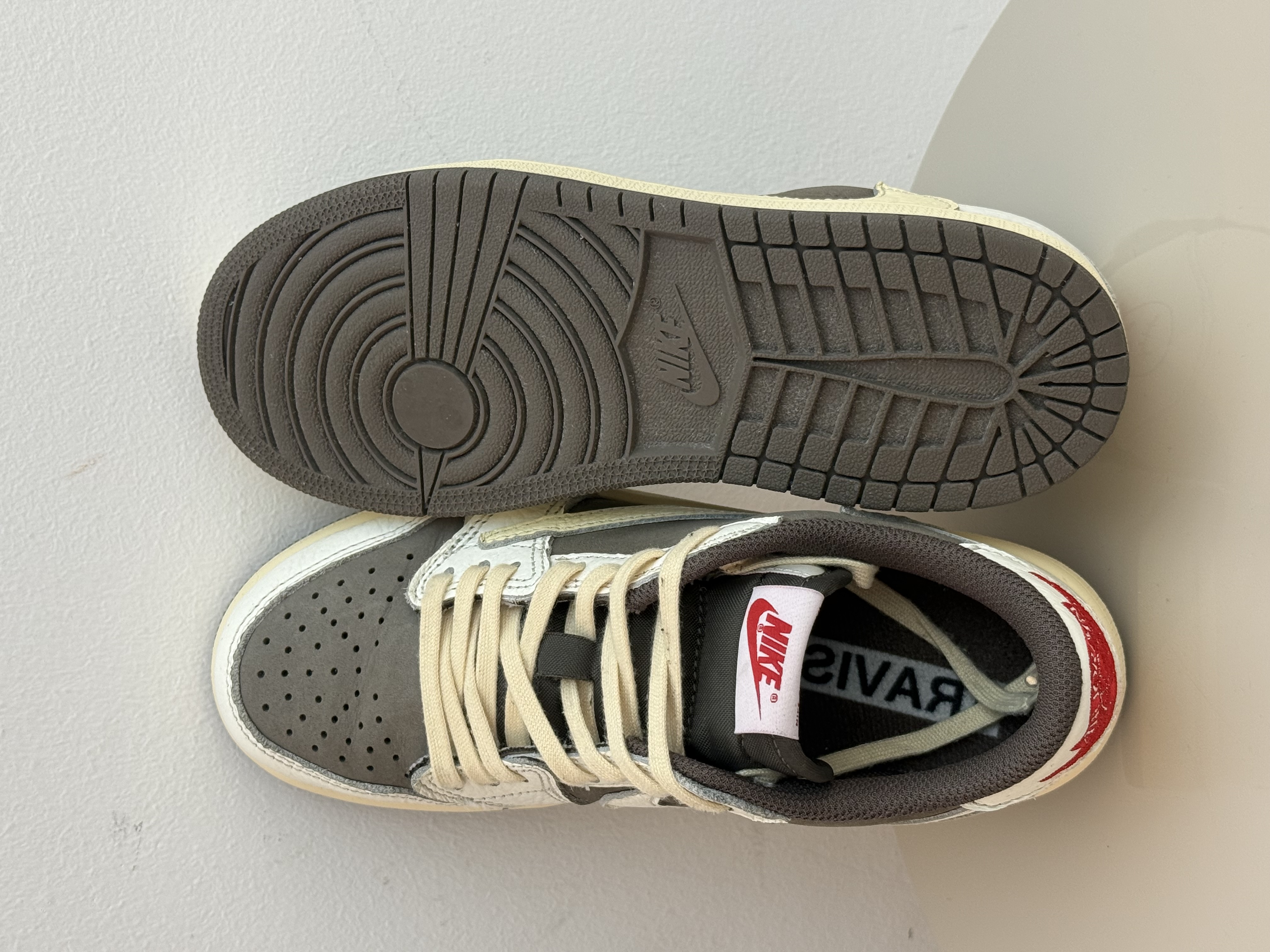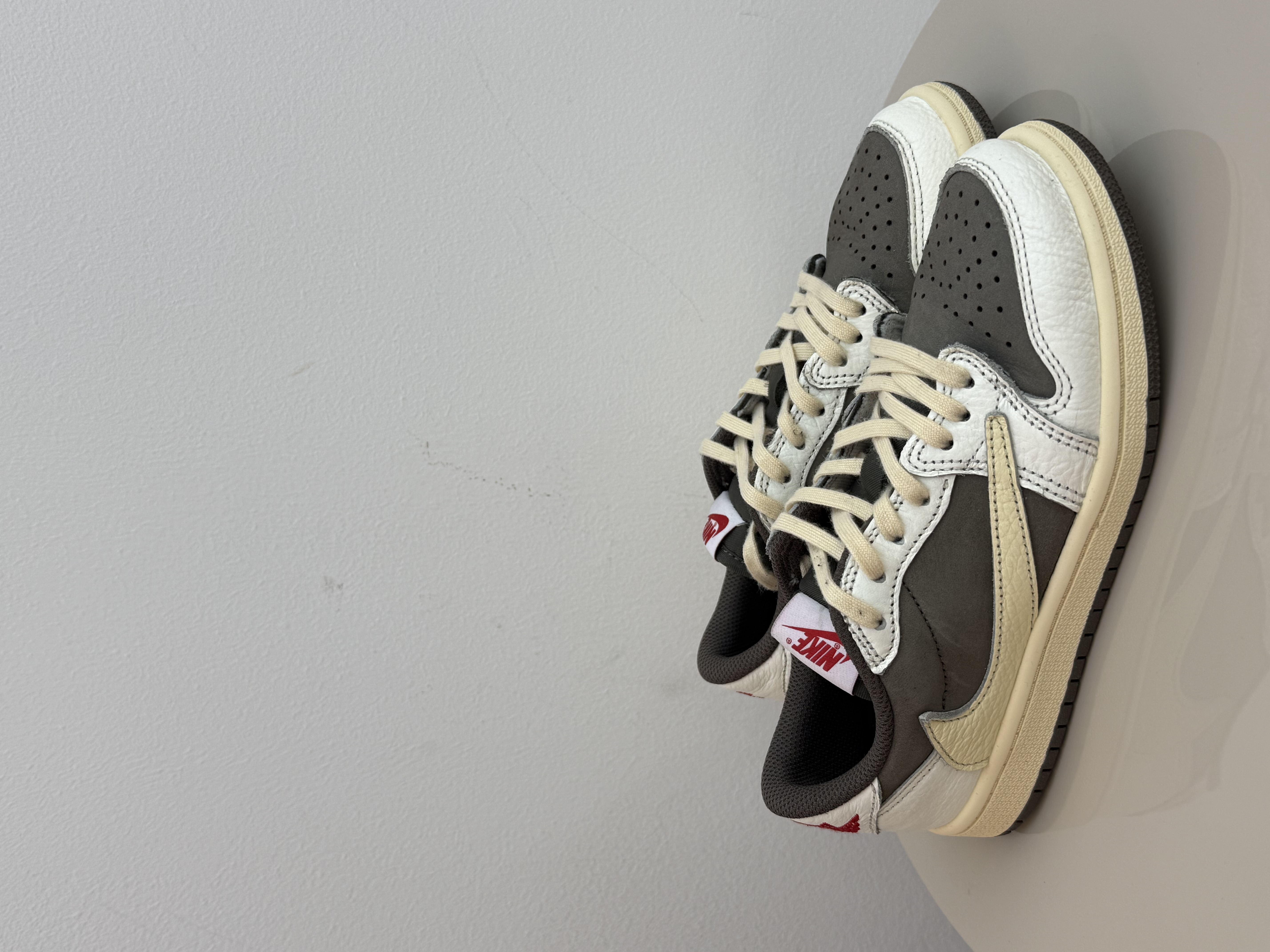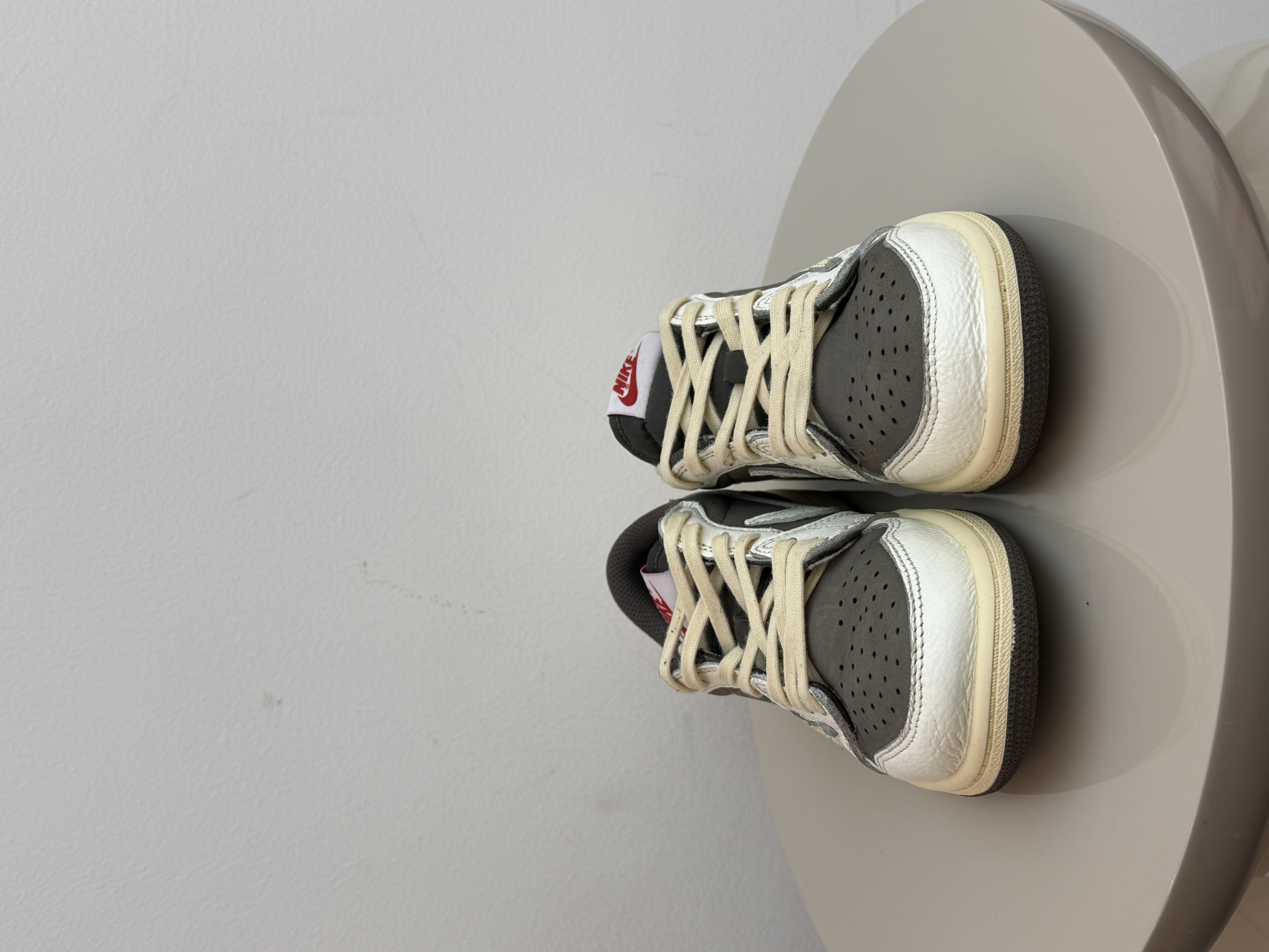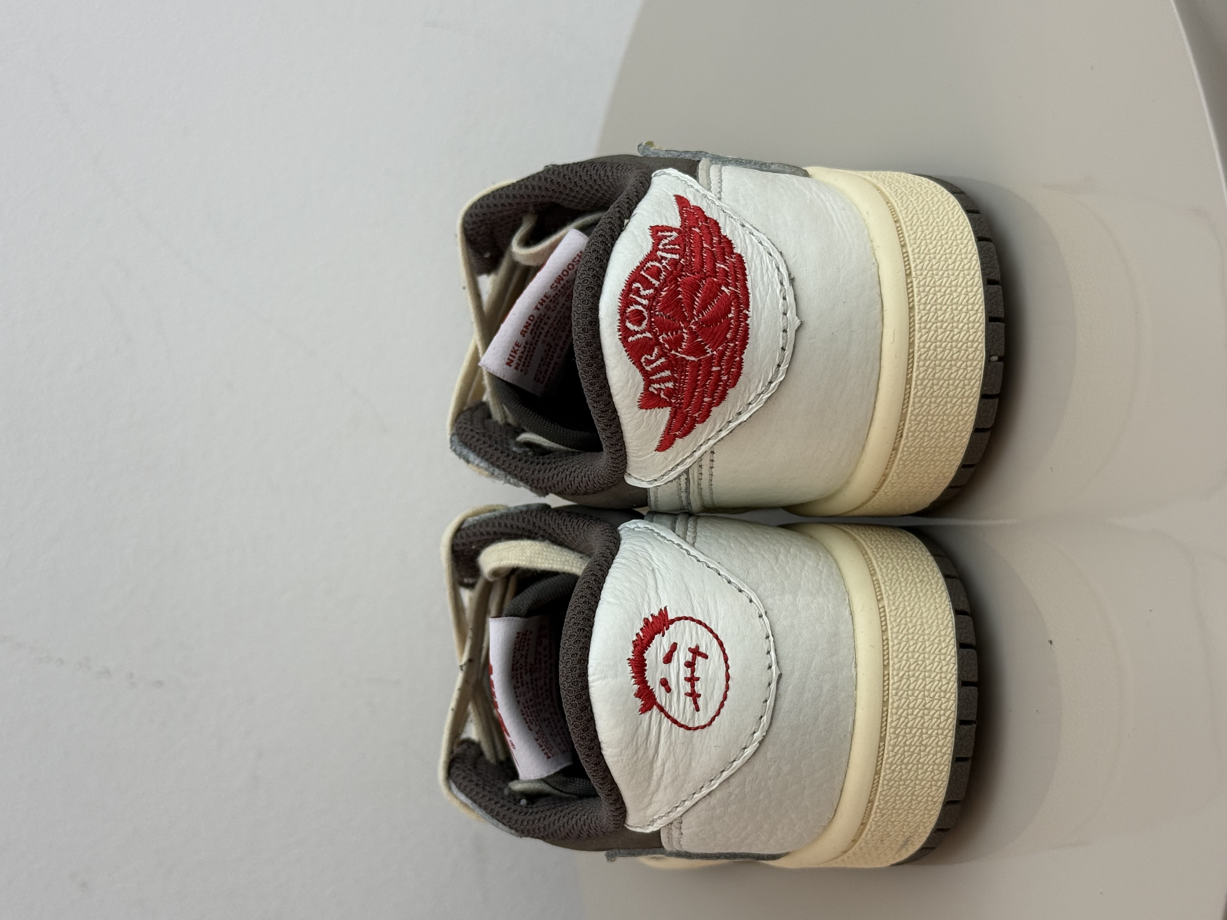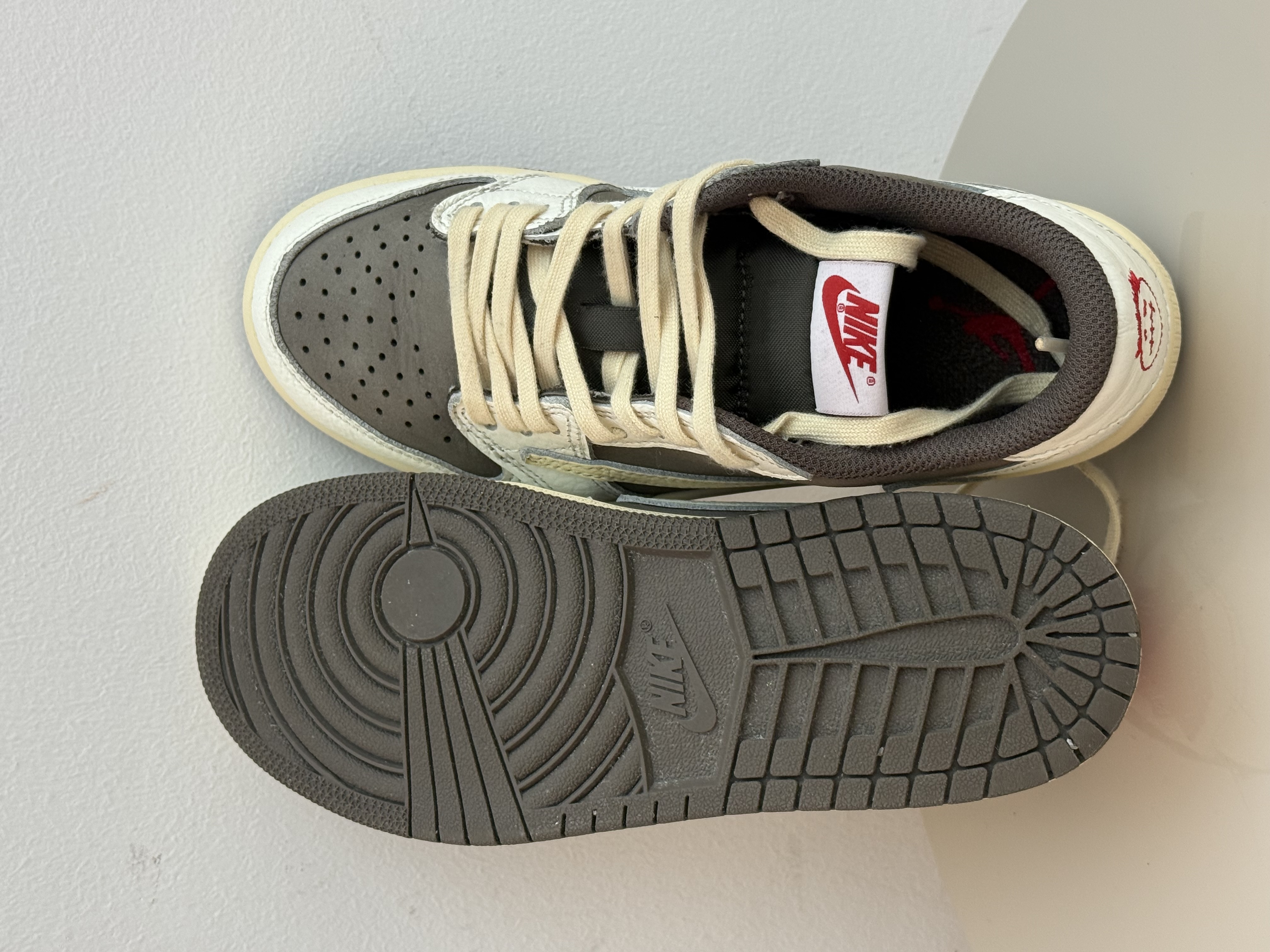 The Kids Air Jordan 1 Low Travis Scott Reverse Mocha displays a subtle mocha and off-white palette. The upper features a mocha suede base, white leather overlays, and signature Travis Scott reverse Swooshes. Details of red on the Wings logo and tongue label paired with a yellow aged sole completes the design.