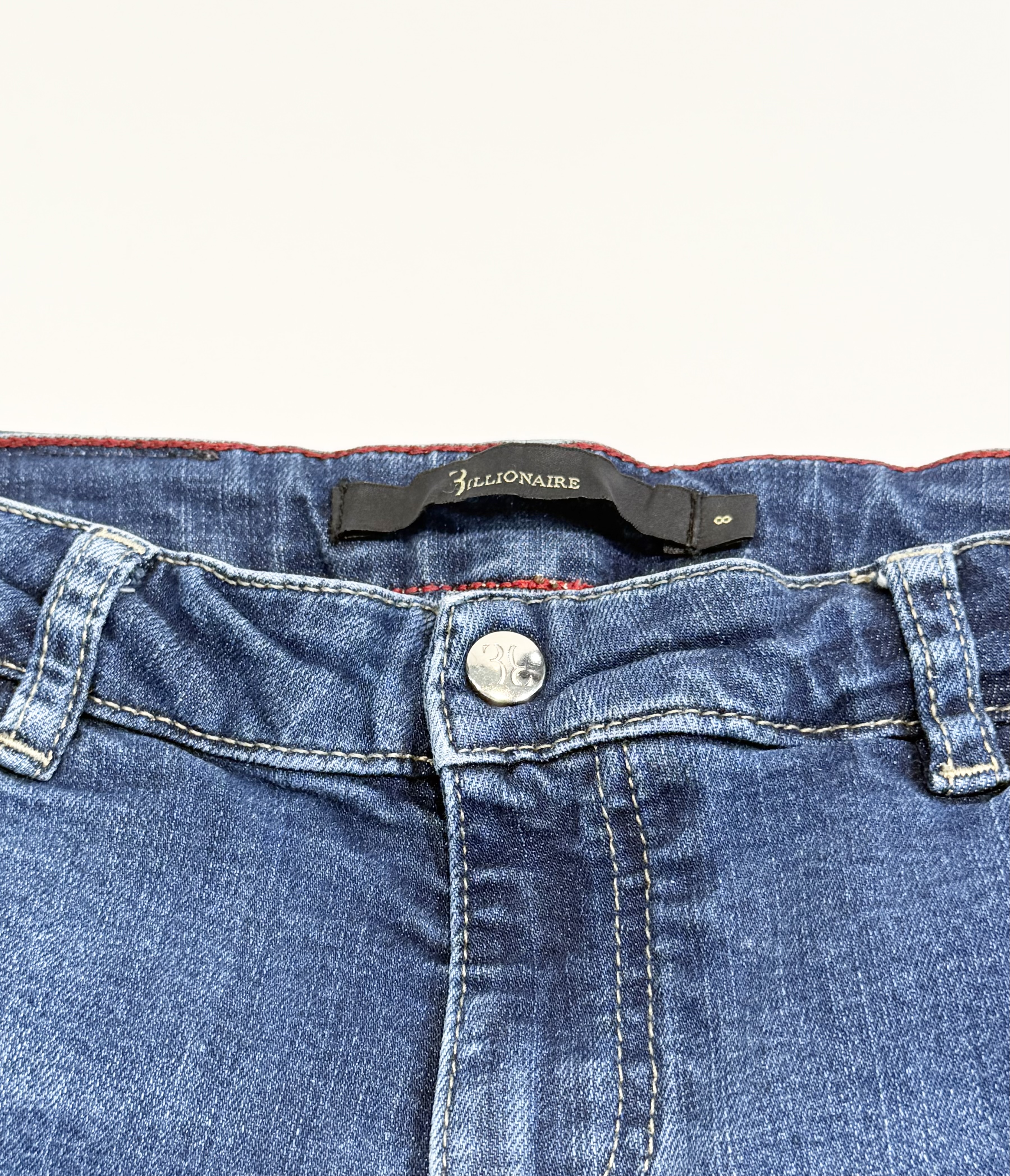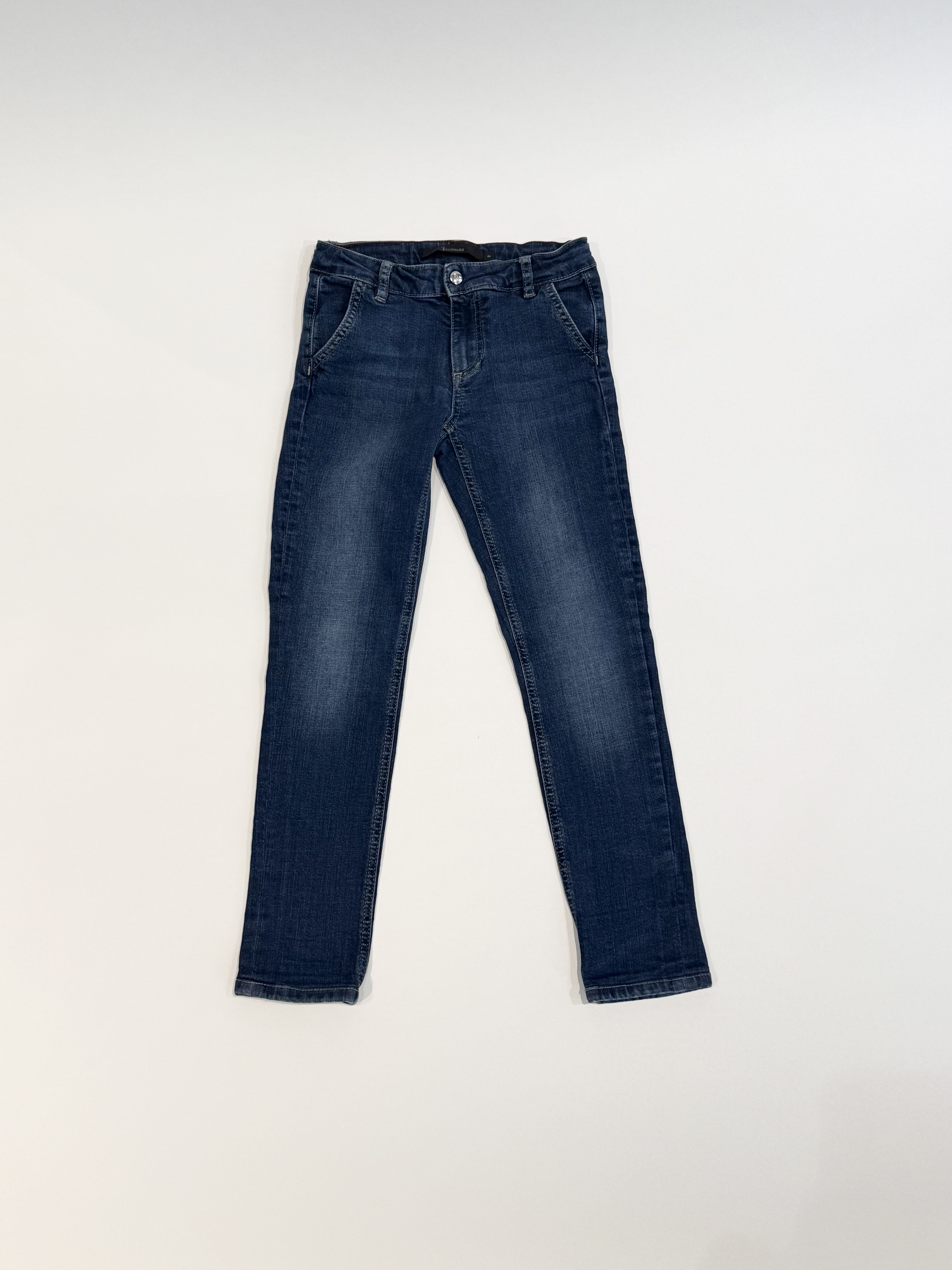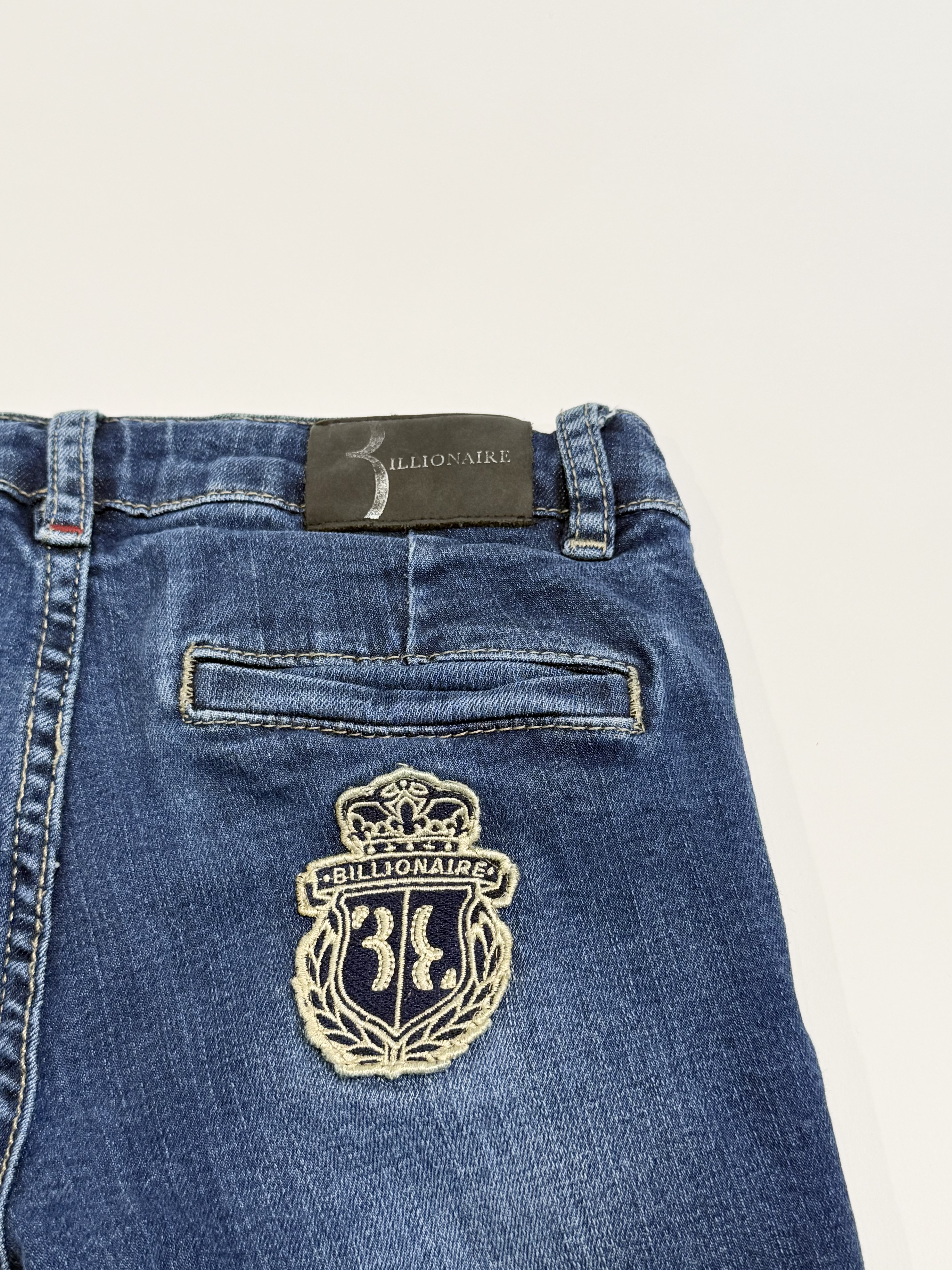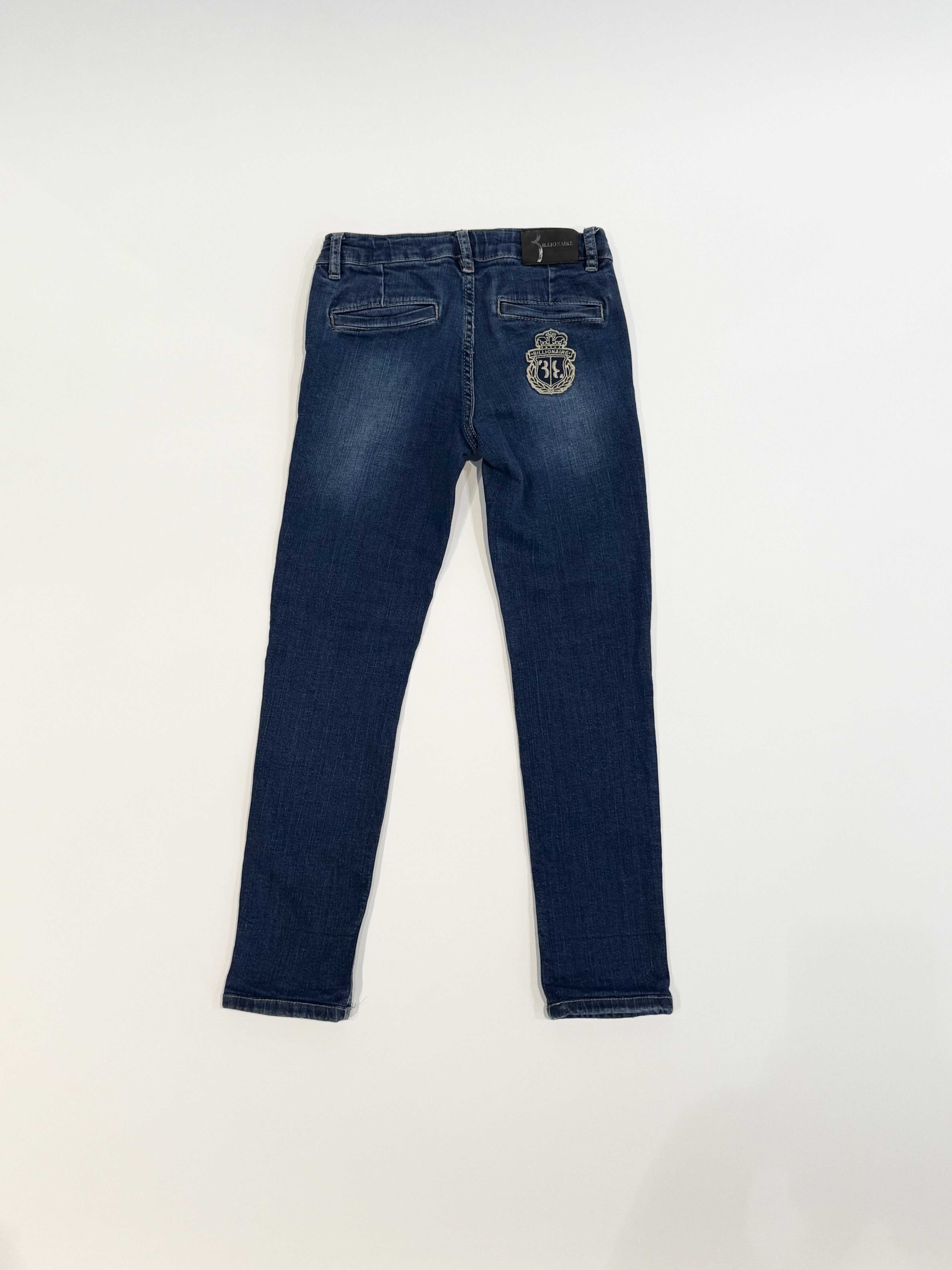 These Crest Denim Trousers by Billionaire Kids combine premium craftsmanship with playful elegance. Crafted from stone-washed denim with a hint of stretch (98% cotton, 2% elastane), they offer both comfort and durability for spirited youngsters. Featuring a classic fit, these trousers include four pockets (two at the front, two slit pockets at the back), along with a signature embroidered crest patch beneath the right rear pocket. Finished with a metal button closure at the waist, these trousers blend refined luxury with playful ease - ideal for any youngster aged around 8 years who appreciates both high-end design and everyday wearability