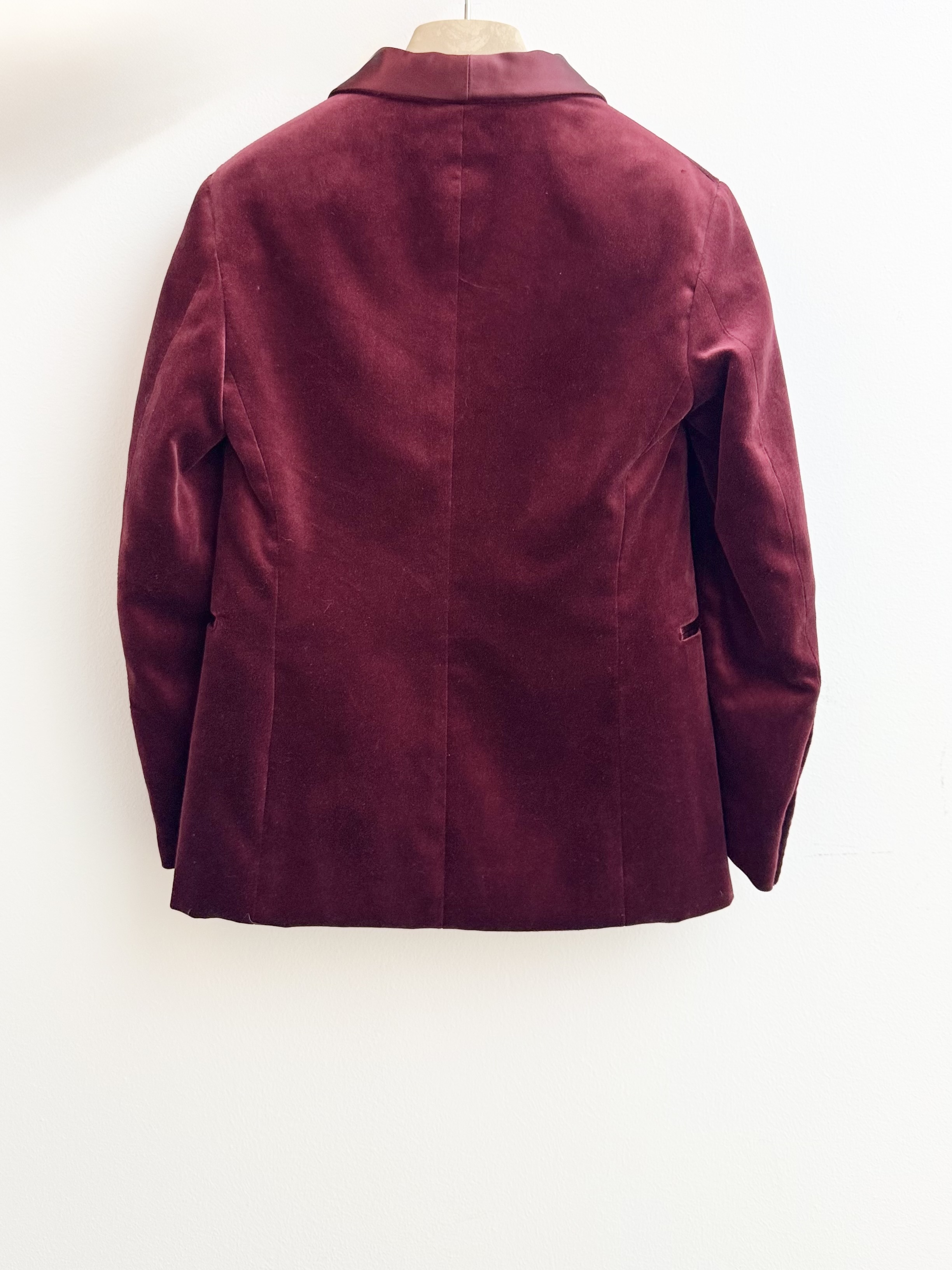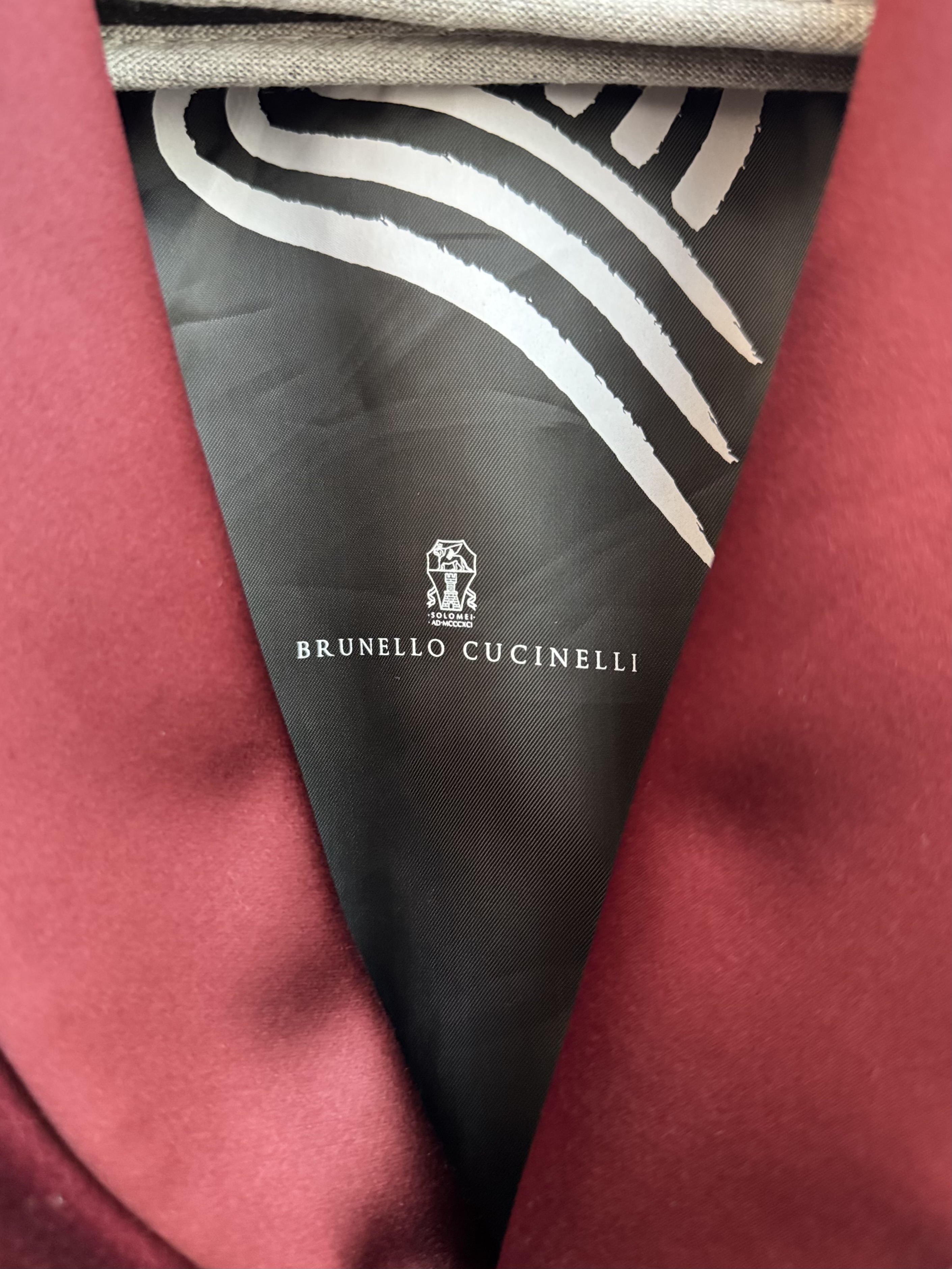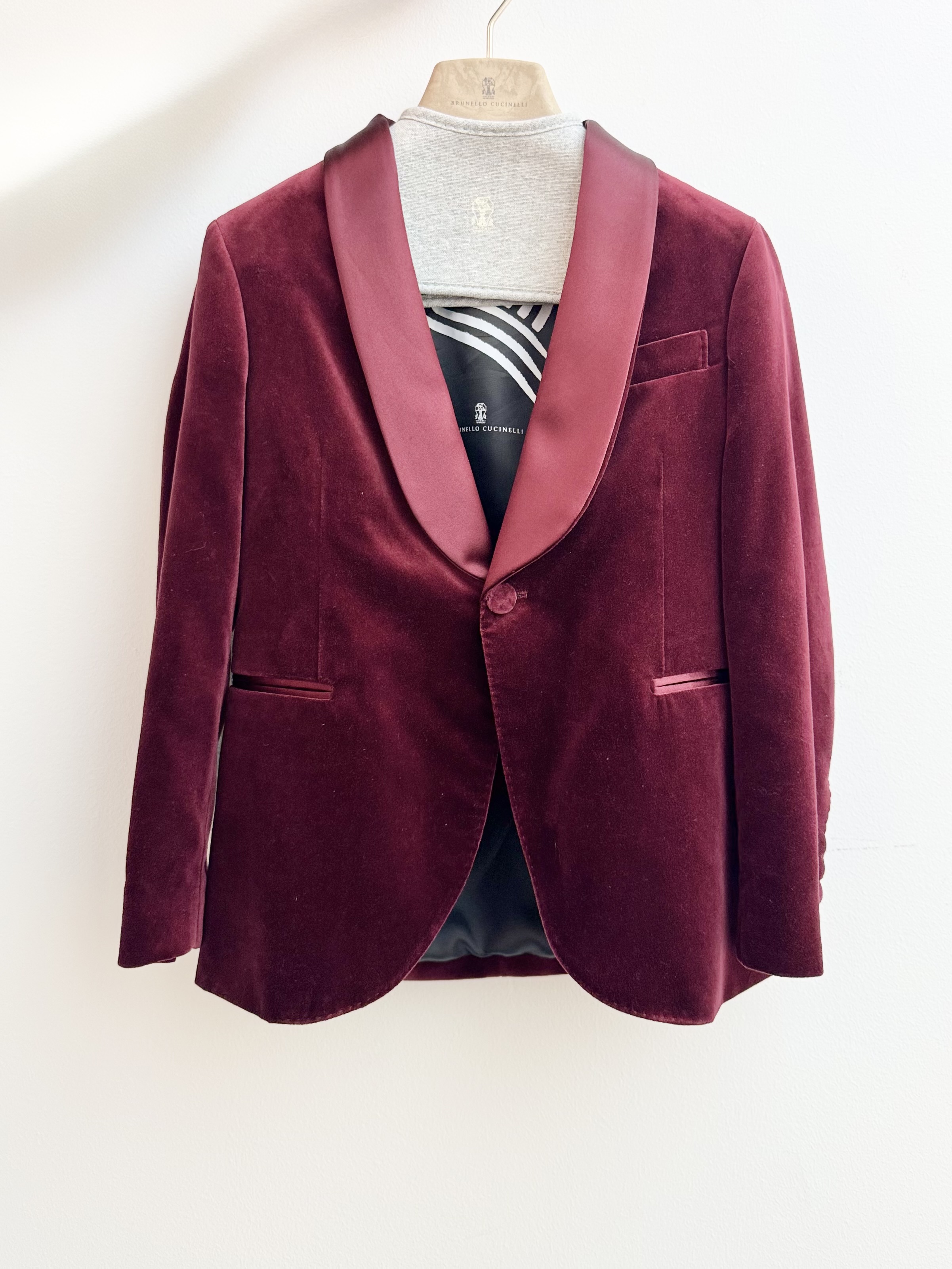 This Brunello Cucinelli Kids Shawl-lapel Tuxedo Blazer is crafted in Italy in a rich bordeaux hue for an elegant, refined look. The single-breasted design features a smooth shawl lapel, button fastening, welt pocket, and buttoned cuffs for classic tailoring. Made from a luxurious blend of 62% cotton and 38% silk, it offers both comfort and sophistication for special occasions.