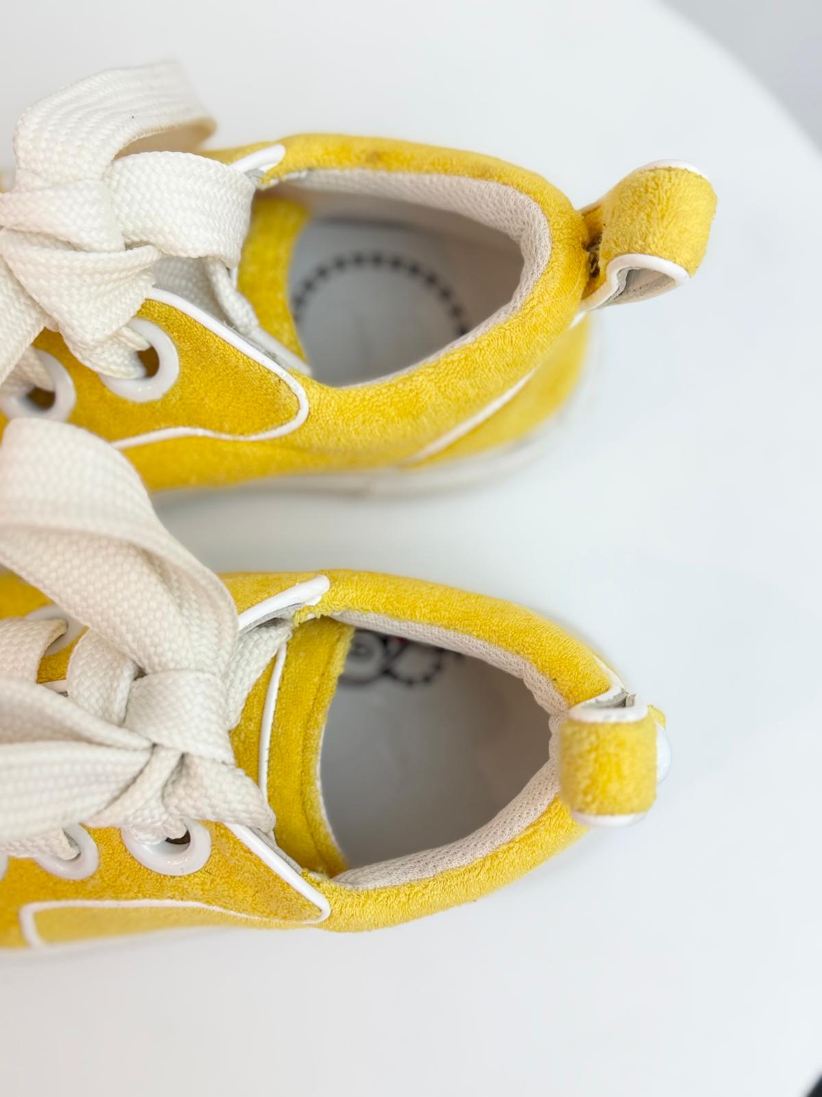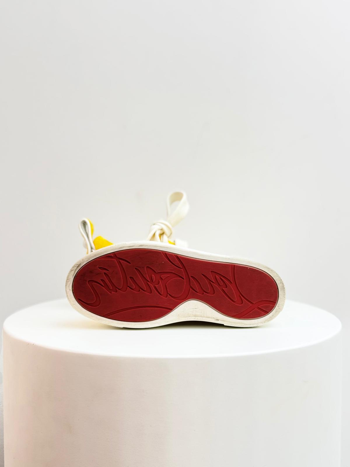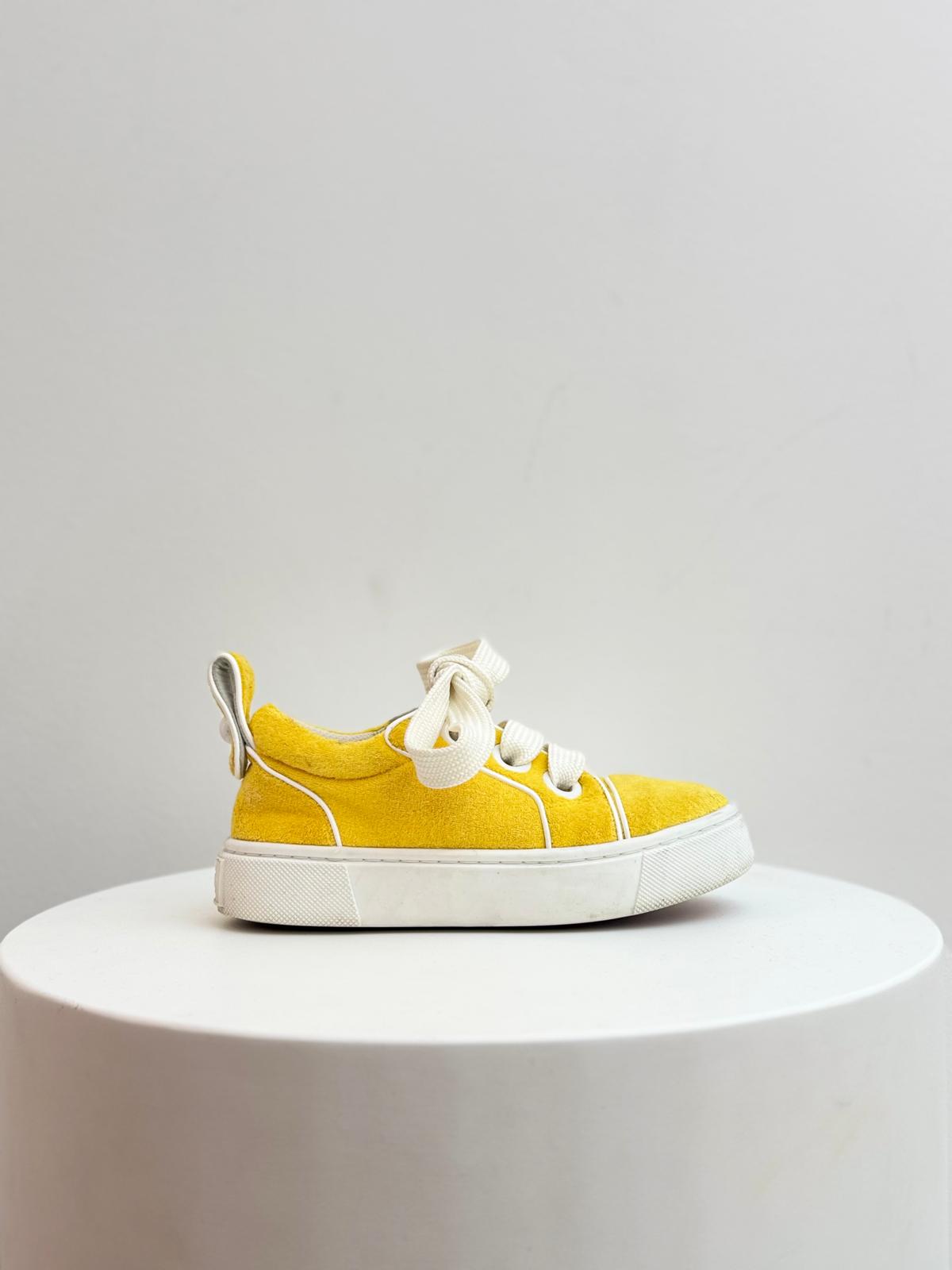 Brighten up your little one's wardrobe with these Christian Louboutin Kids Toy Sneakers, a playful yet luxurious choice for everyday comfort. Expertly made in Spain, these vibrant yellow sneakers feature a plush terry cloth upper accented with premium leather trim and a classic round-toe silhouette. Designed for active days, they offer a secure lace-up closure and a durable rubber sole for traction, while the soft fabric lining and high-quality leather insole ensure all-day support. Combining the brand's iconic European craftsmanship with a cheerful, kid-friendly aesthetic, these sneakers are the perfect statement piece for any stylish junior collection.