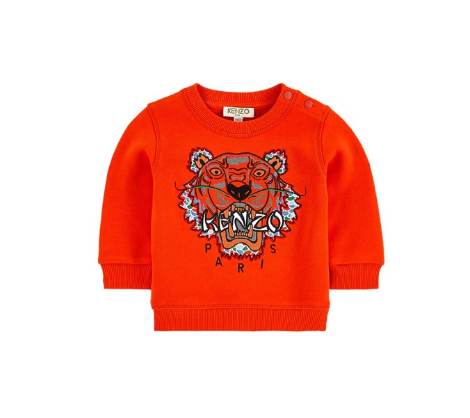 The Kenzo Tiger Baby Sweatshirt in Orange is a vibrant and stylish piece designed for little ones. Made from soft, mid-weight cotton jersey, this sweatshirt features the iconic Kenzo Tiger and logo embroidered prominently on the front, making it instantly recognizable and playful. The cheerful orange hue adds a fun pop of color to any outfit, while the quality construction ensures comfort and durability for everyday wear. Perfect for babies, this sweatshirt effortlessly combines designer flair with practical warmth for cooler days.