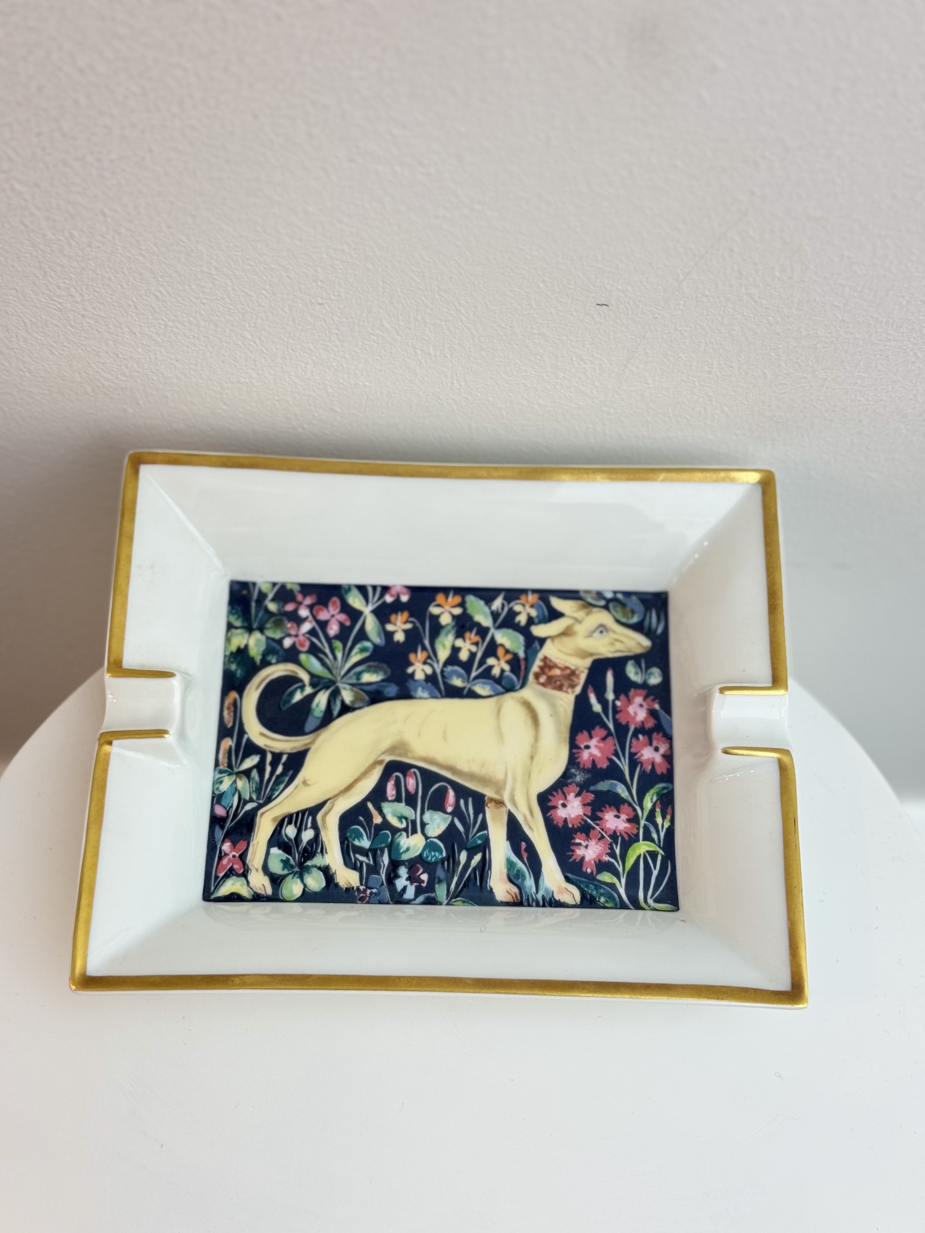 A charming expression of Hermès artistry, the Dogflower porcelain ashtray features a whimsical yet refined motif rendered in vibrant detail. Crafted from fine porcelain with the Maison’s signature precision, it balances playful design with timeless elegance. A collectible decorative accent, it brings distinctive character and French sophistication to any interior.