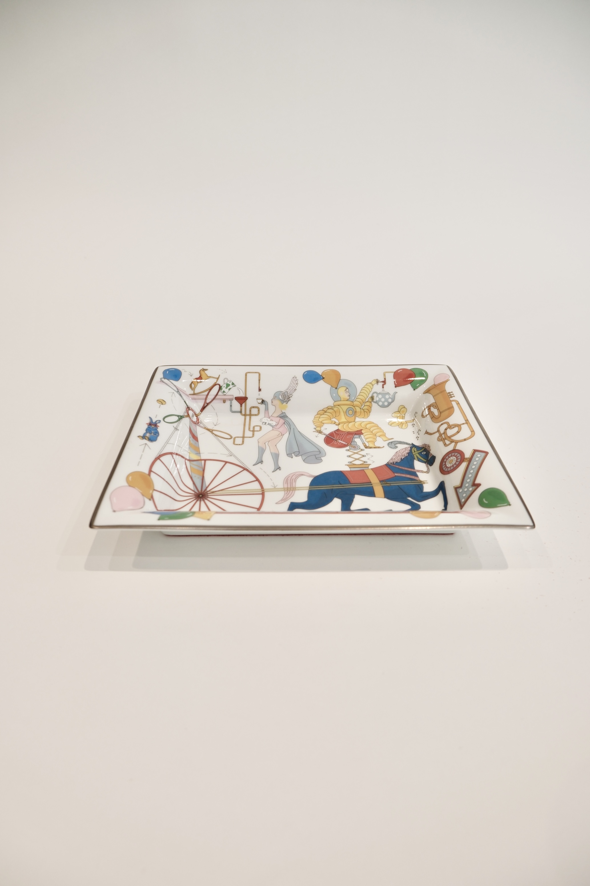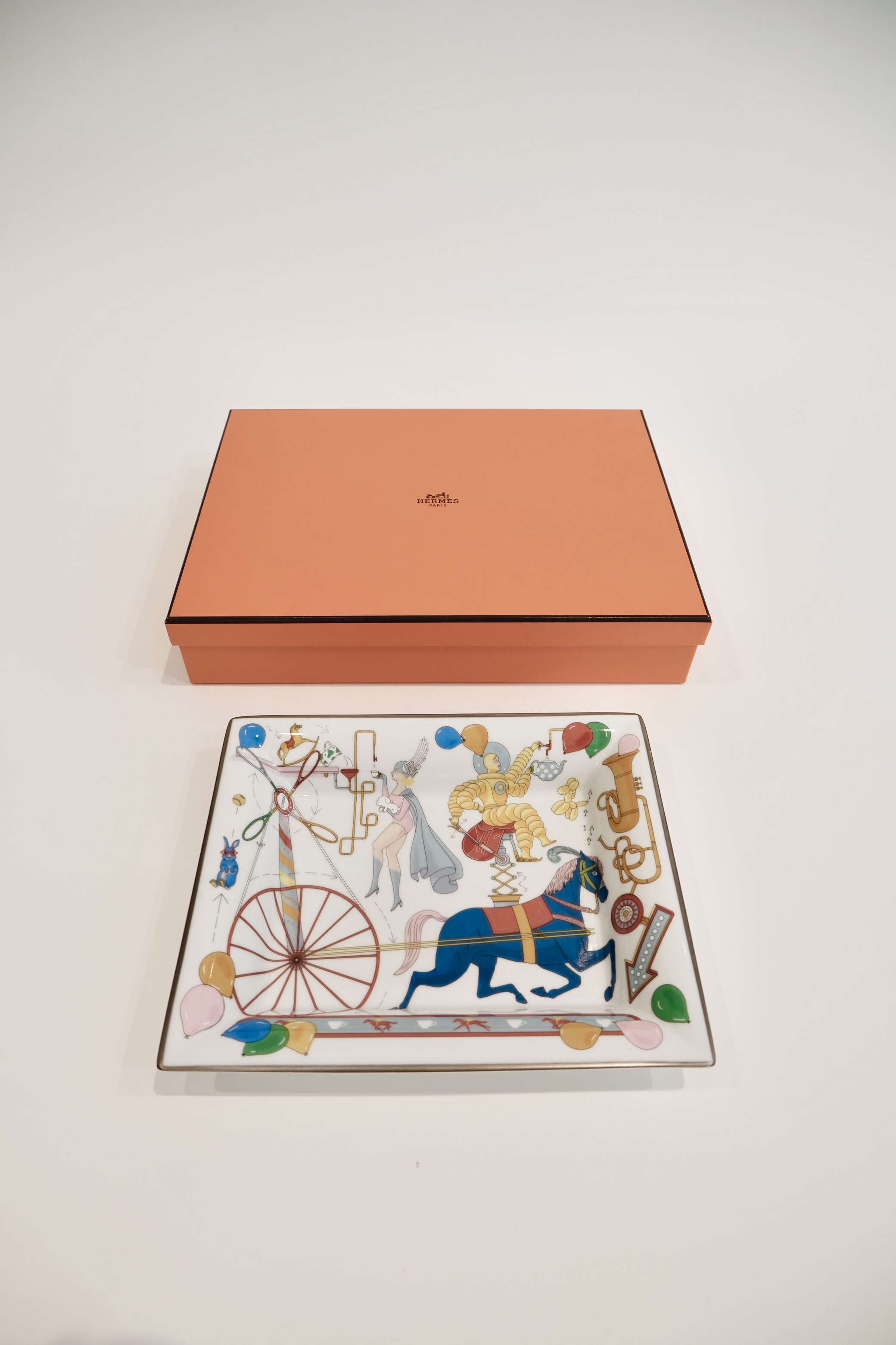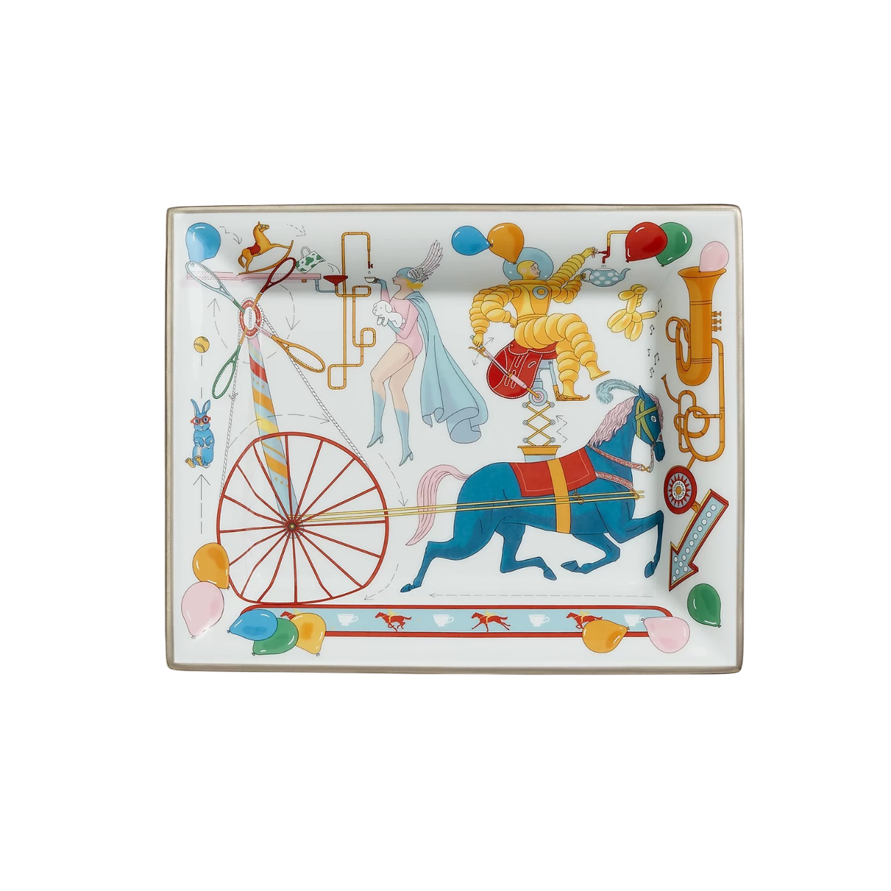 This Hermès Tea for Two Change Tray features a vibrant and whimsical circus-themed design, created by illustrator Jonathan Burton. The artwork is brought to life using a hand-applied printing technique, showcasing detailed and playful imagery in rich, colorful tones. Made from fine porcelain, this decorative tray blends artistic charm with refined craftsmanship, making it a standout piece for any interior.