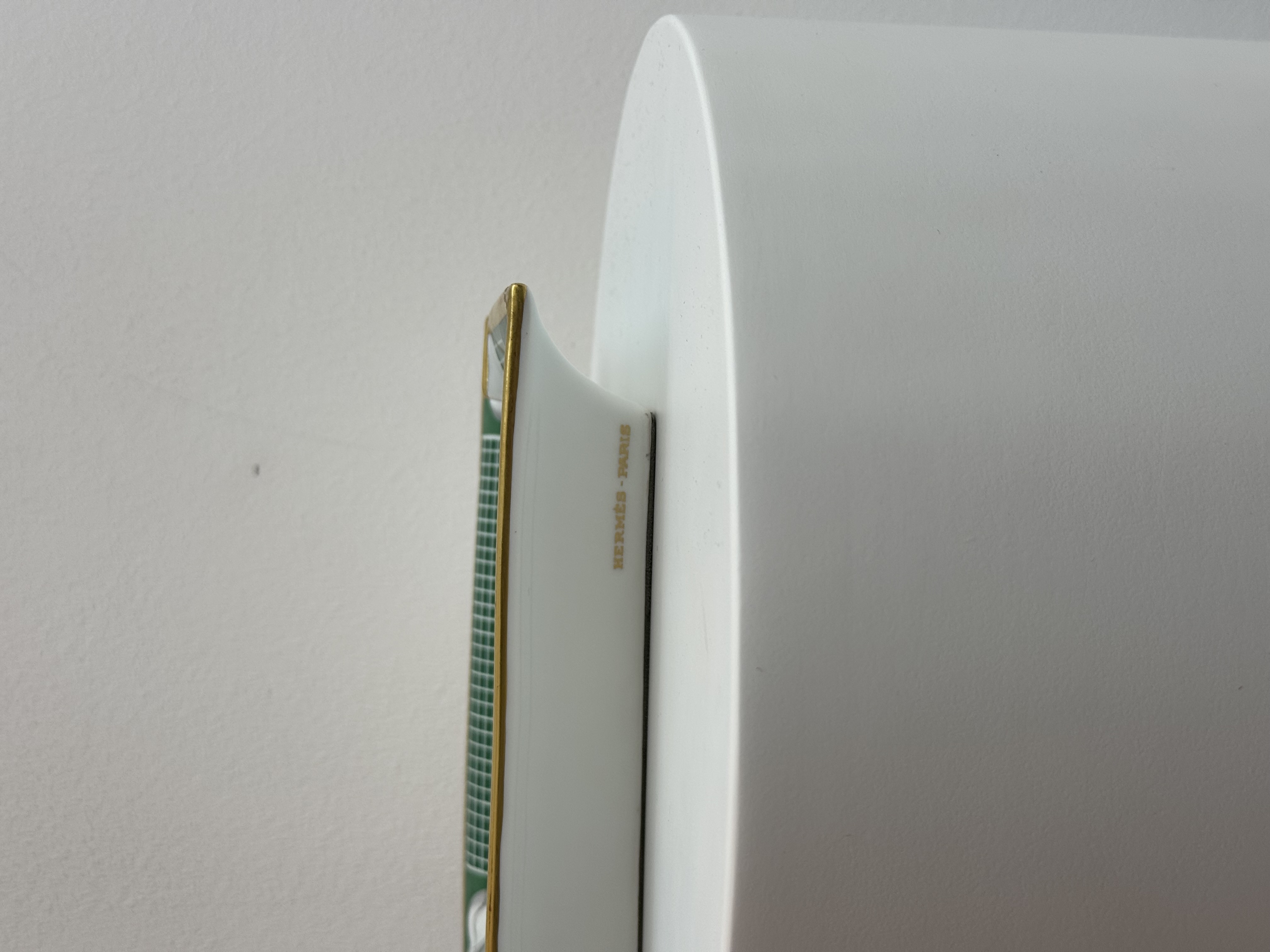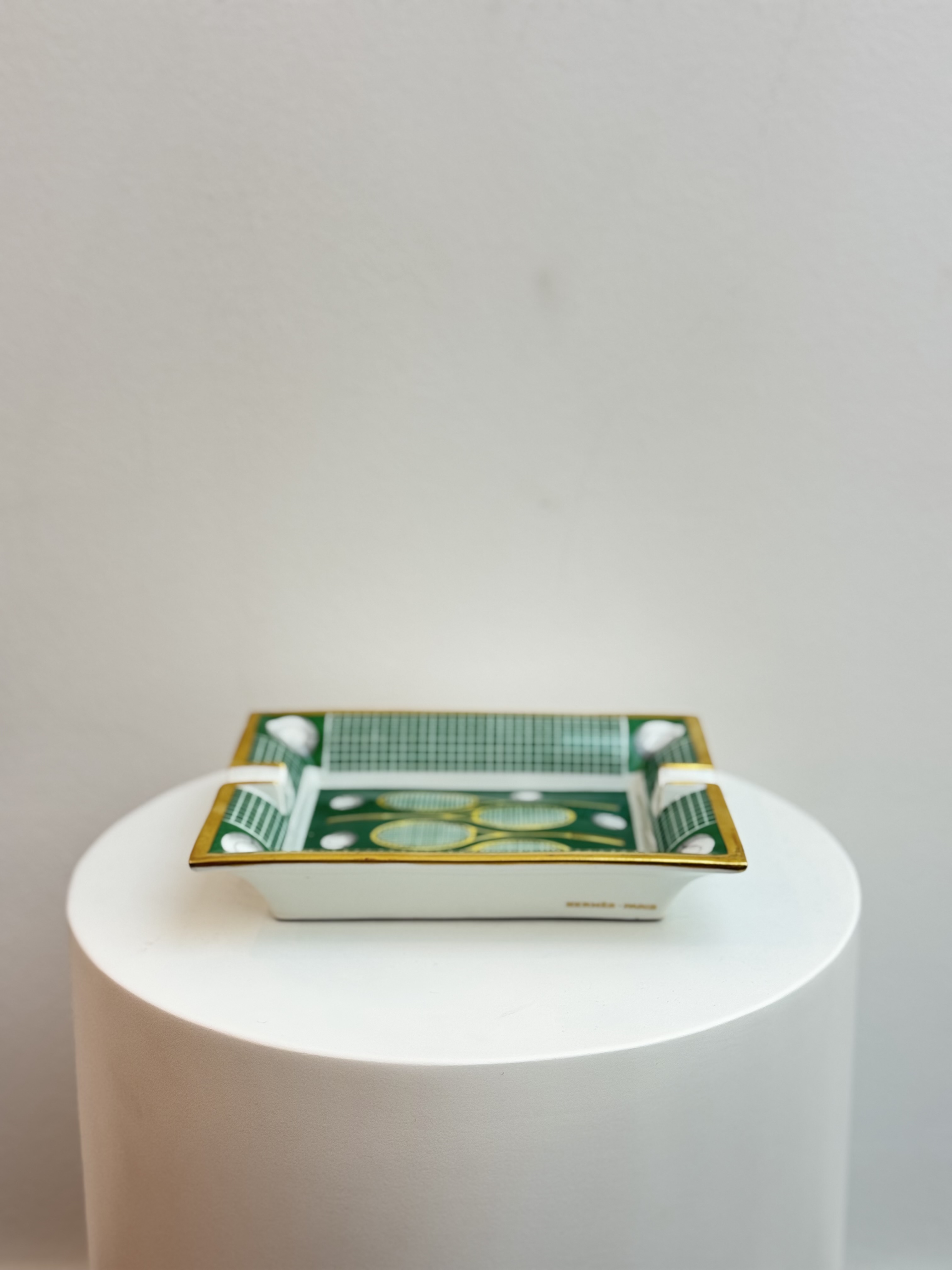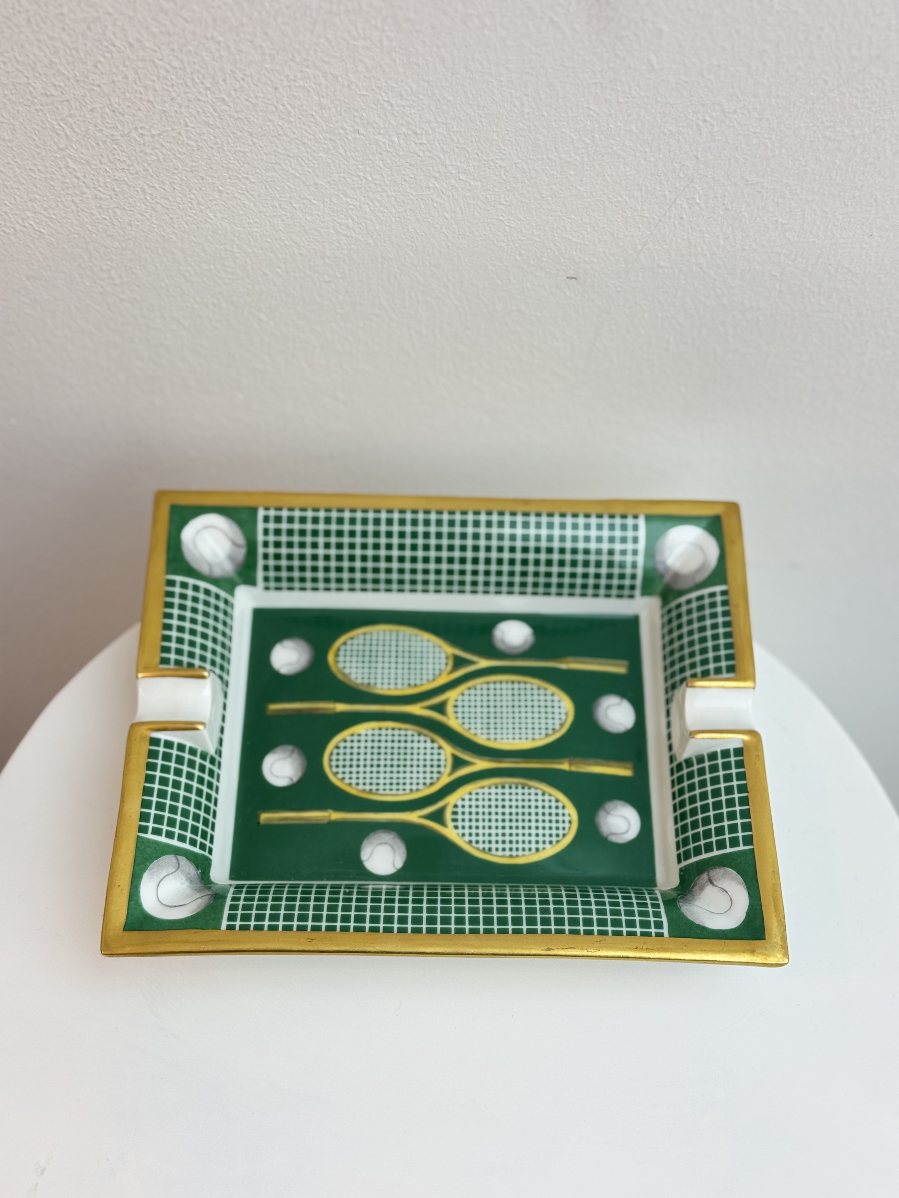 Crafted from fine porcelain, this Hermès ashtray features the Maison’s iconic tennis-inspired motif in a rich green palette. Impeccably finished with Hermès’ signature artistry and attention to detail, it blends refined functionality with decorative elegance. A sophisticated accent for the home or desk, it reflects timeless French craftsmanship and collectible appeal.