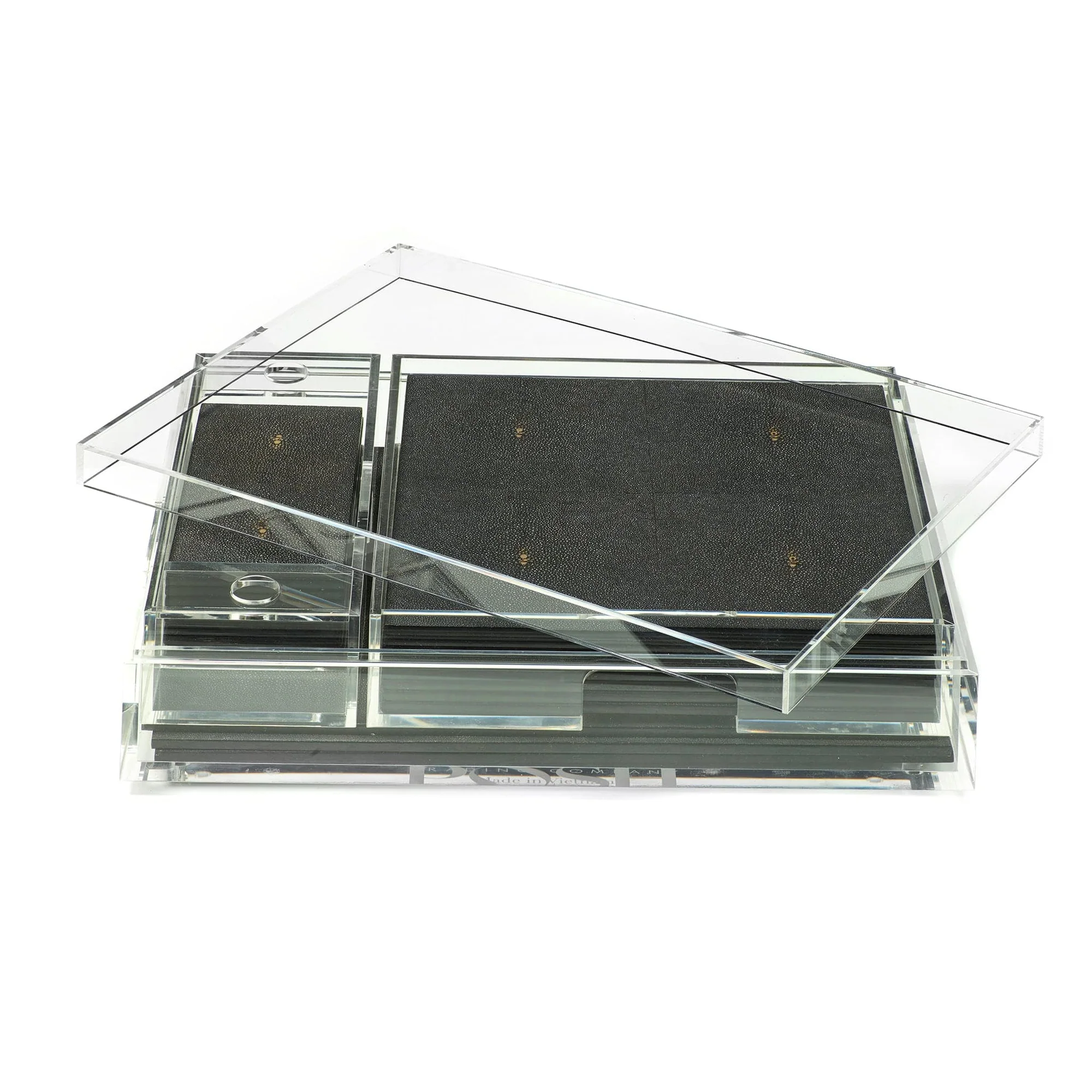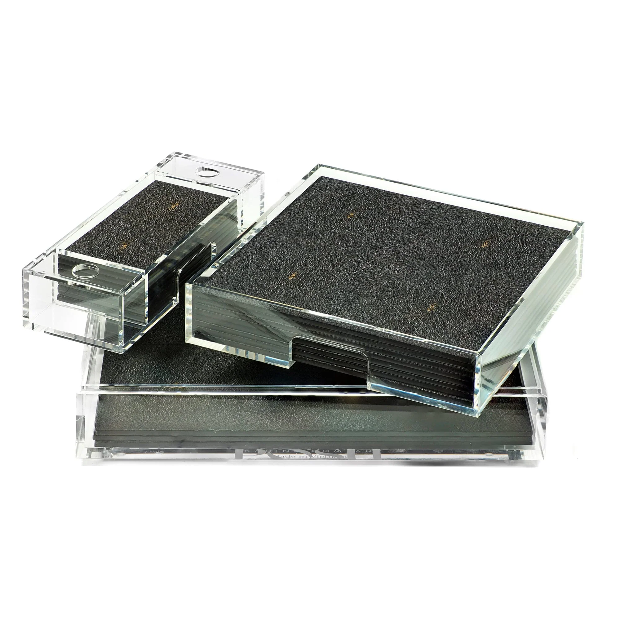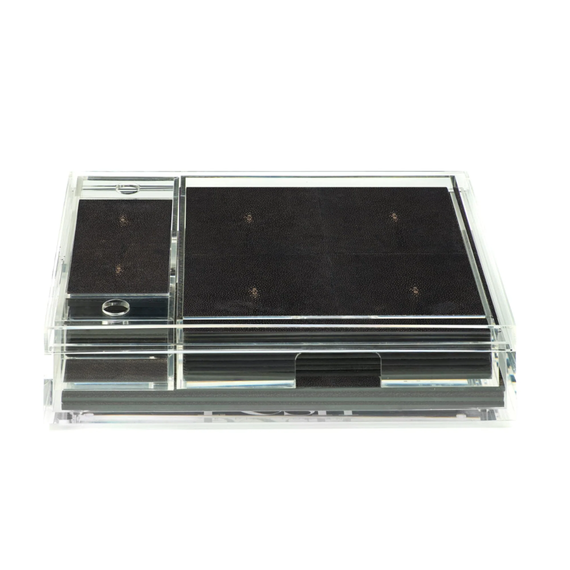 Complement your dining table with the stylish acrylic Matbox in Faux Shagreen Chocolate, a fabulous rich shade of the deepest brown mixed with complementary sub-shades complete with a sophisticated textured finish. The Matbox is a trademarked unique product, available in a choice of silver or gold leaf lacquered boxes handcrafted by local artisans or alternatively for a more contemporary approach with crystal clear boxes made from precision cut acrylic. This exquisite set consists of two serving mats, eight placemats and eight double coasters designed to accommodate wine and water glasses at the same time.