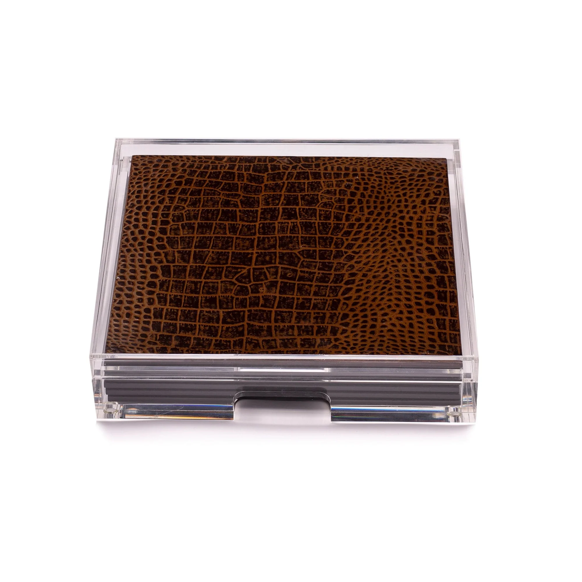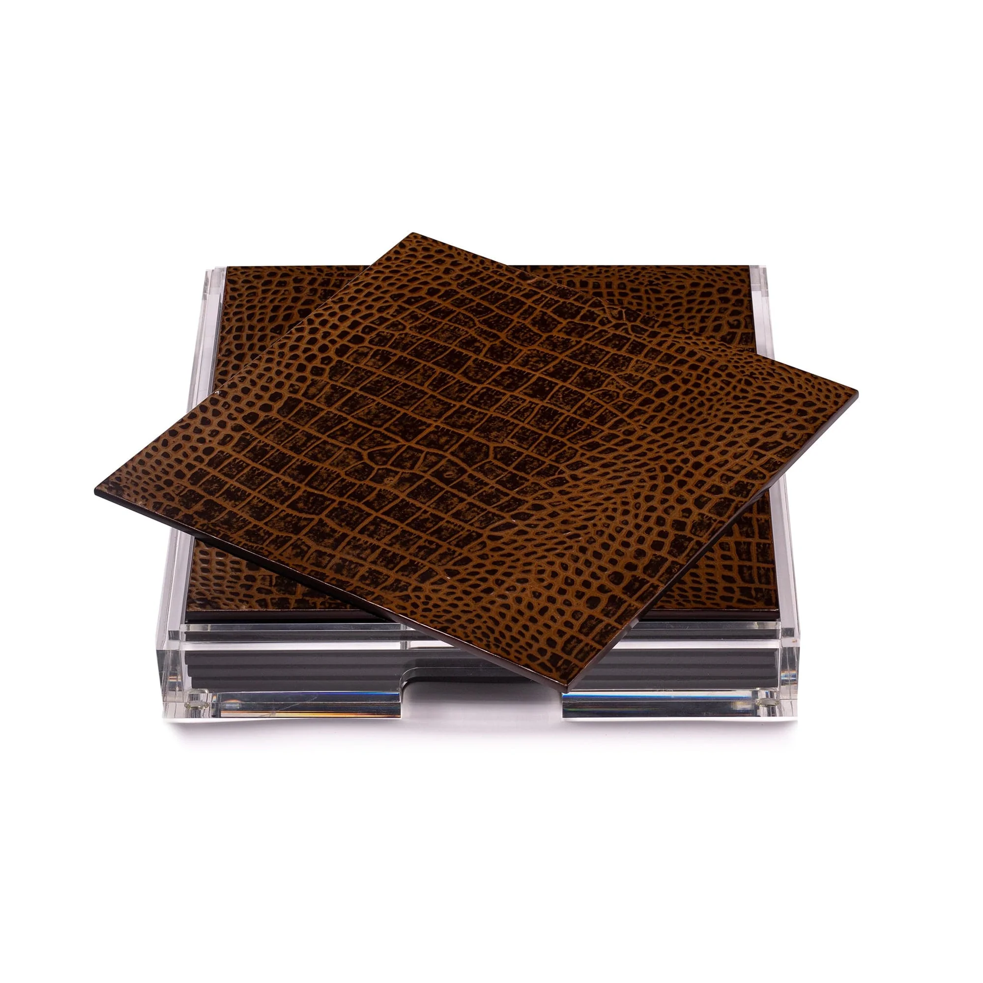 The Acrylic Placebox in Vintage Croc a unique collection of placemats for a table setting of six. Handcrafted by artisans, the placemats are made from genuine silver leaf. Artisans apply each leaf by hand with eleven layers of special clear matte lacquer applied subsequently these are then hand polished between every layer to a chic matte end-finish. The placemats are housed in a sturdy clear display box, made of the highest grade of acrylic, the whole unit itself making a statement design piece.