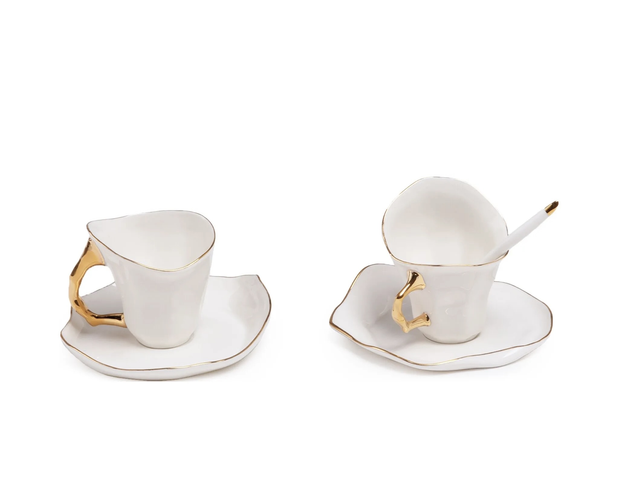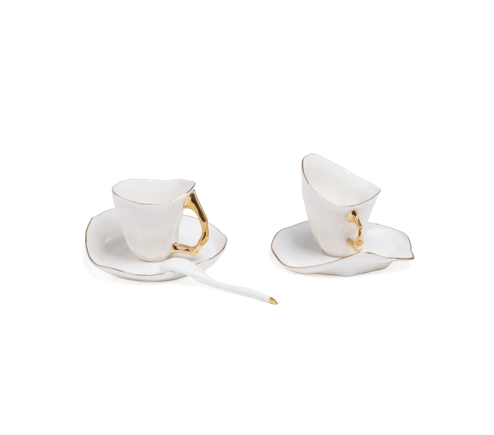 The Seletti Meltdown coffee cups are a playful and artistic take on traditional porcelain drinkware. Designed to appear as though they are melting or distorted by heat, each cup features fluid, irregular shapes that challenge conventional symmetry. Finished with elegant gold handles and delicate gold trim, these cups blend surreal design with luxury. Perfect for those who appreciate bold, conversation-starting pieces in their kitchen or dining collection.
