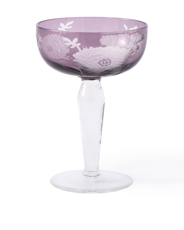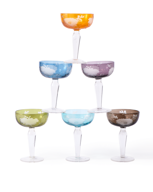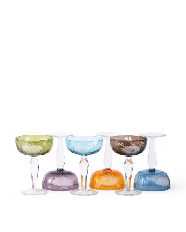 Multicolour Peony Coupe Glasses (set of 6) are made from full coloured glass and feature a sandblasted pattern. Perfect for weddings, events or entertaining guests.