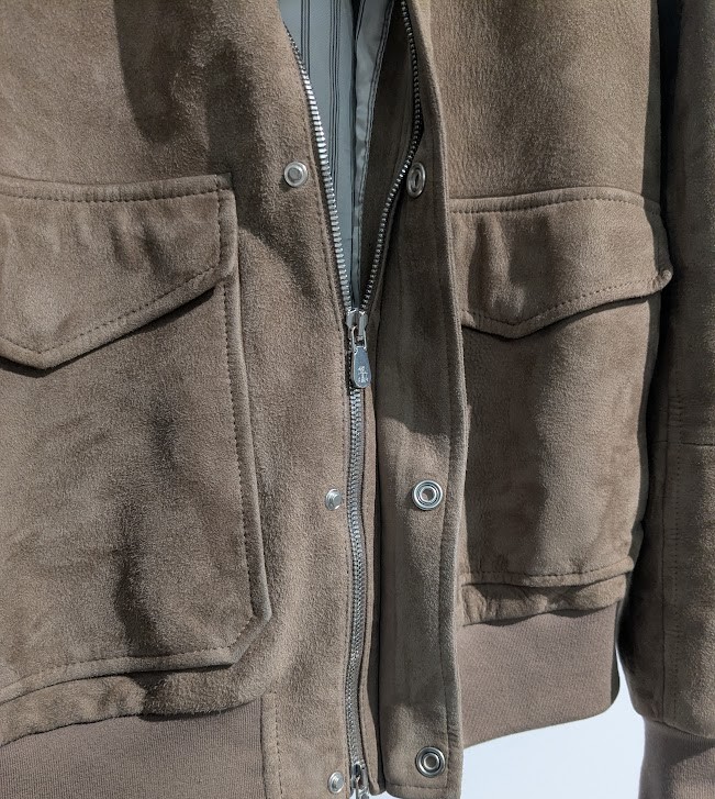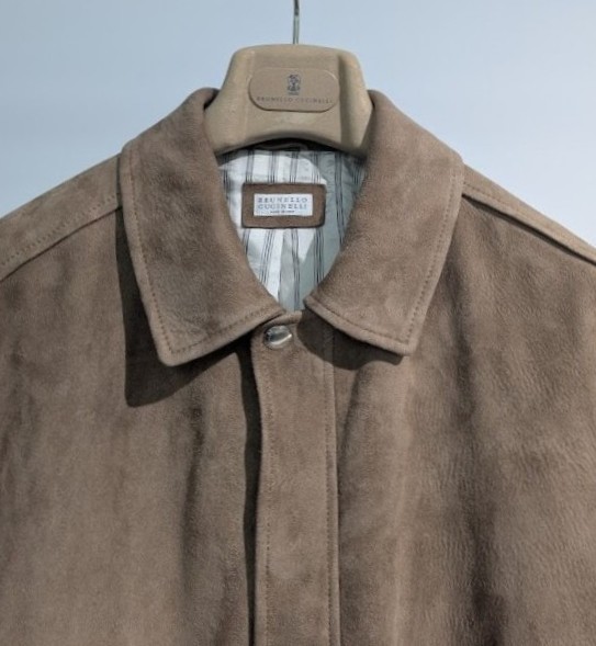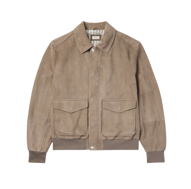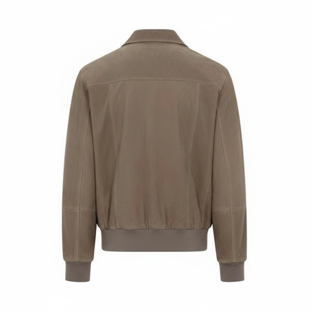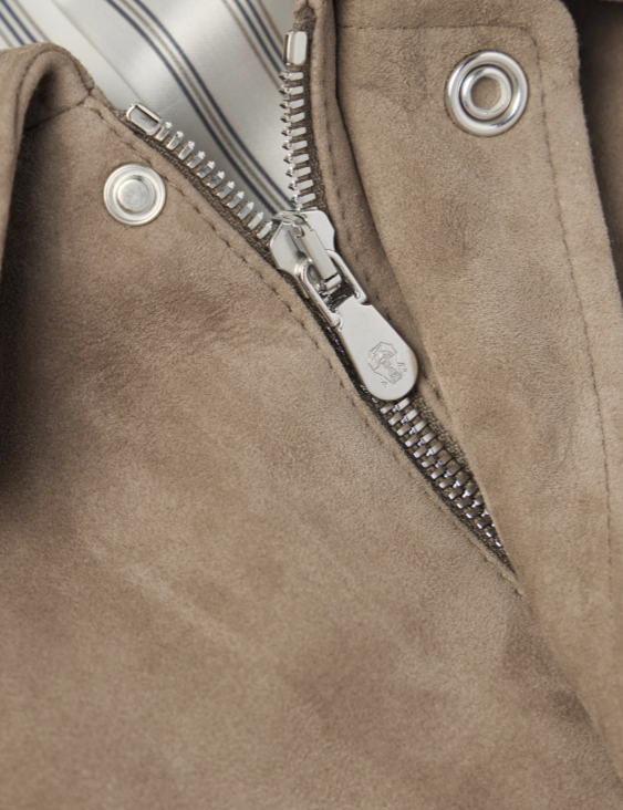 Experience timeless elegance with the Brunello Cucinelli Brown Leather Bomber Jacket, expertly crafted from supple light brown suede leather. This luxurious piece features a pointed toe design, concealed snap button and zip fastening, and practical flap pockets on the front for added style and functionality. The jacket is detailed with a back yoke, long sleeves, and comfortable ribbed cuffs and hem, ensuring a perfect fit and enhanced comfort. Fully lined with a sophisticated striped fabric, it offers smooth layering and exceptional wearability. Proudly made in Italy, Brunello Cucinelli honors traditional craftsmanship through its School of Contemporary High Craftsmanship and Arts. This bomber jacket exemplifies their commitment to masterful techniques and premium quality, making it a must-have for the discerning wardrobe.