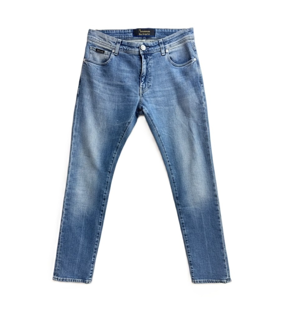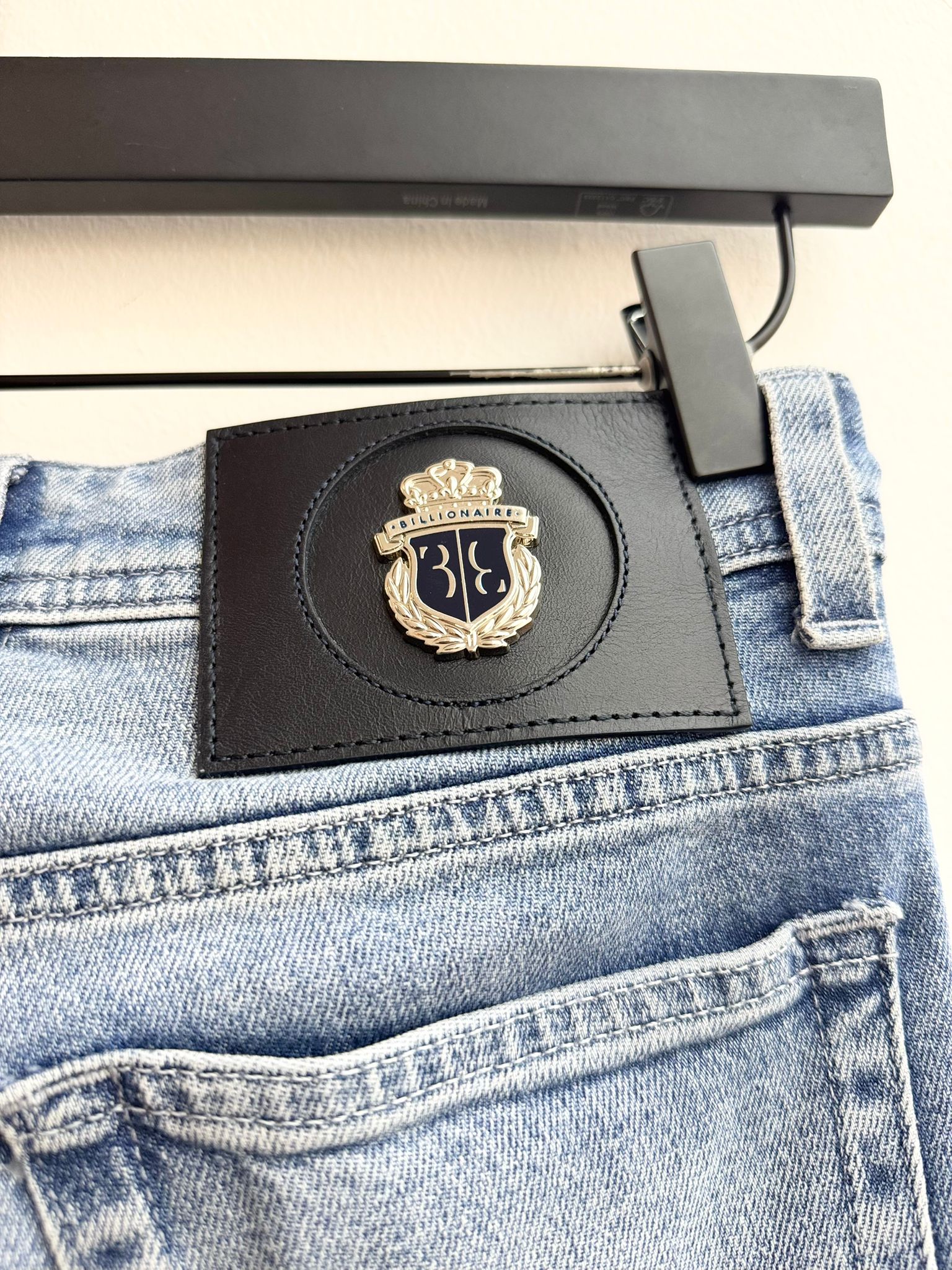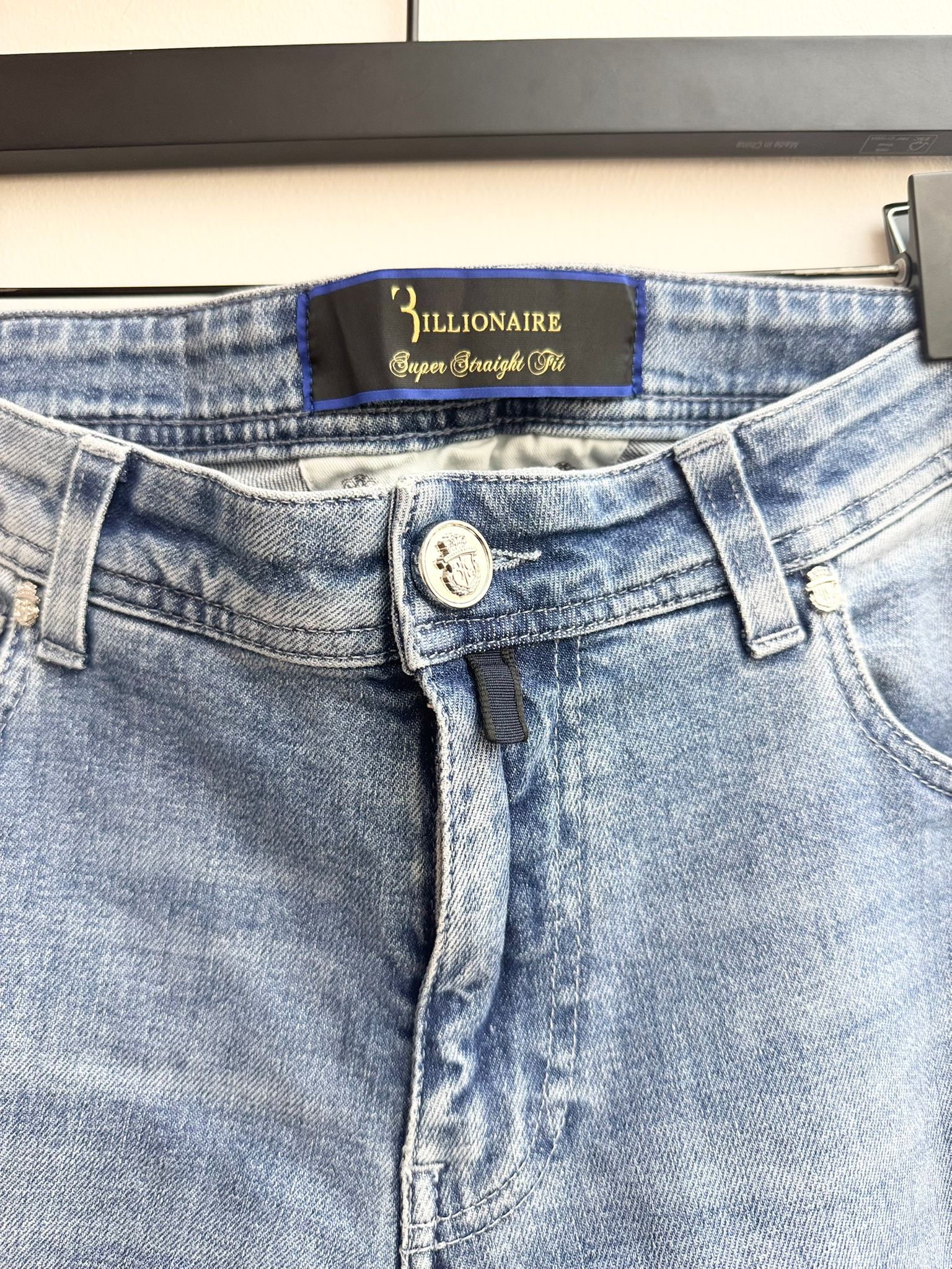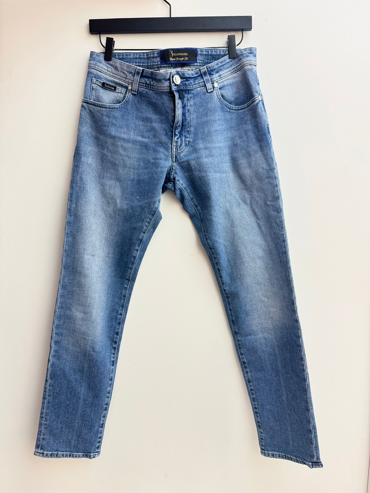 Crafted for a clean and timeless silhouette, the Billionaire Super Straight Cut Denim Trousers offer a sophisticated take on classic everyday luxury. These jeans are presented in a versatile light blue wash with refined fading across the thighs, featuring the brand's signature "Super Straight" fit that balances comfort with a streamlined appearance. Signature craftsmanship is evident in the meticulous stitching and premium hardware, elevated by a striking black leather patch on the rear waistband adorned with a prominent gold-tone Billionaire crest. Designed for the modern wardrobe, these five-pocket denim trousers transition effortlessly from casual daytime wear to more polished evening settings.