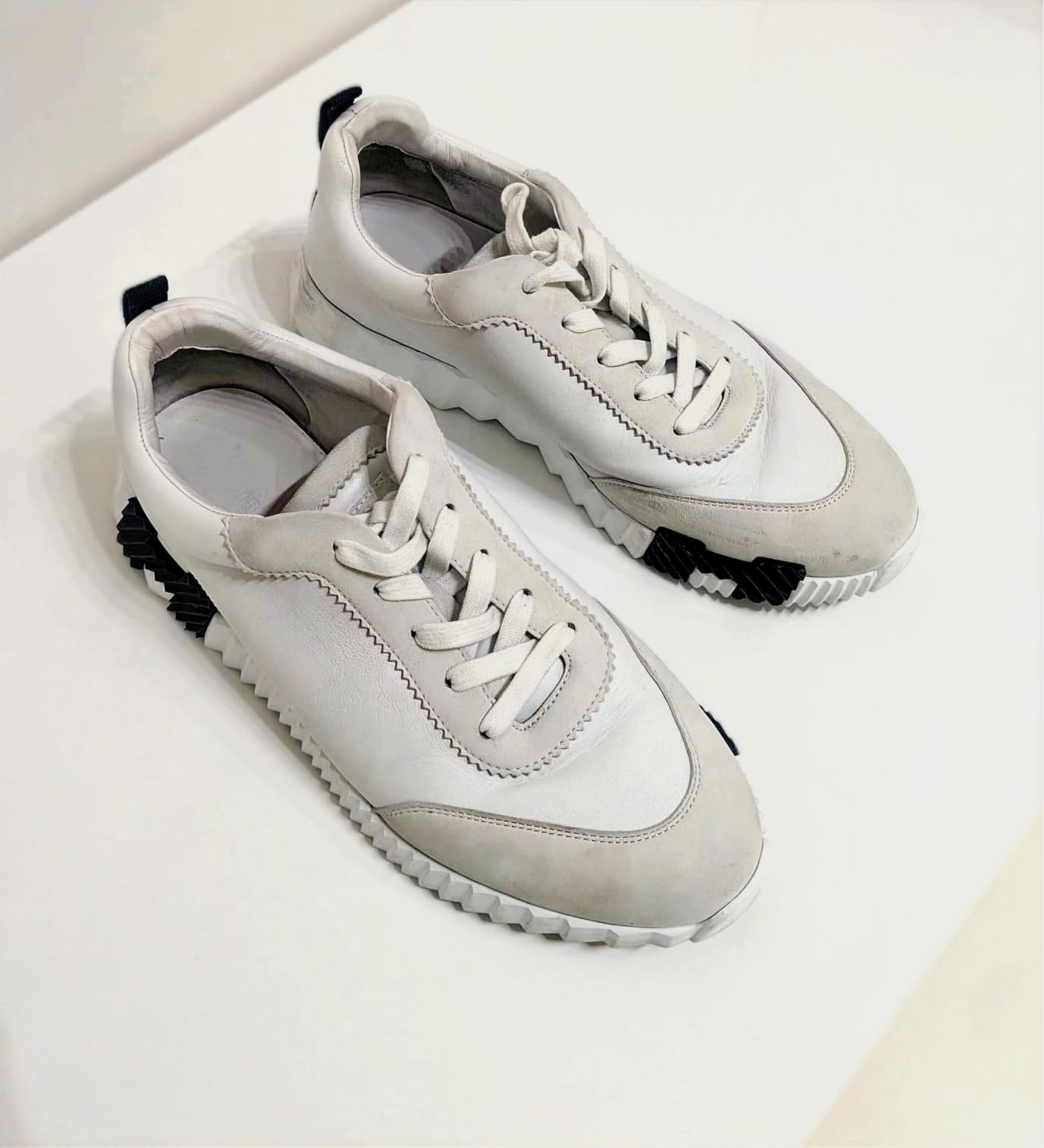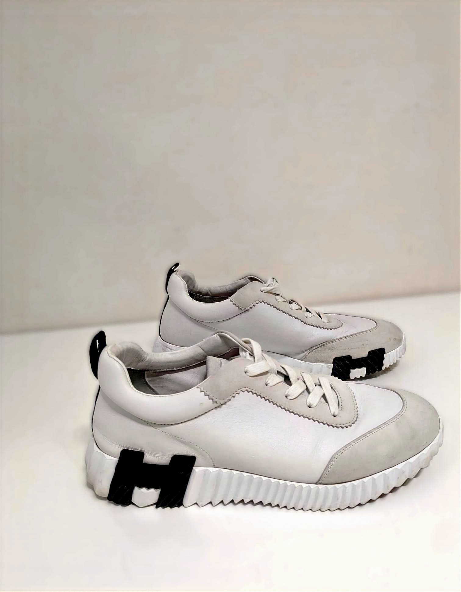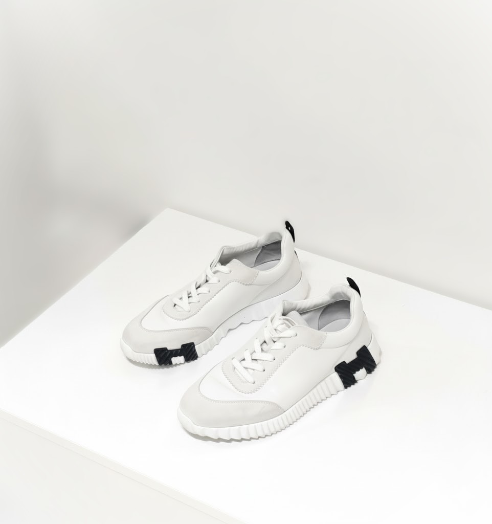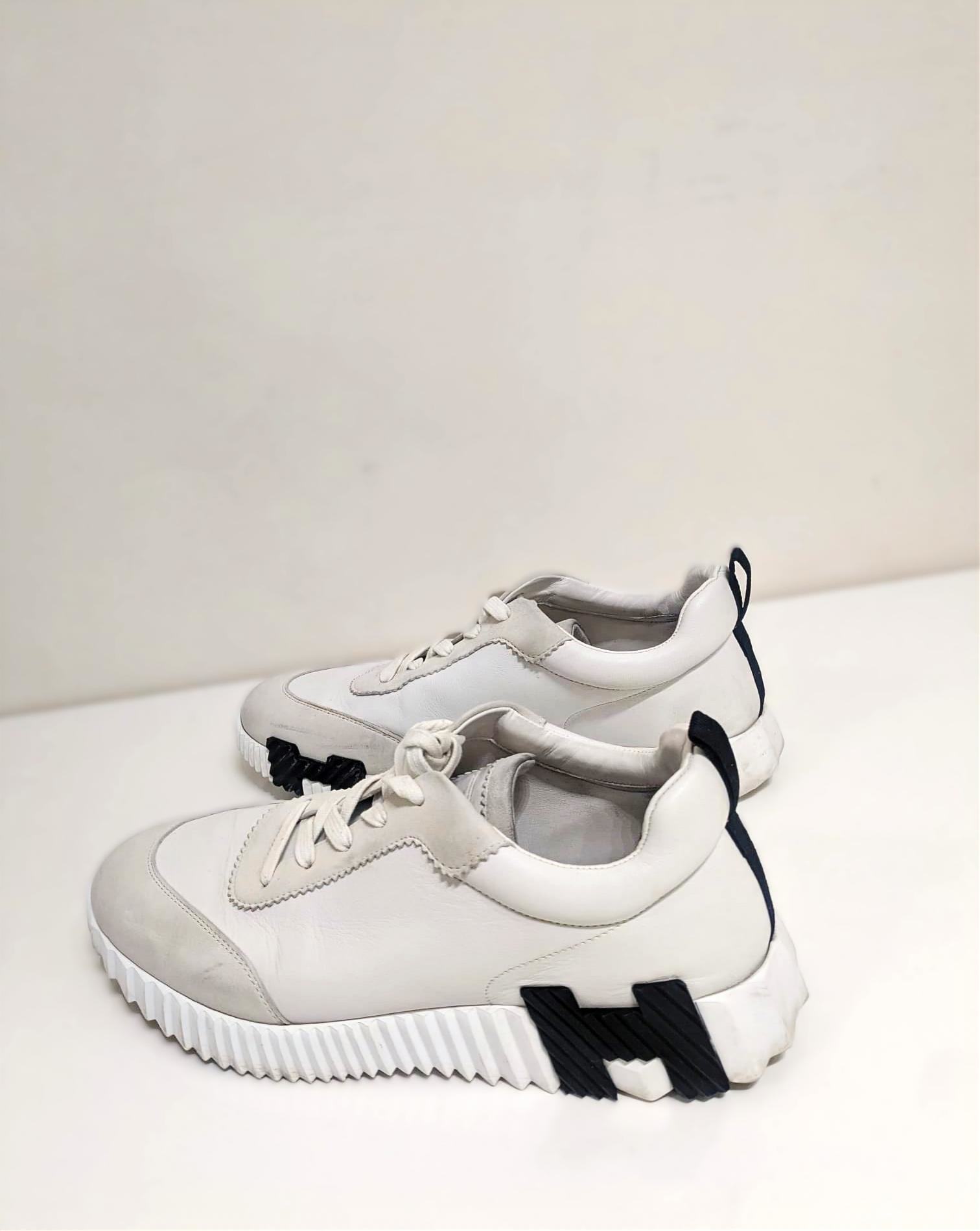 The Hermès Bouncing sneaker: a masterpiece of urban elegance and dynamic spirit. This pristine pair of sneakers embodies agility and vibrancy, as if effortlessly gliding through city streets without touching the ground. Crafted to ignite your every step with untamed energy, it transforms daily moments into exhilarating adventures. The sneaker boldly features Hermes' iconic "H en biais" motif, elegantly oversized and positioned to make a striking statement. These sneakers blend avant-garde design with supreme comfort. The sculpted outsole, with its distinctive zigzag pattern and contrasting black accents, adds both style and traction. The premium leather and suede upper provide a seamless, luxurious finish, making this sneaker an emblem of refined urban fashion. The Bouncing sneaker combines lightness and power, sophistication and spontaneity.