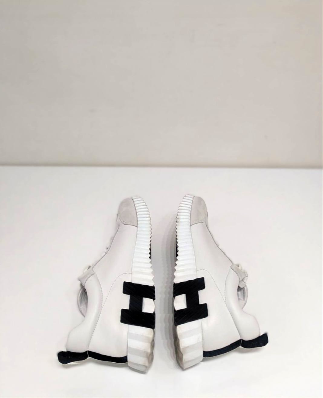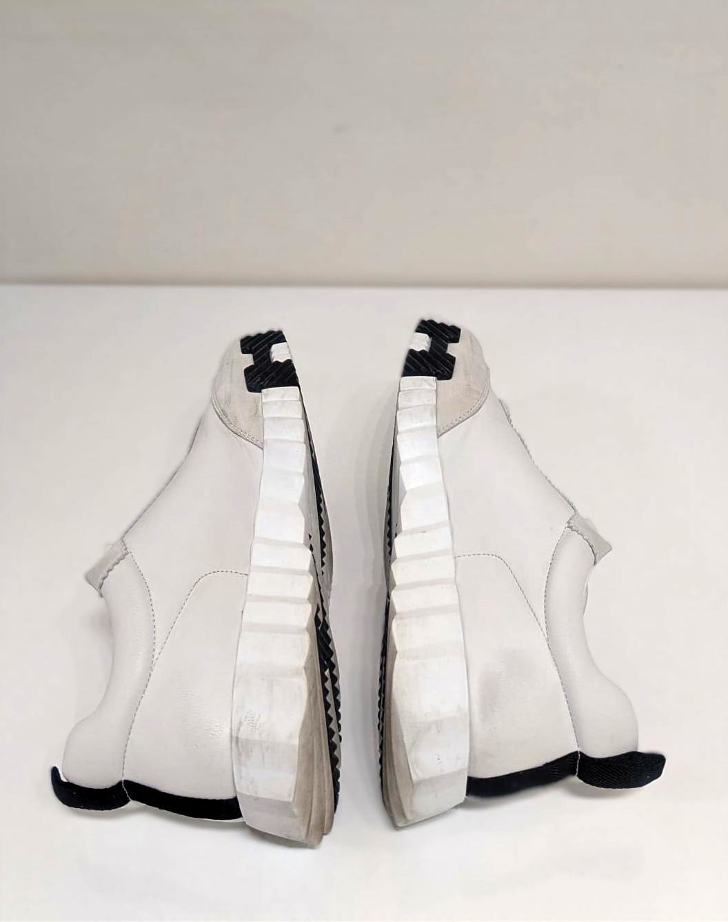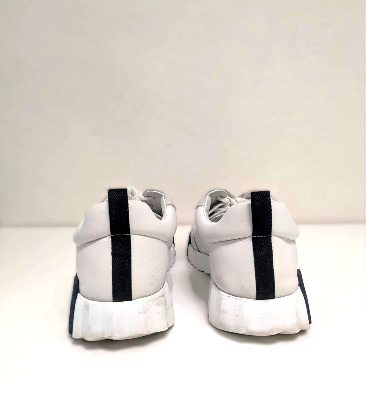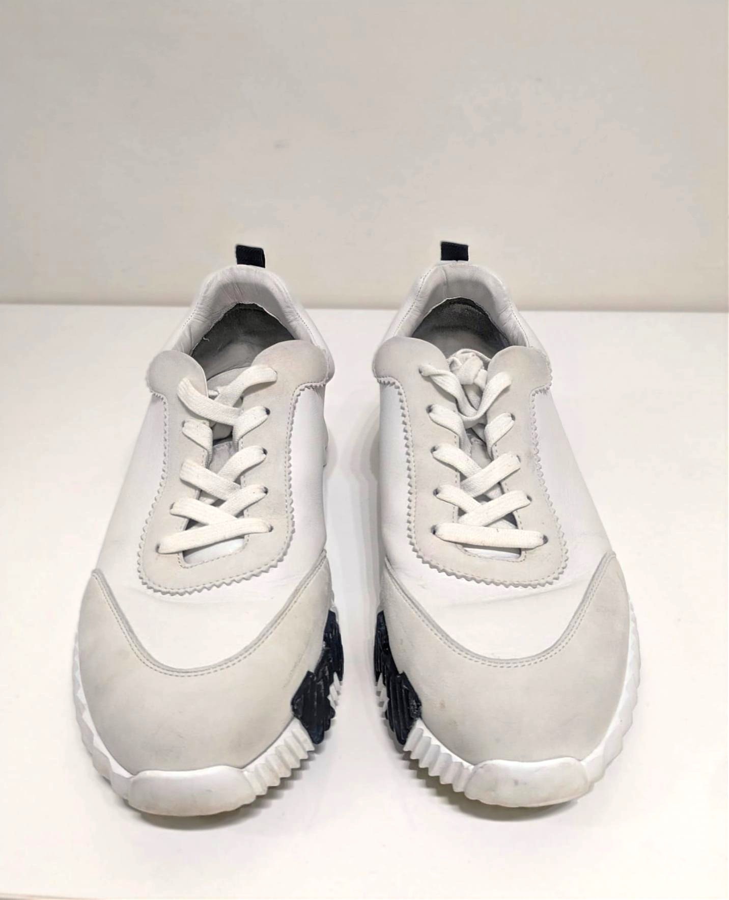 The Hermès Bouncing sneaker: a masterpiece of urban elegance and dynamic spirit. This pristine pair of sneakers embodies agility and vibrancy, as if effortlessly gliding through city streets without touching the ground. Crafted to ignite your every step with untamed energy, it transforms daily moments into exhilarating adventures. The sneaker boldly features Hermes' iconic "H en biais" motif, elegantly oversized and positioned to make a striking statement. These sneakers blend avant-garde design with supreme comfort. The sculpted outsole, with its distinctive zigzag pattern and contrasting black accents, adds both style and traction. The premium leather and suede upper provide a seamless, luxurious finish, making this sneaker an emblem of refined urban fashion. The Bouncing sneaker combines lightness and power, sophistication and spontaneity.