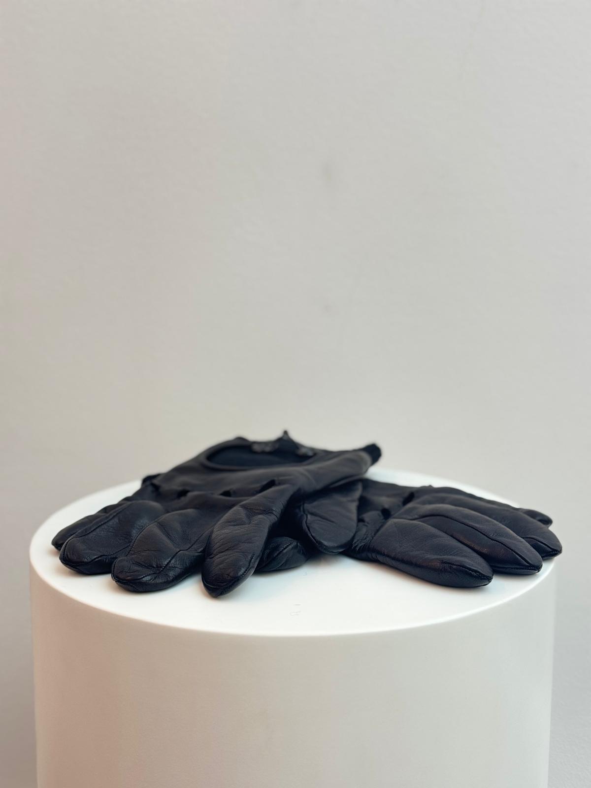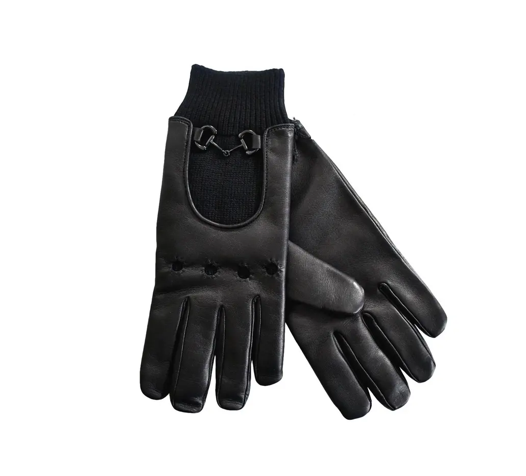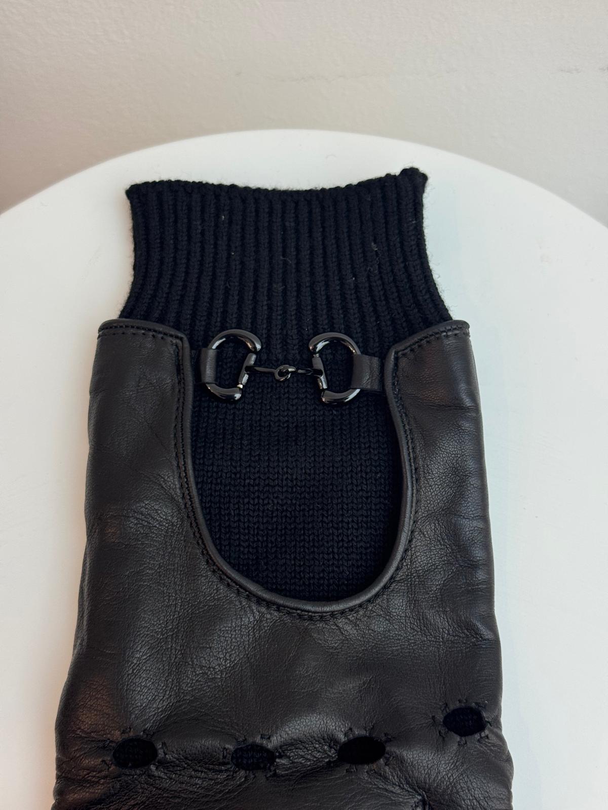 Gucci Leather Gloves, a masterclass in Italian craftsmanship and timeless equestrian heritage. Meticulously crafted from supple black lambskin leather, these gloves feature the iconic tonal Horsebit hardware set against a distinctive circular cutout, revealing a cozy rib-knit wool cuff for added warmth and a layered aesthetic. The back of the hand is detailed with classic perforated accents, blending a traditional driving-glove silhouette with modern luxury. Finished with a soft, insulating lining and a snug fit, these gloves offer the perfect balance of functional protection and high-fashion elegance for the discerning individual.