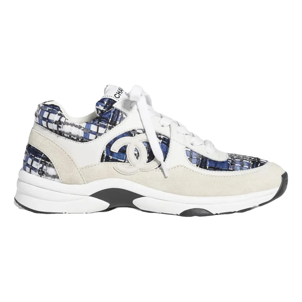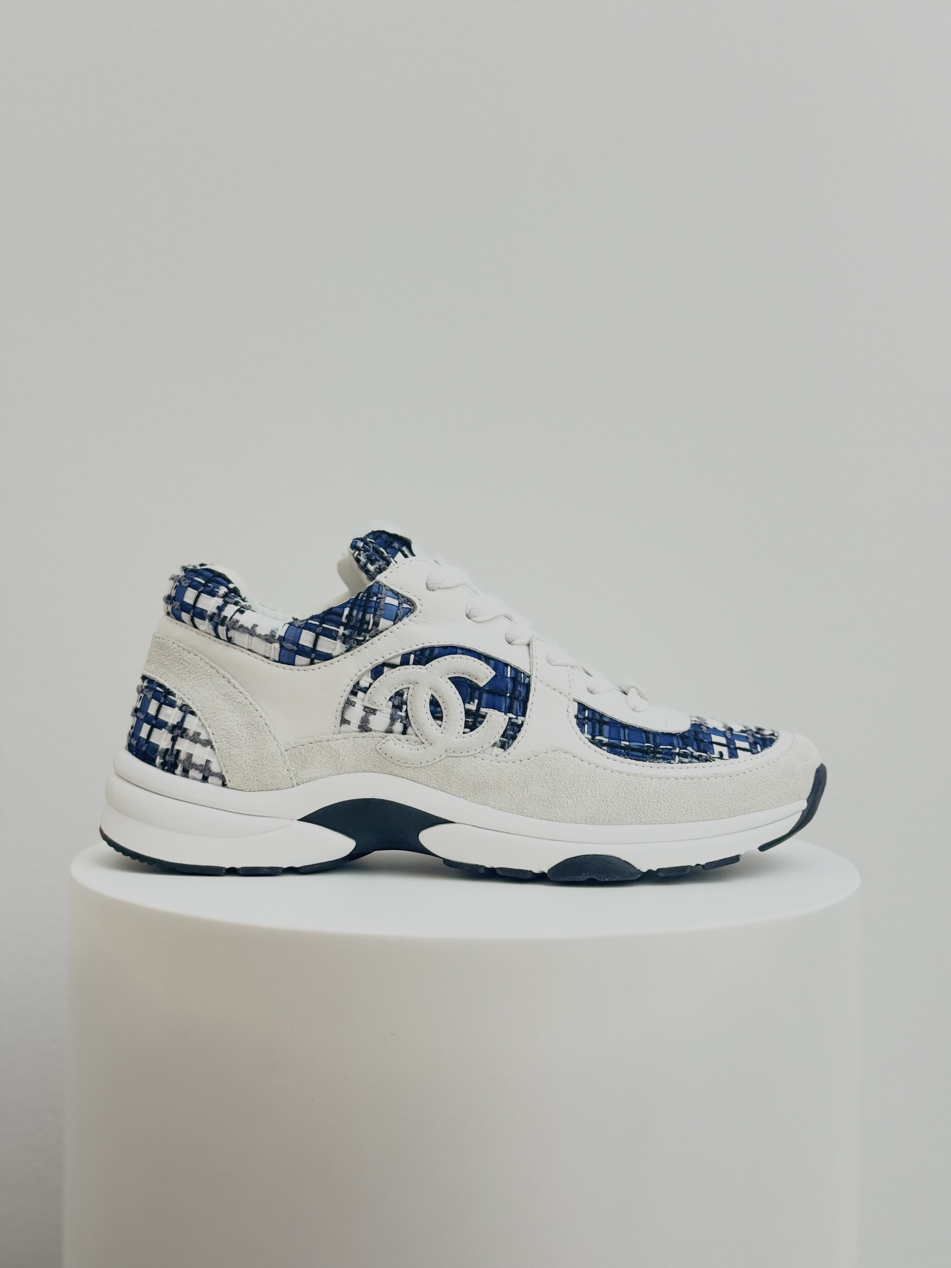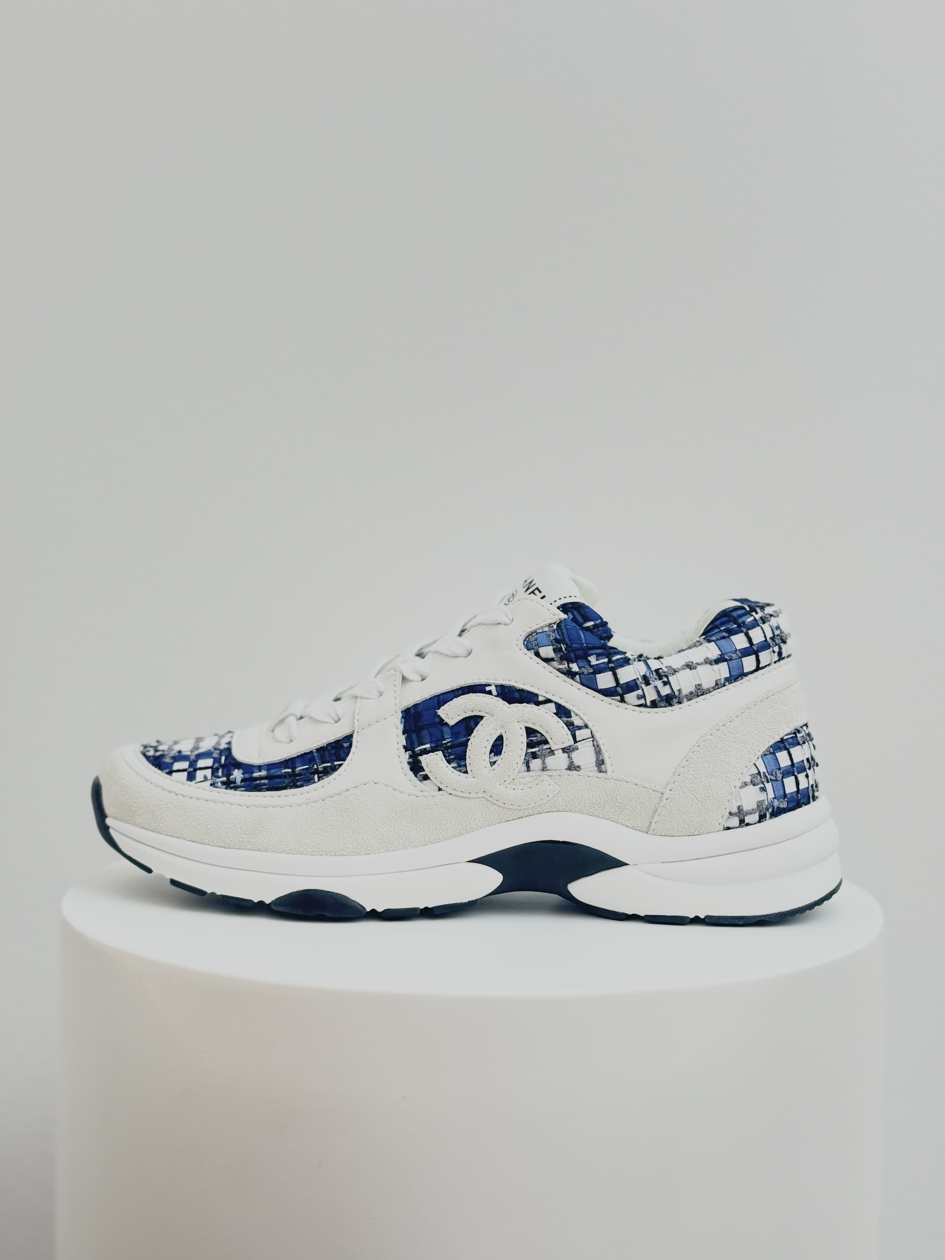 Elevate your everyday style with these Chanel CC Logo Tweed Sneakers, a perfect fusion of luxury and comfort. Crafted from signature Chanel tweed in blue and white tones with suede and leather accents, these sneakers feature the iconic interlocking CC logo on the side. Finished with a supportive rubber sole, they embody effortless sophistication — ideal for adding a chic touch to any casual or streetwear look.