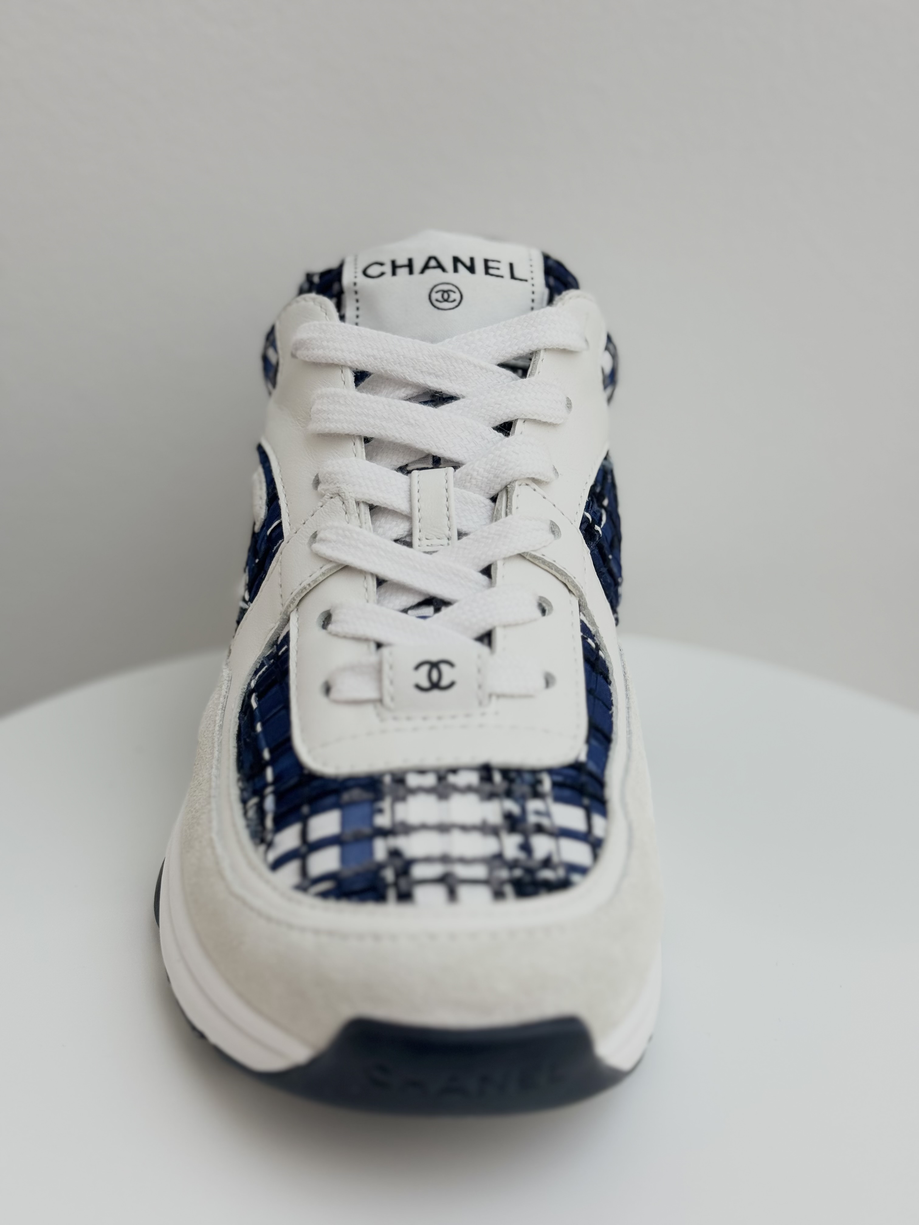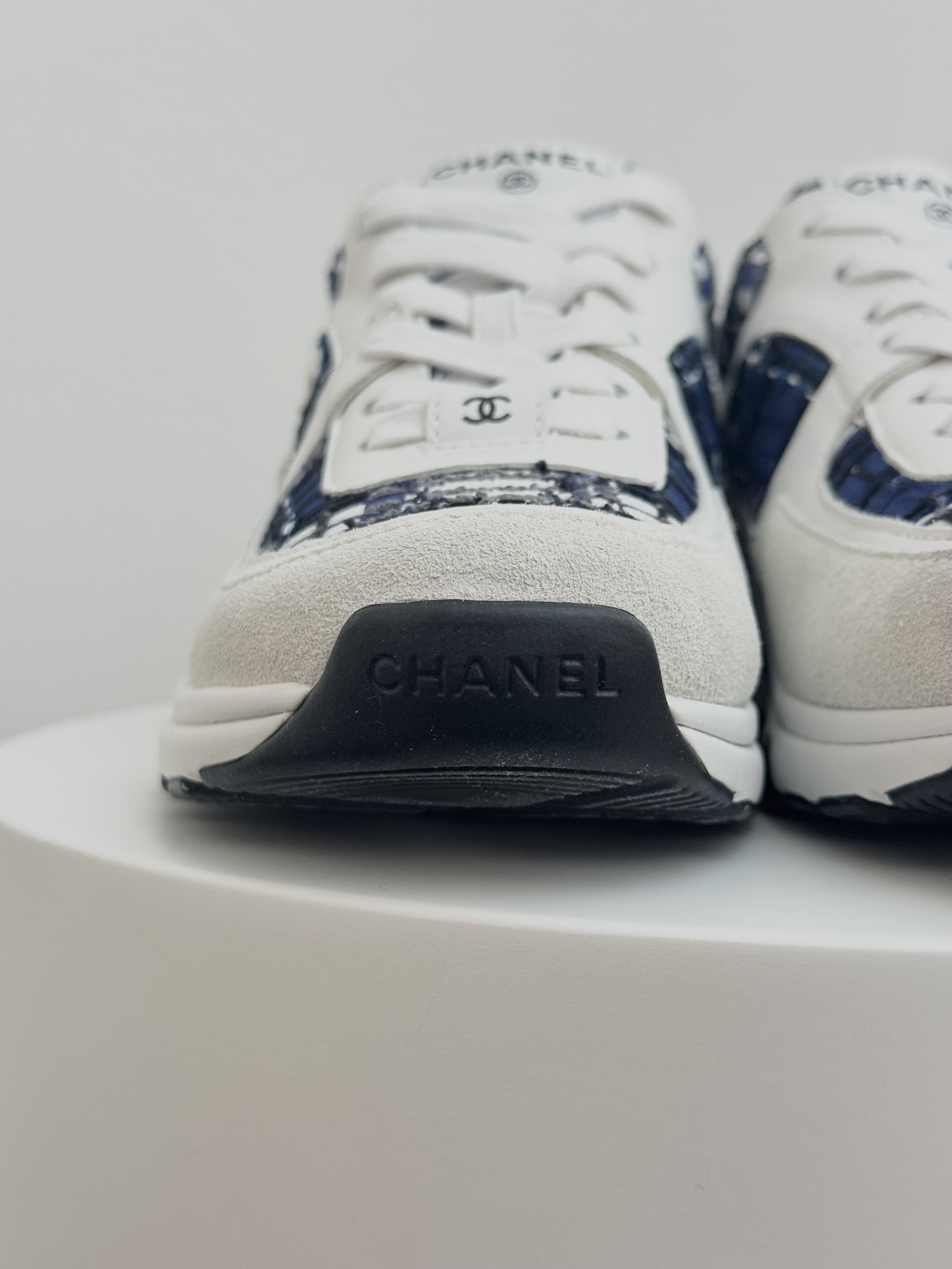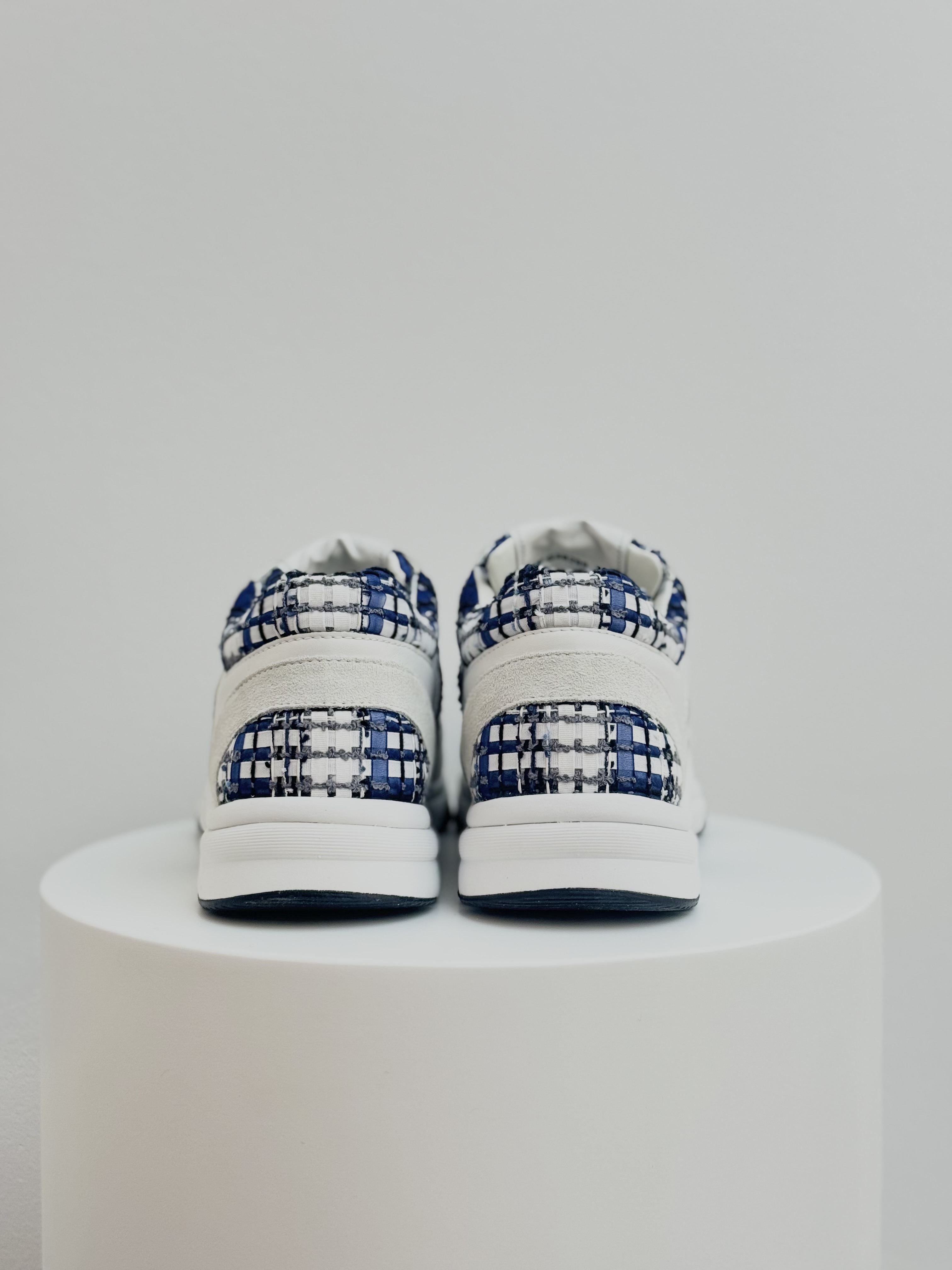 Elevate your everyday style with these Chanel CC Logo Tweed Sneakers, a perfect fusion of luxury and comfort. Crafted from signature Chanel tweed in blue and white tones with suede and leather accents, these sneakers feature the iconic interlocking CC logo on the side. Finished with a supportive rubber sole, they embody effortless sophistication — ideal for adding a chic touch to any casual or streetwear look.