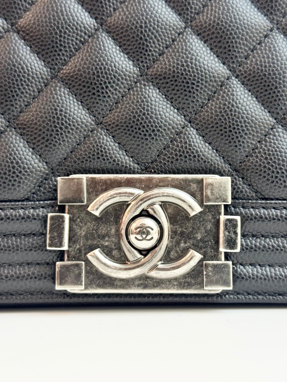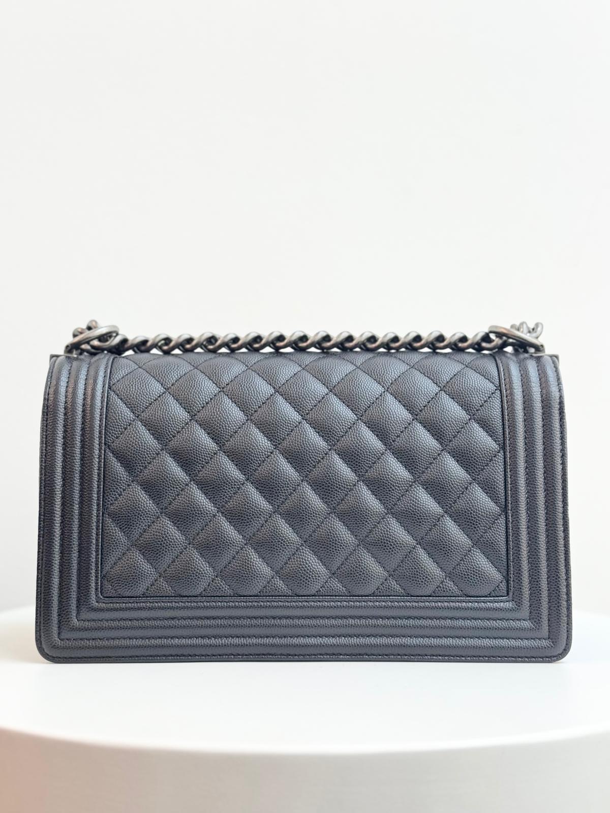 This iconic Chanel Medium Boy Bag is meticulously crafted from durable black grained "caviar" leather, perfectly complemented by signature ruthenium hardware for a bold yet timeless look. Presented in Full Set condition and worn only a few times, this piece maintains its structured elegance and impeccable quality. Its versatile design features the classic quilted pattern and the signature Boy push-lock closure, offering seamless wear as either a shoulder or crossbody bag thanks to the adjustable chain and leather strap. A quintessential investment piece, this bag balances sophisticated luxury with everyday practicality, making it a coveted addition to any discerning wardrobe.
