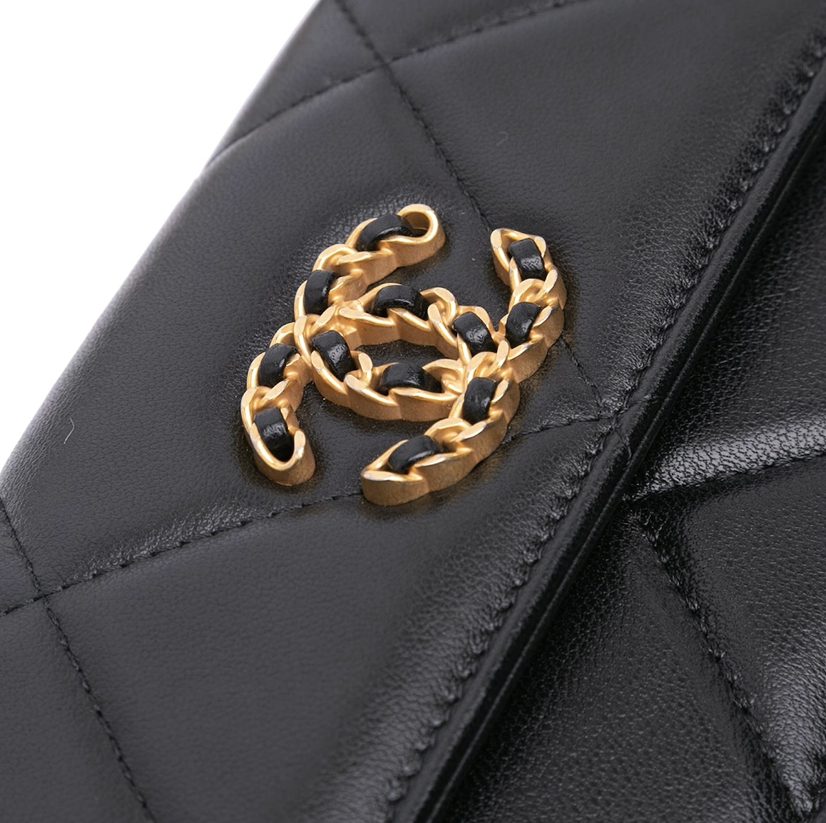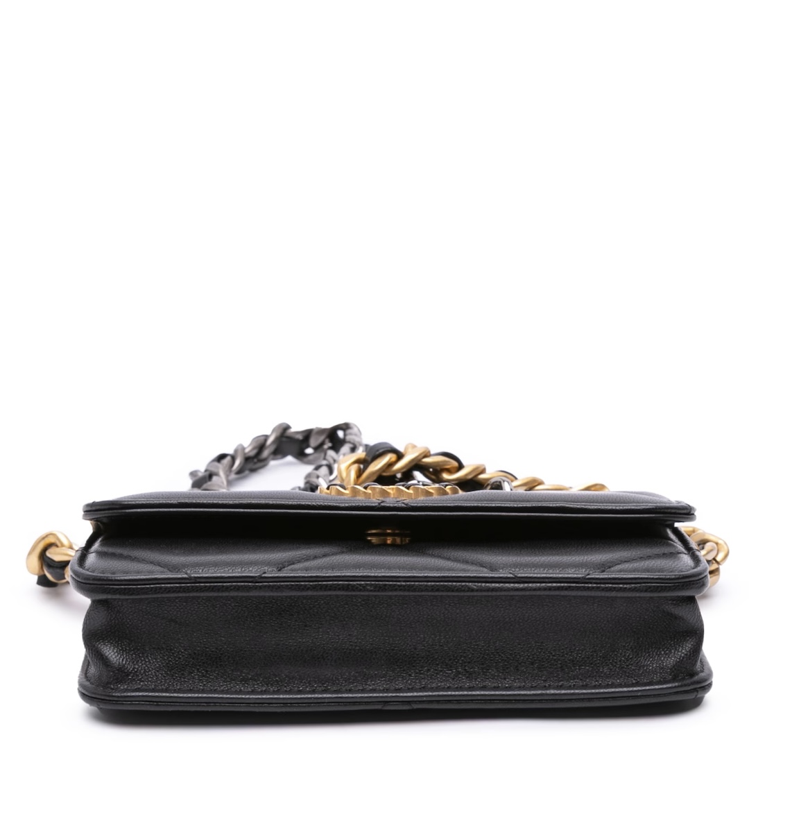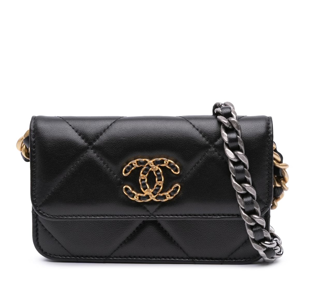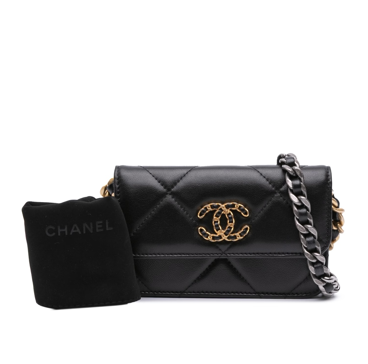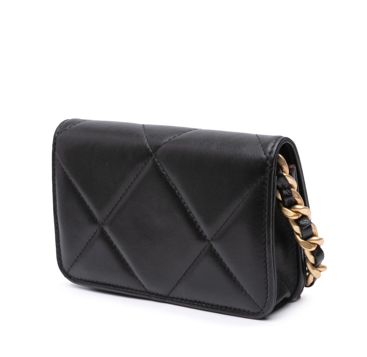 This is an authentic Chanel Lambskin Quilted Chanel 19 Flap Coin Purse With Chain in Black. This chic shoulder bag is crafted of lambskin diamond-stitched leather. This handbag features a leather threaded chain-link shoulder strap and a matching Chanel CC logo on the front. This opens to a partitioned burgundy fabric interior.