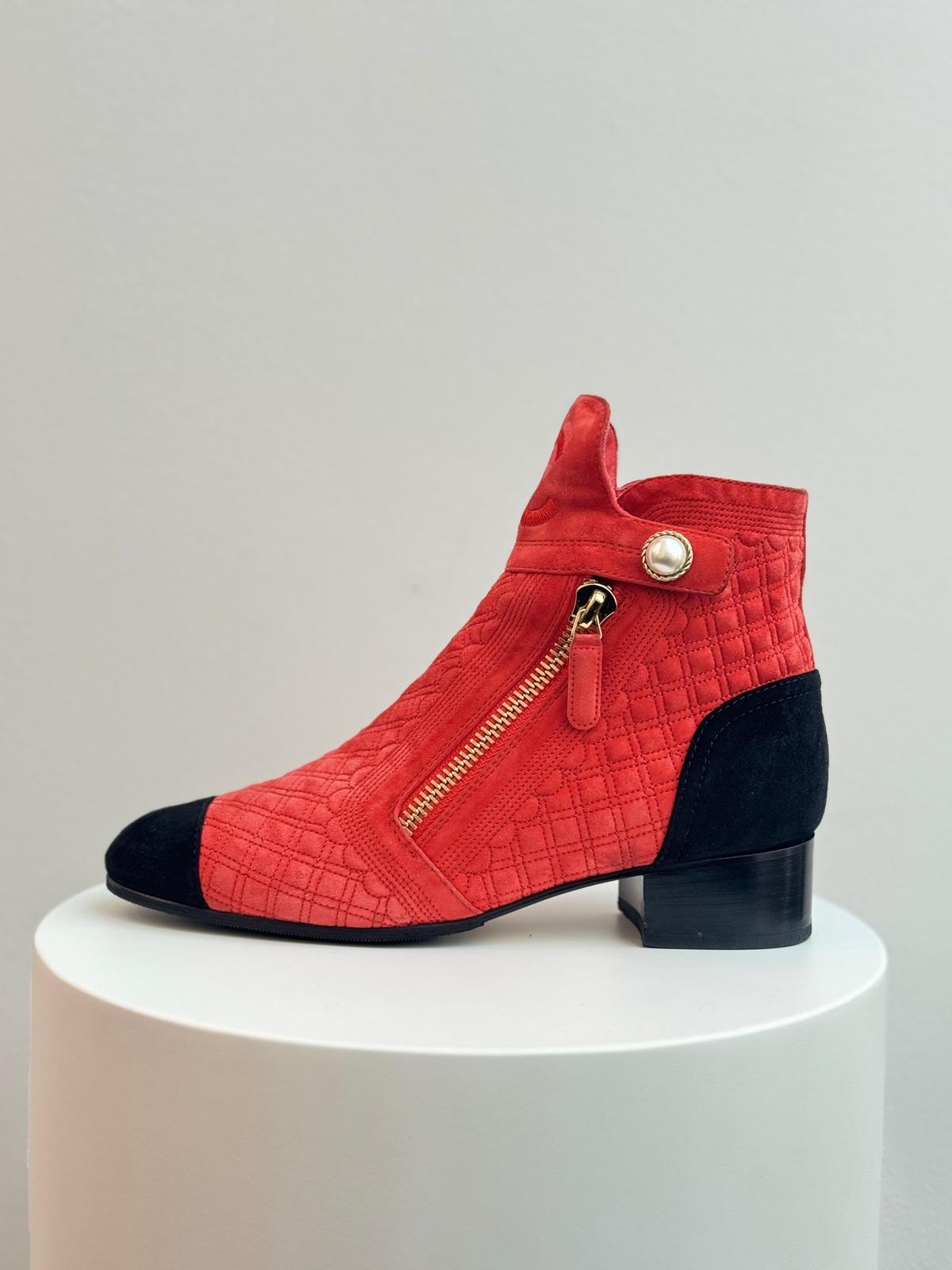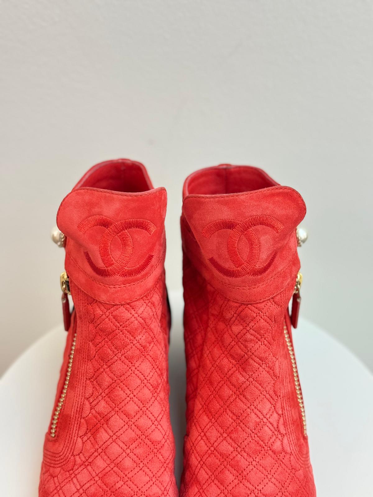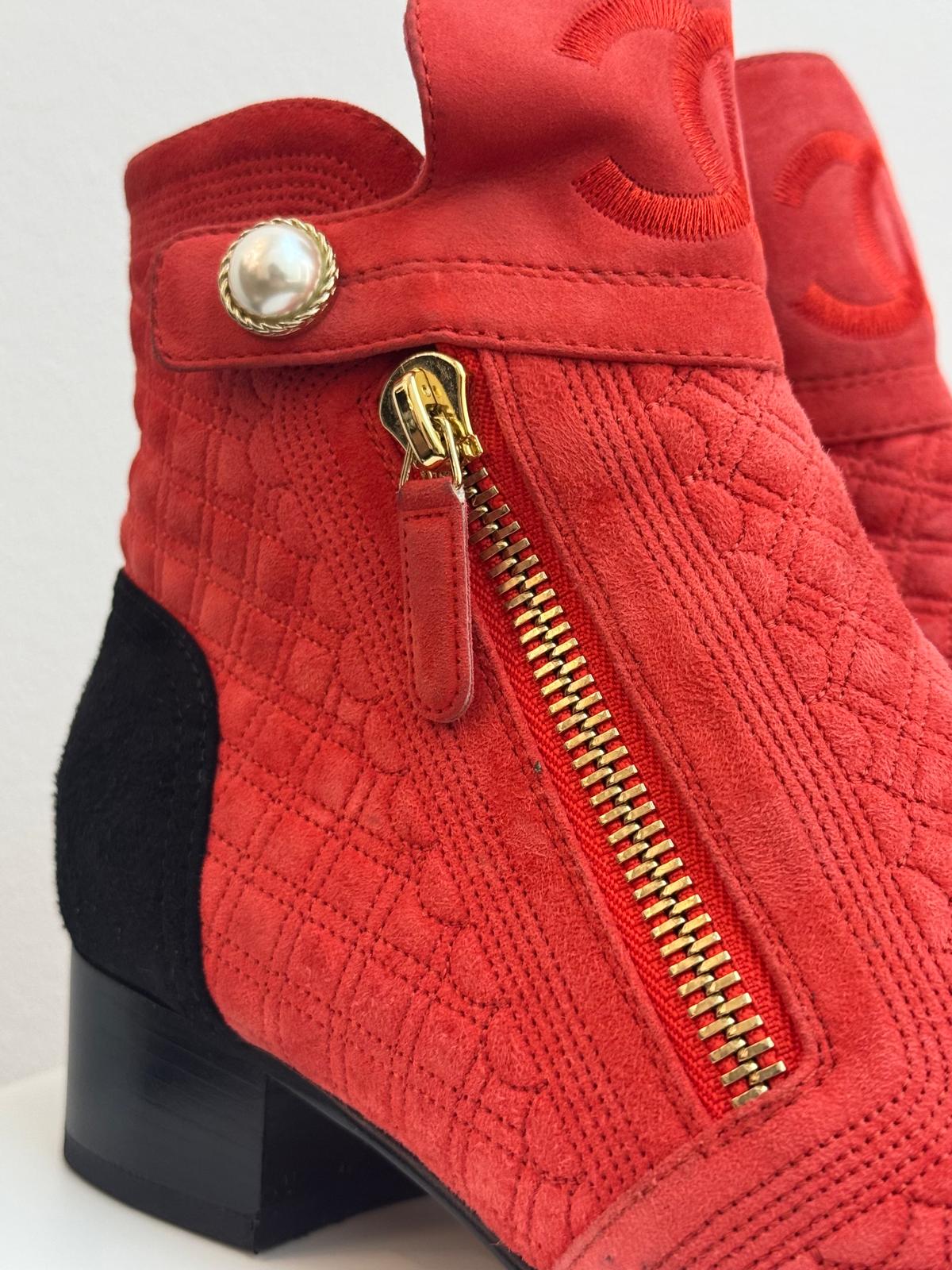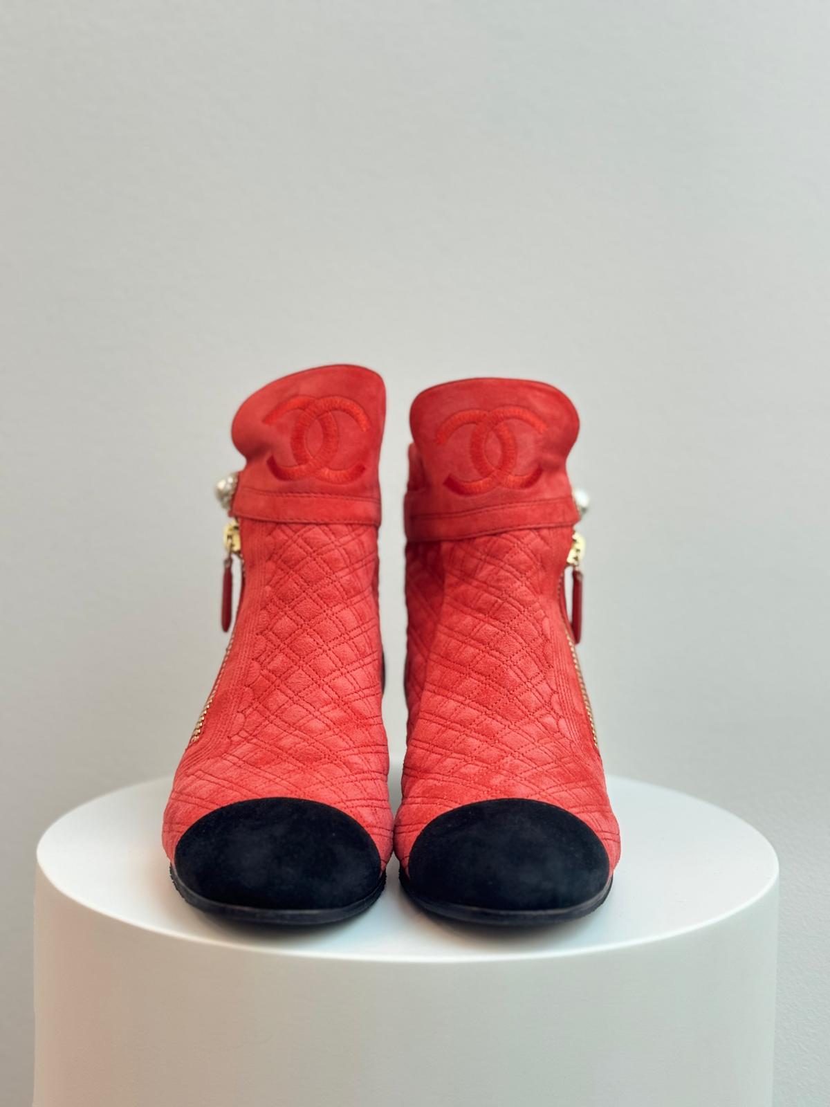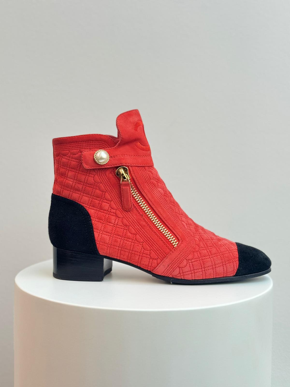 Step into effortless Parisian chic with these striking Chanel ankle boots, crafted from luxurious red suede and finished with the brand’s signature quilted pattern. The contrasting black cap toe adds a timeless Chanel touch, while the sleek ankle silhouette offers both sophistication and everyday versatility. Elegant, bold, and unmistakably iconic, these boots make a standout addition to any designer footwear collection.