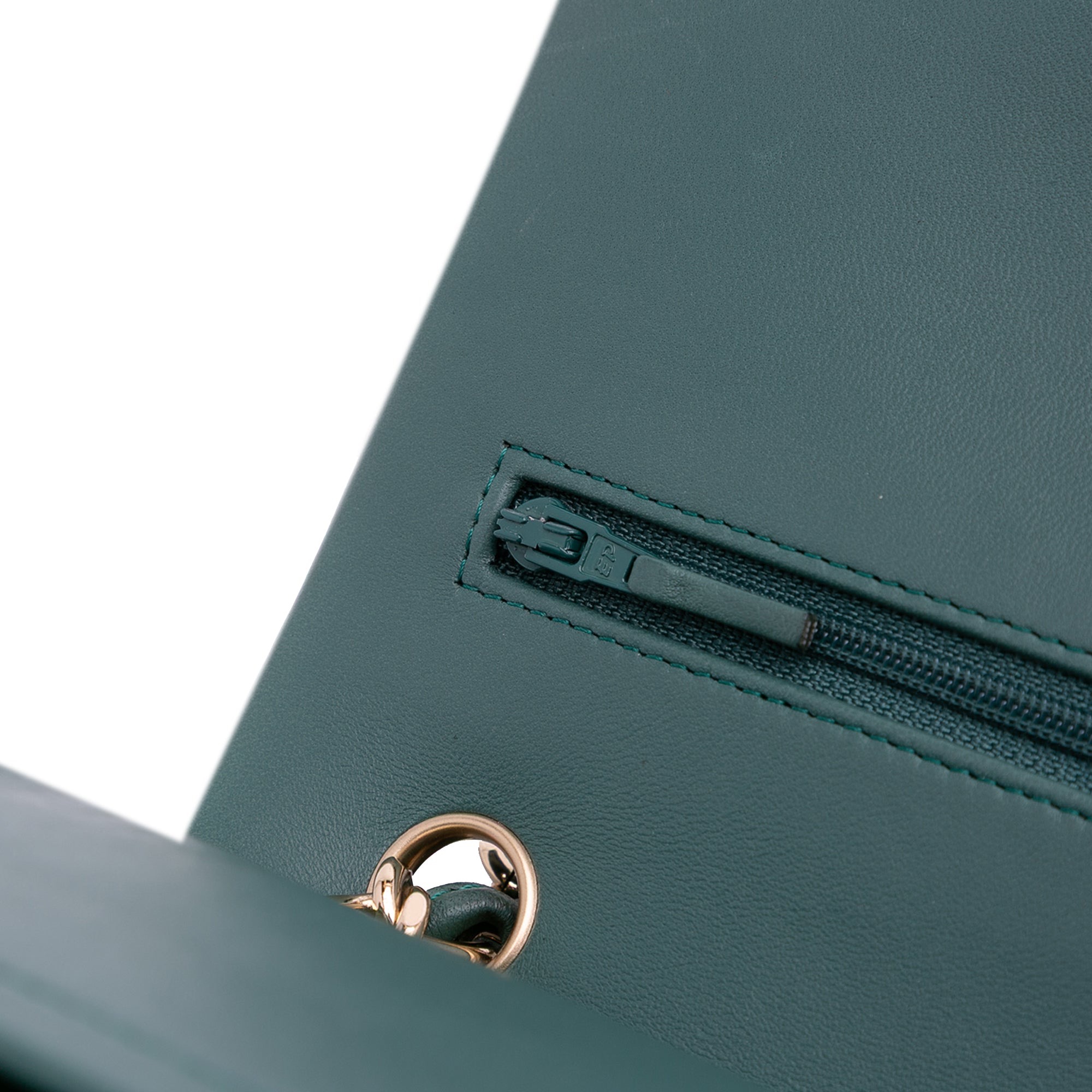 A refined statement from Chanel, this Classic Double Flap Shoulder Bag is beautifully crafted from supple quilted lambskin leather in a rare green hue. The bag features a leather-woven chain shoulder strap, the iconic interlocking CC turn-lock closure, and the sought-after double flap design for enhanced structure and security. Its timeless silhouette is paired with practical interior compartments and an exterior slip pocket, offering both elegance and functionality. A collector’s piece that perfectly embodies Chanel’s enduring legacy.