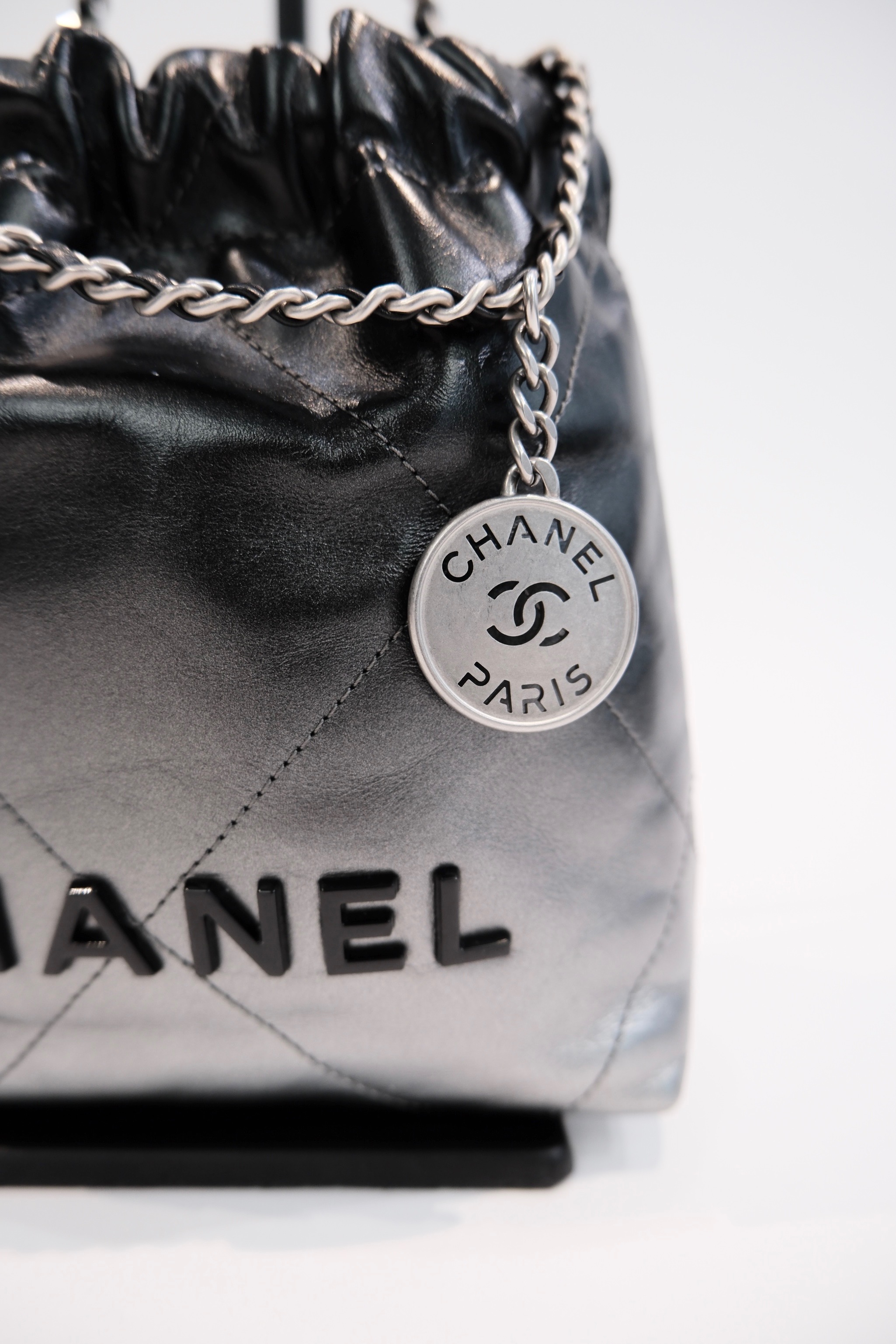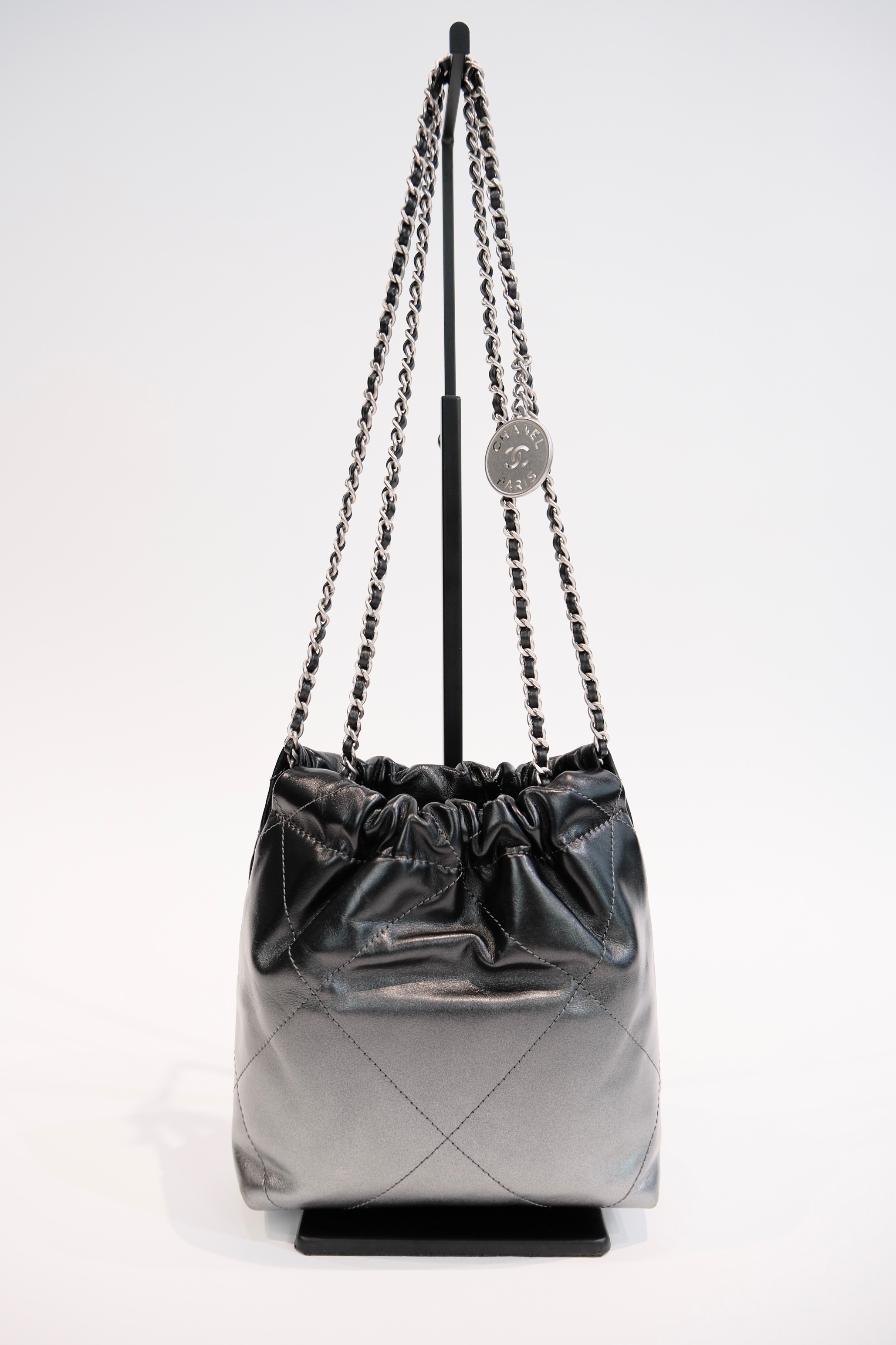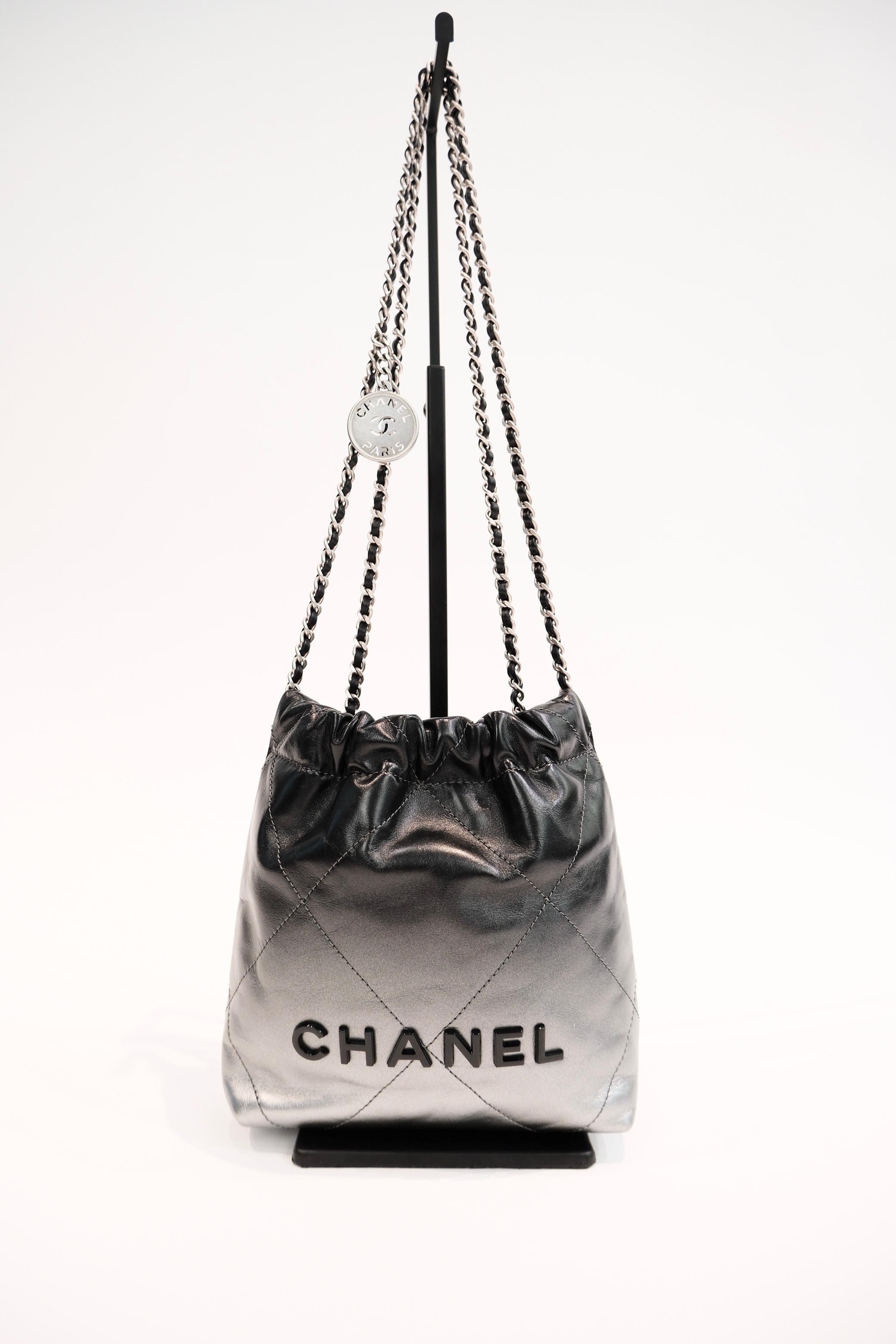 This Chanel Mini 22 in black and silver ombré with aged silver hardware is an exceptionally rare piece from the Resort 2024 collection. Purchased from the Chanel boutique in Milan, Italy, it remains in flawless condition—identical to its original state at the time of purchase, with no signs of wear. The striking ombré finish transitions seamlessly from deep black to shimmering silver, beautifully complemented by the vintage-inspired aged silver hardware. A perfect balance of contemporary design and timeless elegance, this Mini 22 is both a statement piece and a collectible. It is sold as a full set, including the original dust bag, box, purchase invoices, and all accompanying items exactly as received from the boutique.