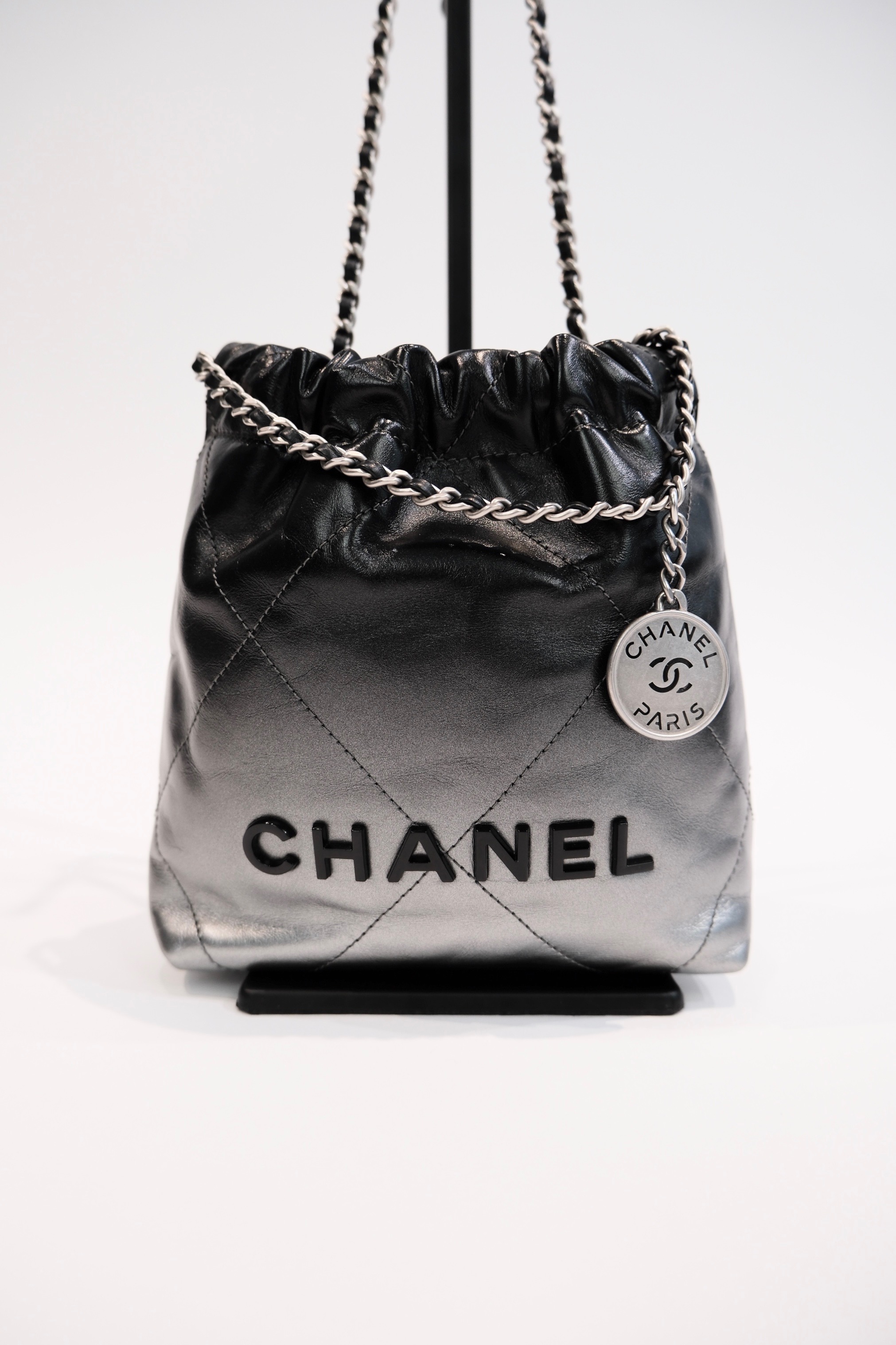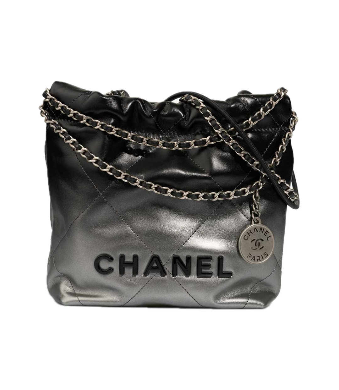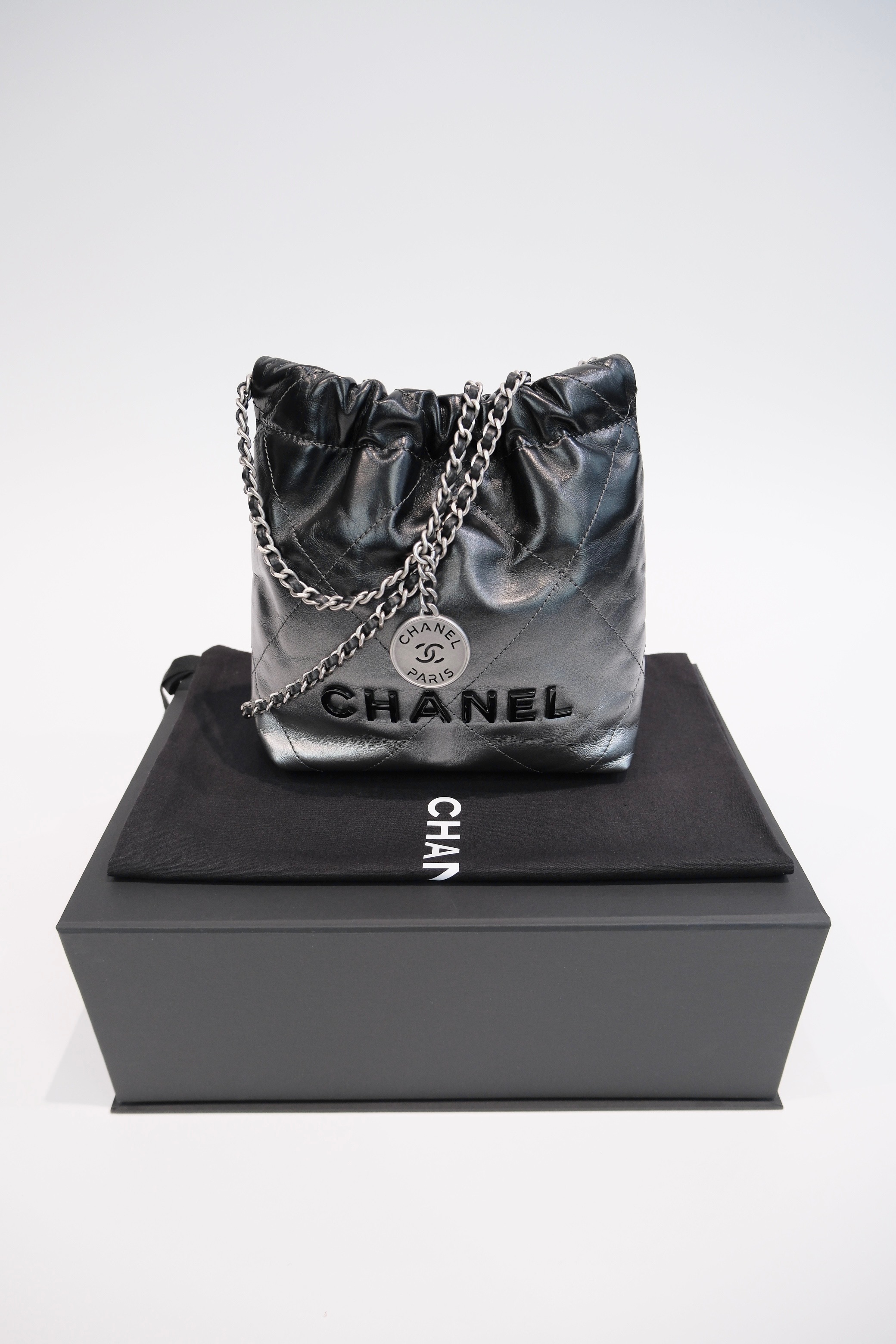 This Chanel Mini 22 in black and silver ombré with aged silver hardware is an exceptionally rare piece from the Resort 2024 collection. Purchased from the Chanel boutique in Milan, Italy, it remains in flawless condition—identical to its original state at the time of purchase, with no signs of wear. The striking ombré finish transitions seamlessly from deep black to shimmering silver, beautifully complemented by the vintage-inspired aged silver hardware. A perfect balance of contemporary design and timeless elegance, this Mini 22 is both a statement piece and a collectible. It is sold as a full set, including the original dust bag, box, purchase invoices, and all accompanying items exactly as received from the boutique.