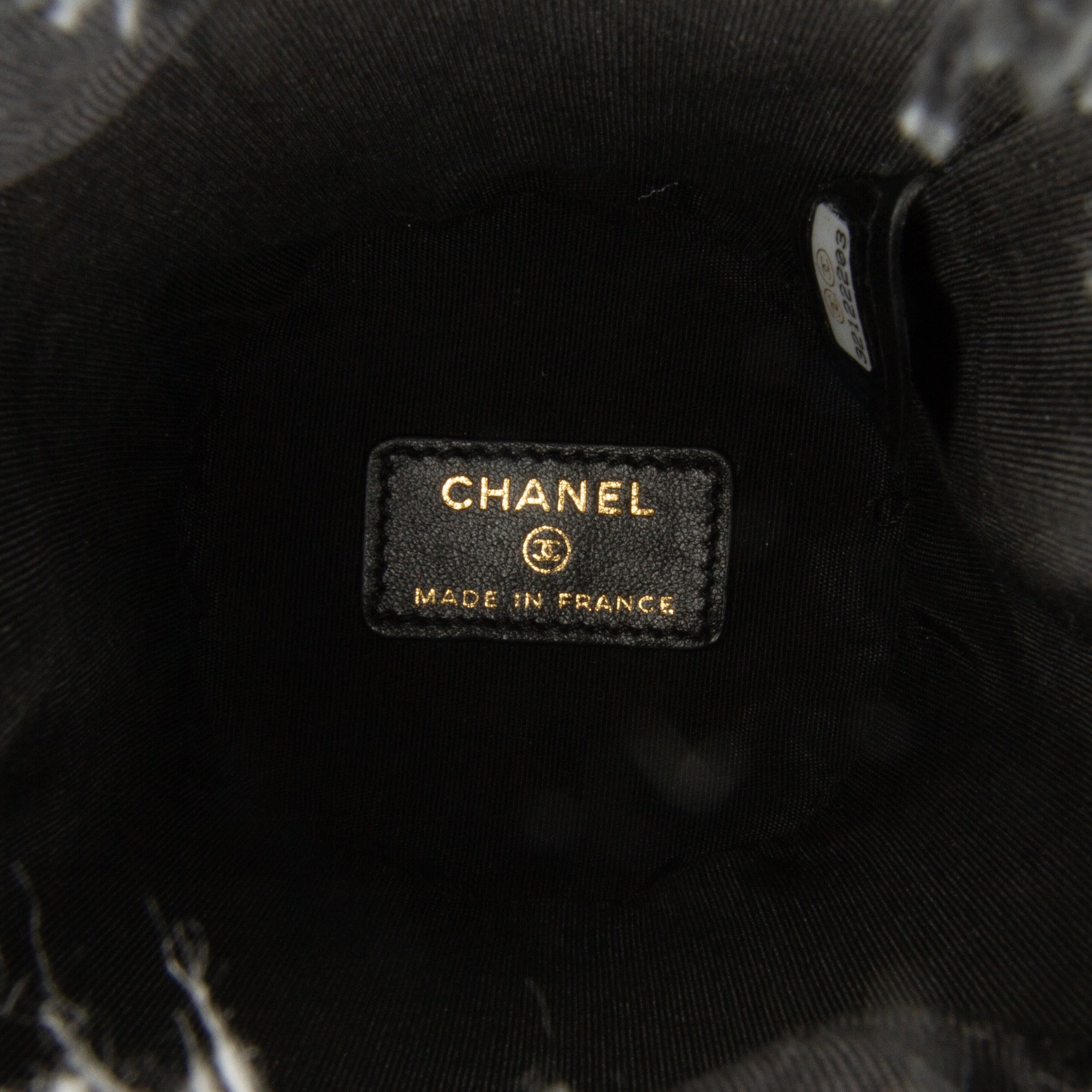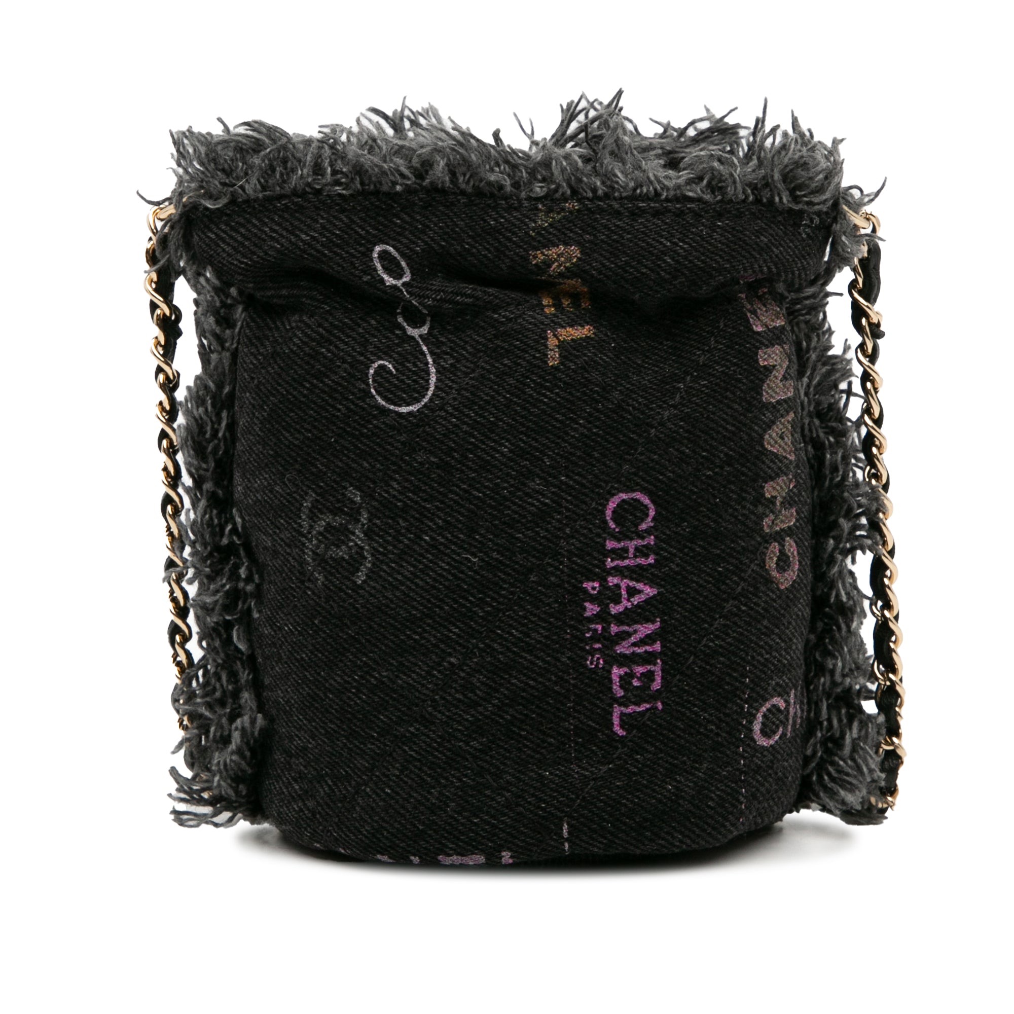 This Chanel Bucket Bag is a playful yet refined accessory crafted from quilted dark grey denim, highlighted by its iconic chain-link drawstring closure with CC embellishment. Its compact form and structured silhouette make it the perfect statement piece for any casual-luxe look. With a lightweight body and elegant chain strap, this bag blends modern style and classic Chanel elements, ideal for both daytime and evening wear.