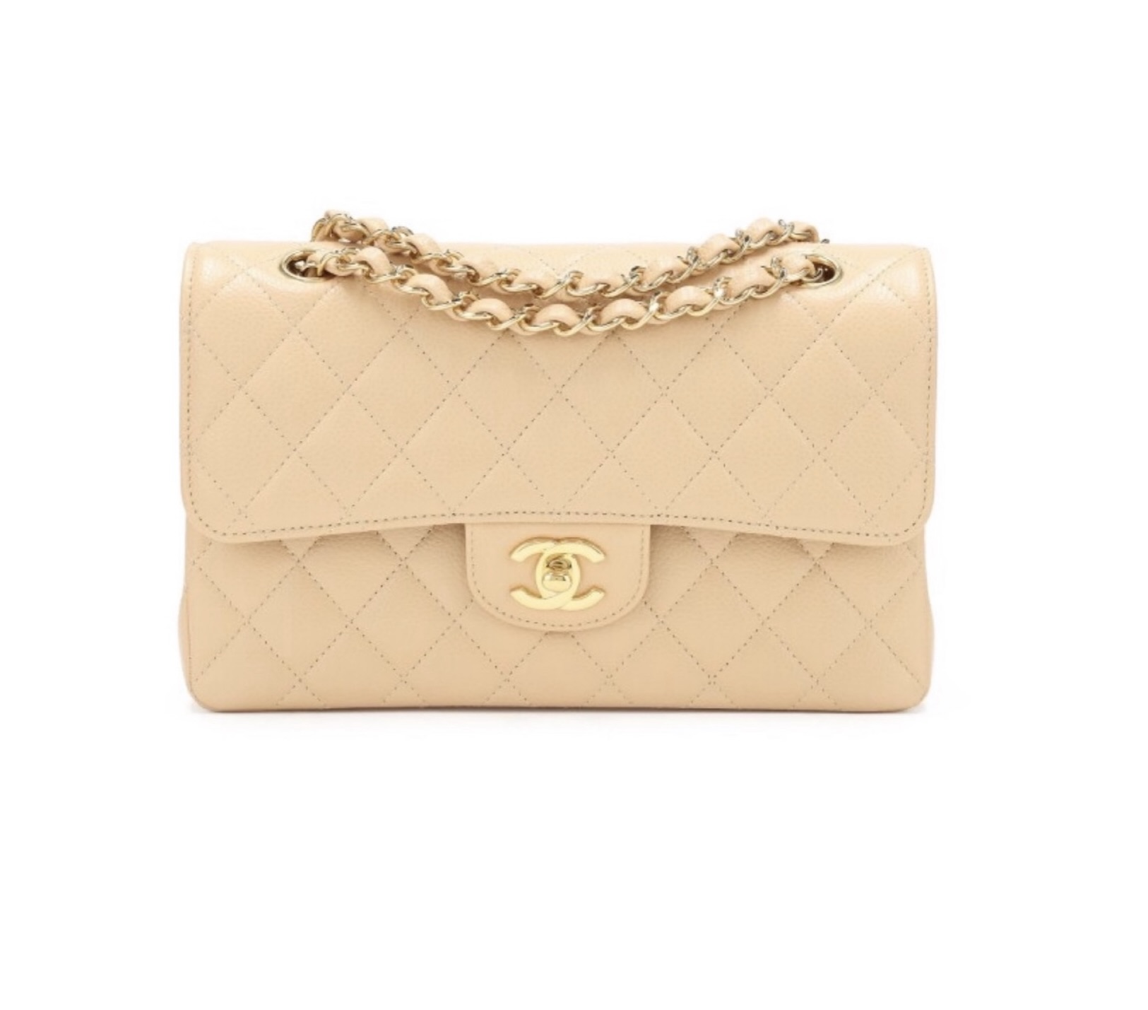 This Small Classic Double Flap bag is in beige lambskin leather with gold tone hardware and features a front flap with signature CC turnlock closure, half moon back pocket, and adjustable interwoven silver tone chain link and beige leather shoulder strap. The interior is lined in beige leather with the "love letter" zipper compartment underneath the first flap, an "outer" slit pocket under the second flap, and an interior compartment with two open pockets separated by a "lipstick" compartment.