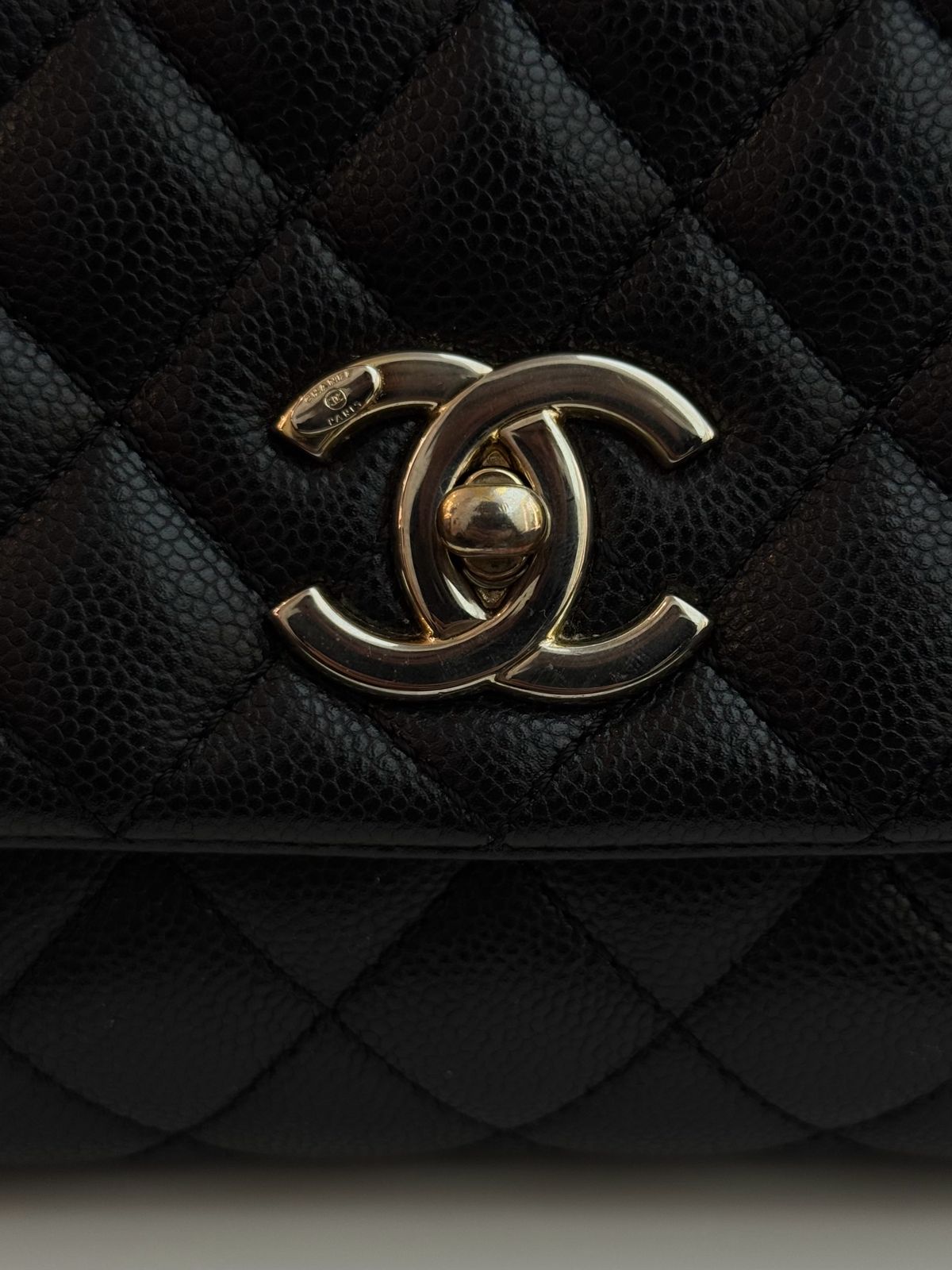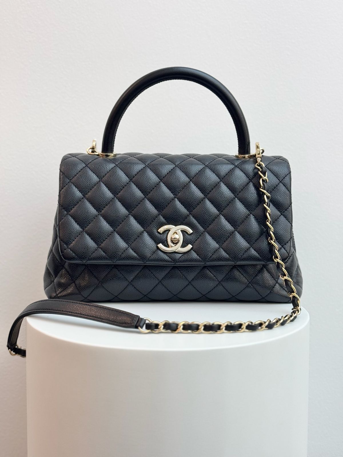 The Chanel Coco Handle bag in black is a sophisticated and highly coveted accessory that elegantly merges the classic structure of a timeless flap bag with the practicality of a top handle. Crafted from luxurious quilted leather, lambskin, and presented in the essential black hue, this bag features the iconic diamond quilting, the signature interwoven leather and chain strap, and the instantly recognizable CC turn-lock closure. The sturdy top handle offers versatile carrying options, while the spacious, compartmented interior makes the Coco Handle a perfect blend of enduring Chanel heritage and everyday functionality