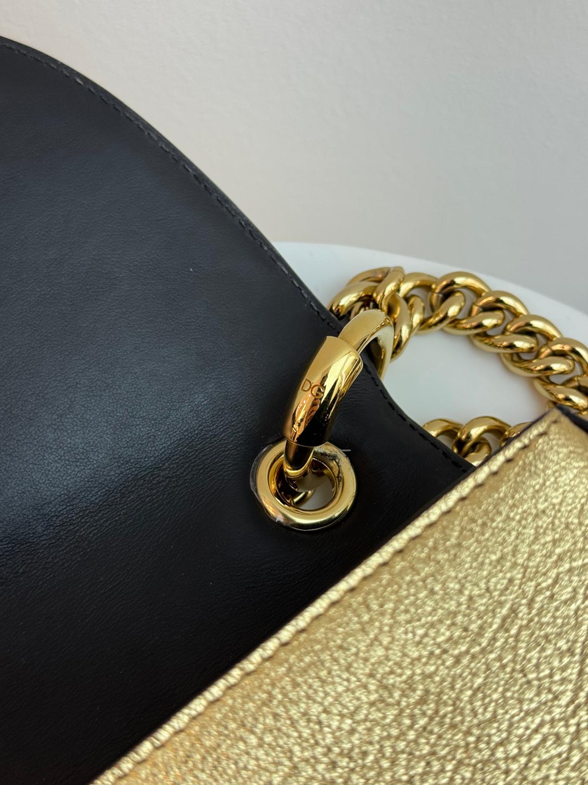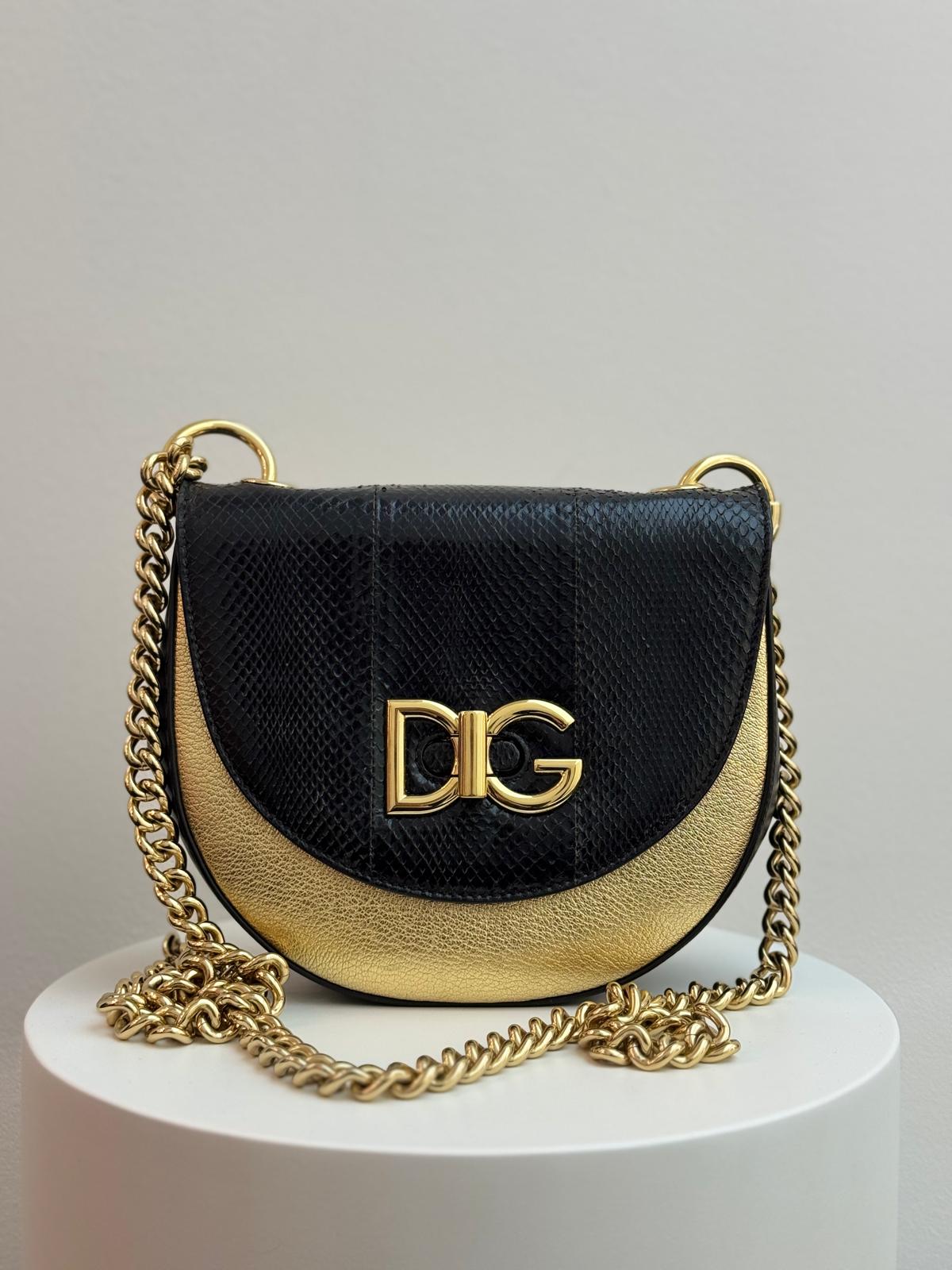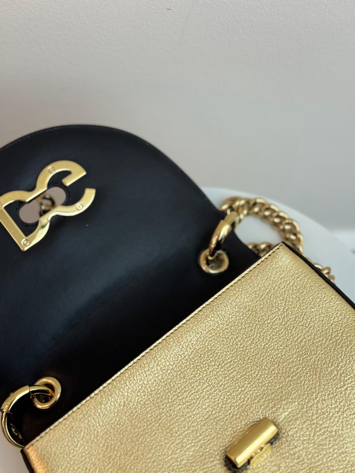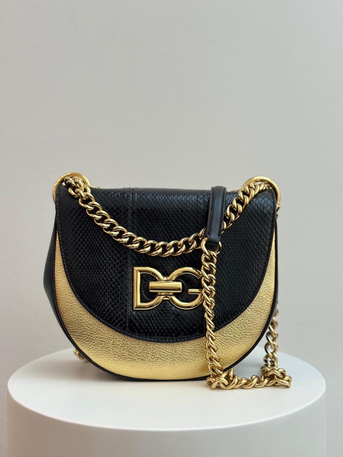 Infuse your daily rotation with a touch of Sicilian glamour with this striking Dolce & Gabbana Wifi bag. A playful yet sophisticated take on the classic saddle silhouette, this bag is expertly crafted from smooth black leather, accented with contrasting metallic gold leather details (or heavy gold-tone hardware, depending on the specific variation) that highlight the brand's penchant for opulence. The structured design features the signature turn-lock fastening at the front, opening to reveal a practical, organized interior. Finished with a versatile adjustable shoulder strap, this bag is the ultimate day-to-night companion, easily transitioning from a chic crossbody for city errands to a statement shoulder bag for evening events.