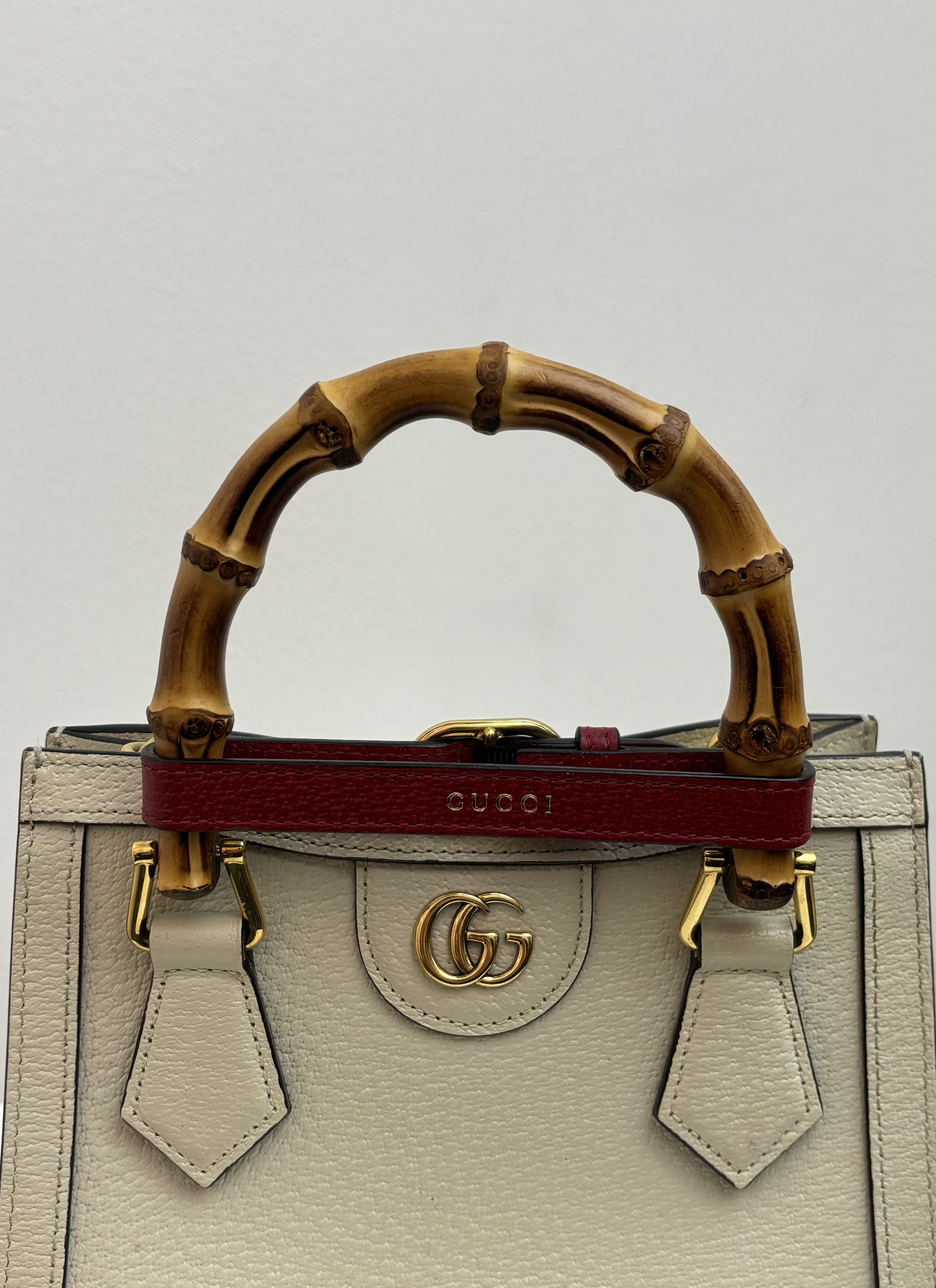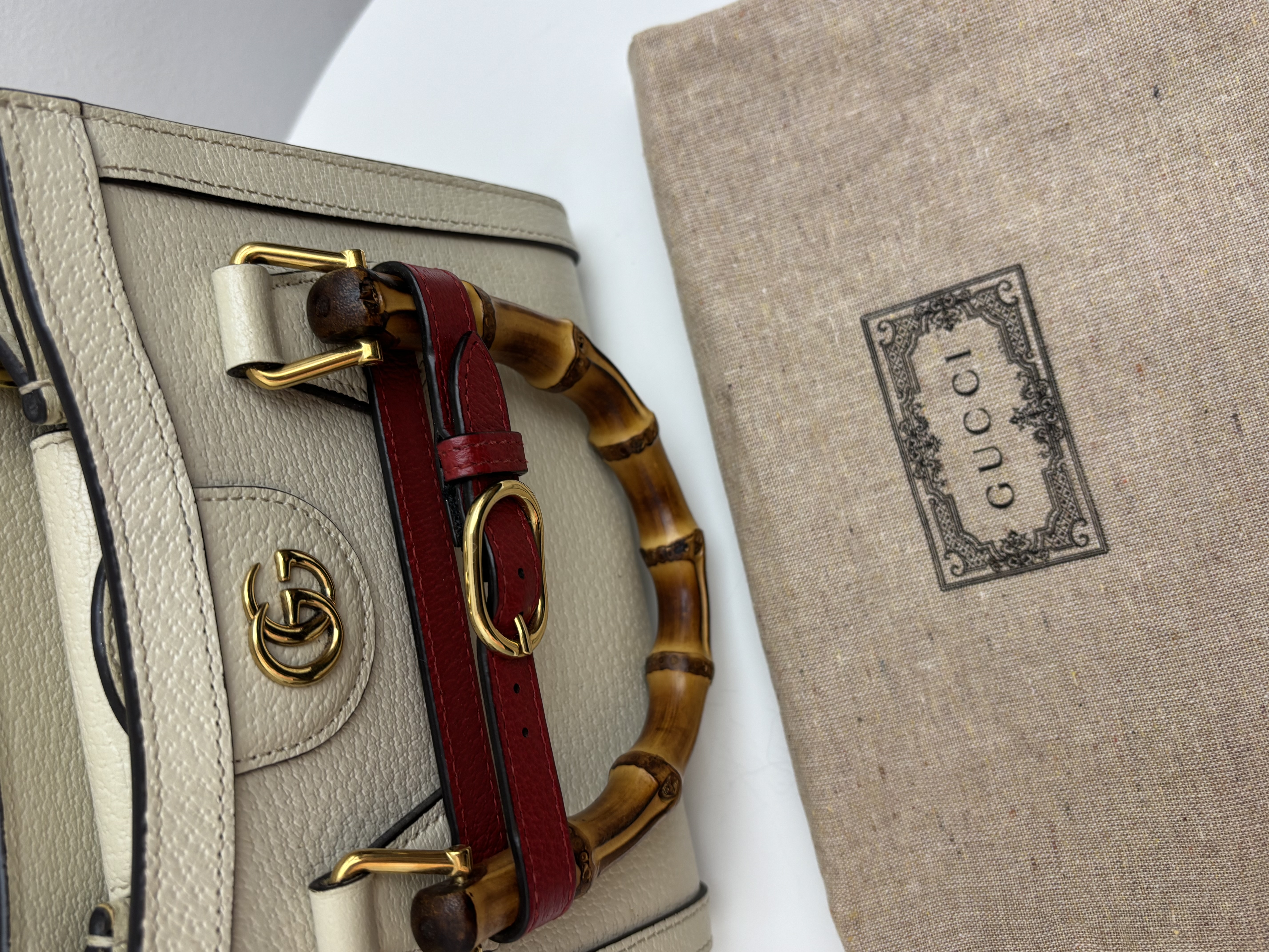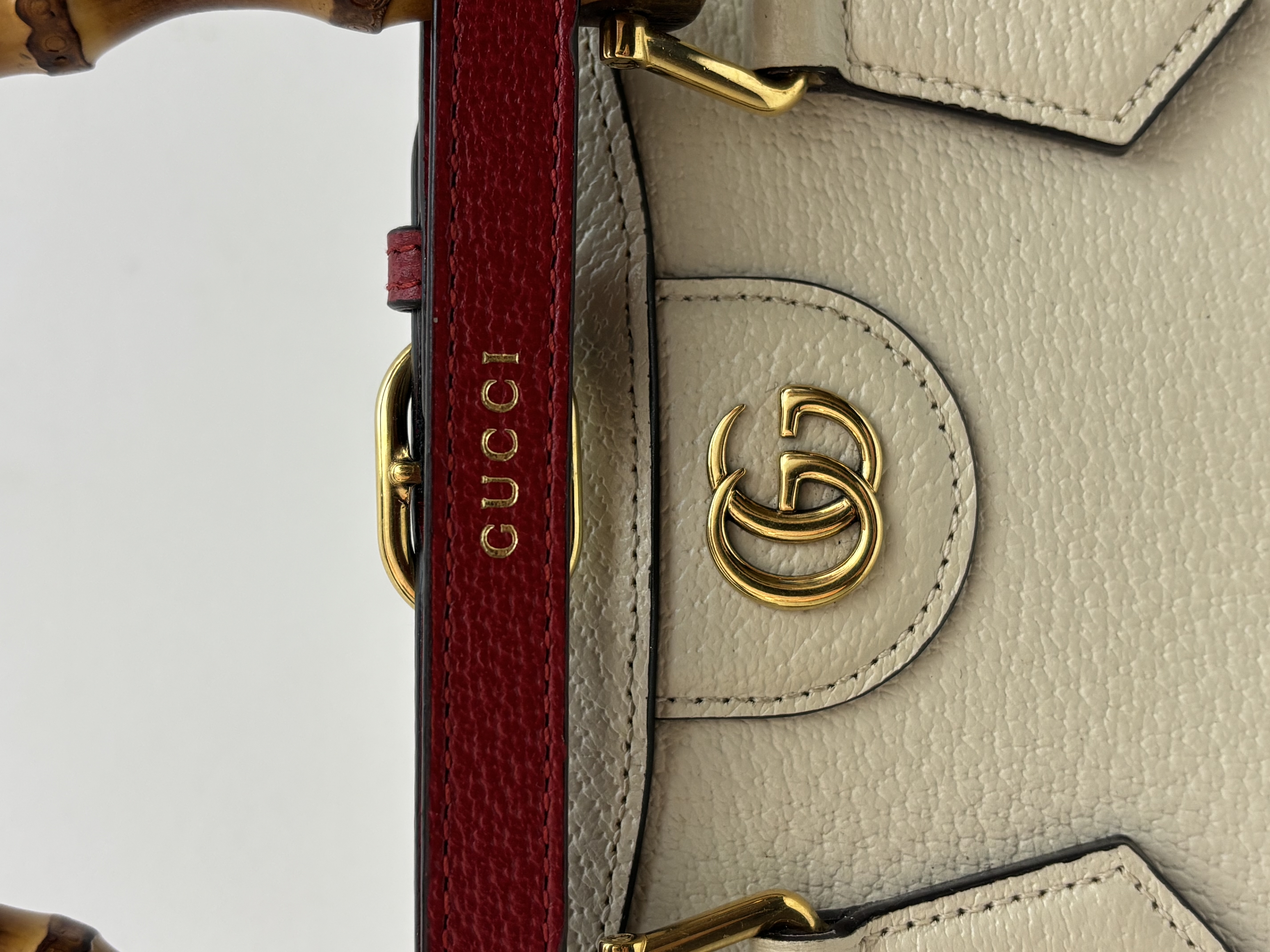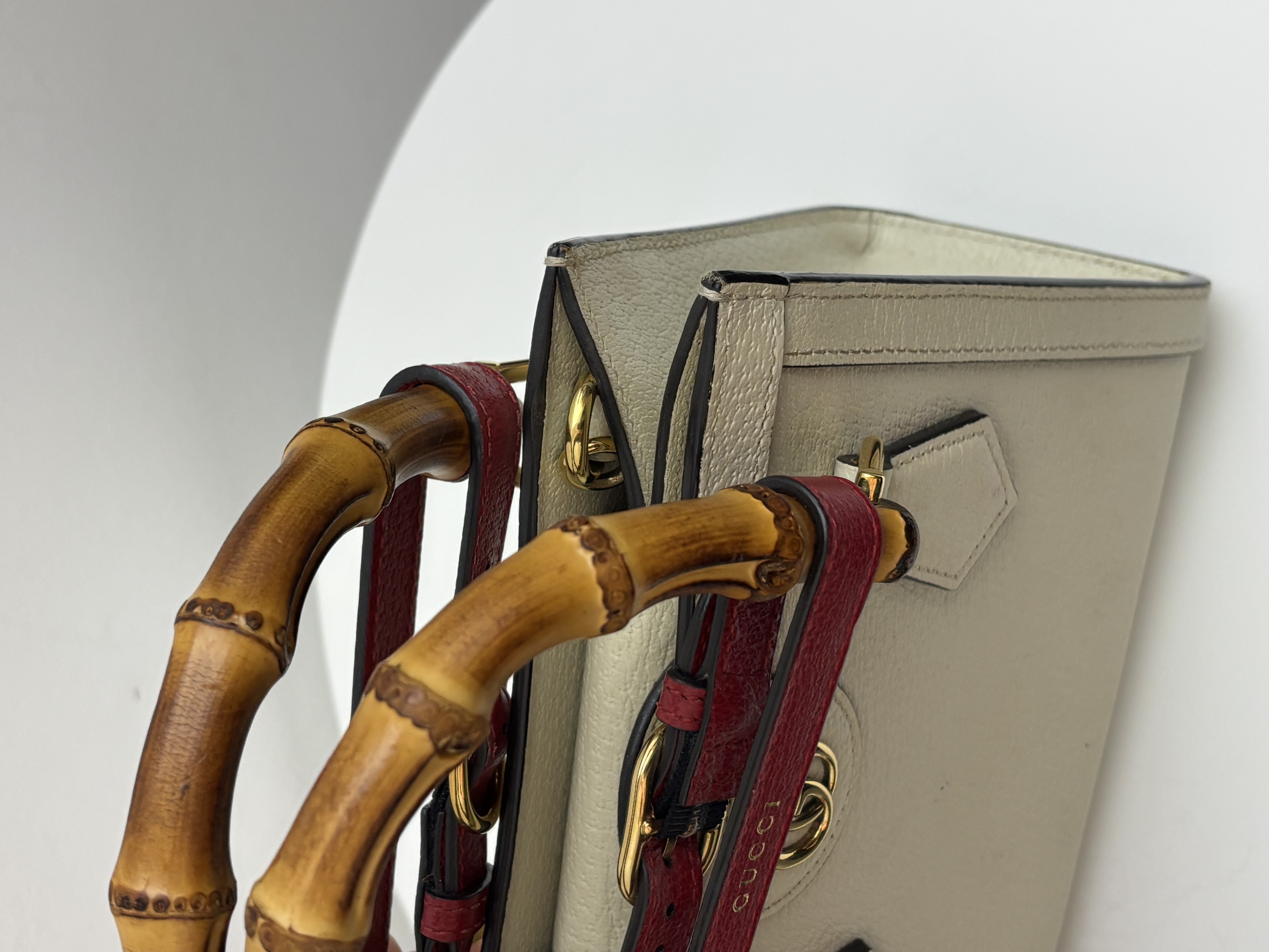 Elevate your accessory game with the Gucci Diana Mini Leather Tote Bag, a piece that beautifully bridges the gap between vintage inspiration and contemporary flair. This stunning tote is crafted from 100% premium white leather, providing a clean and sophisticated backdrop for its most famous feature: the burnished bamboo handles. The striking red leather trim adds a bold pop of color, making it a true statement piece for any wardrobe. Currently held in Slovenia, this bag presents in "like-new" condition with no visible signs of use, offering the allure of a boutique purchase with the character of a modern icon.