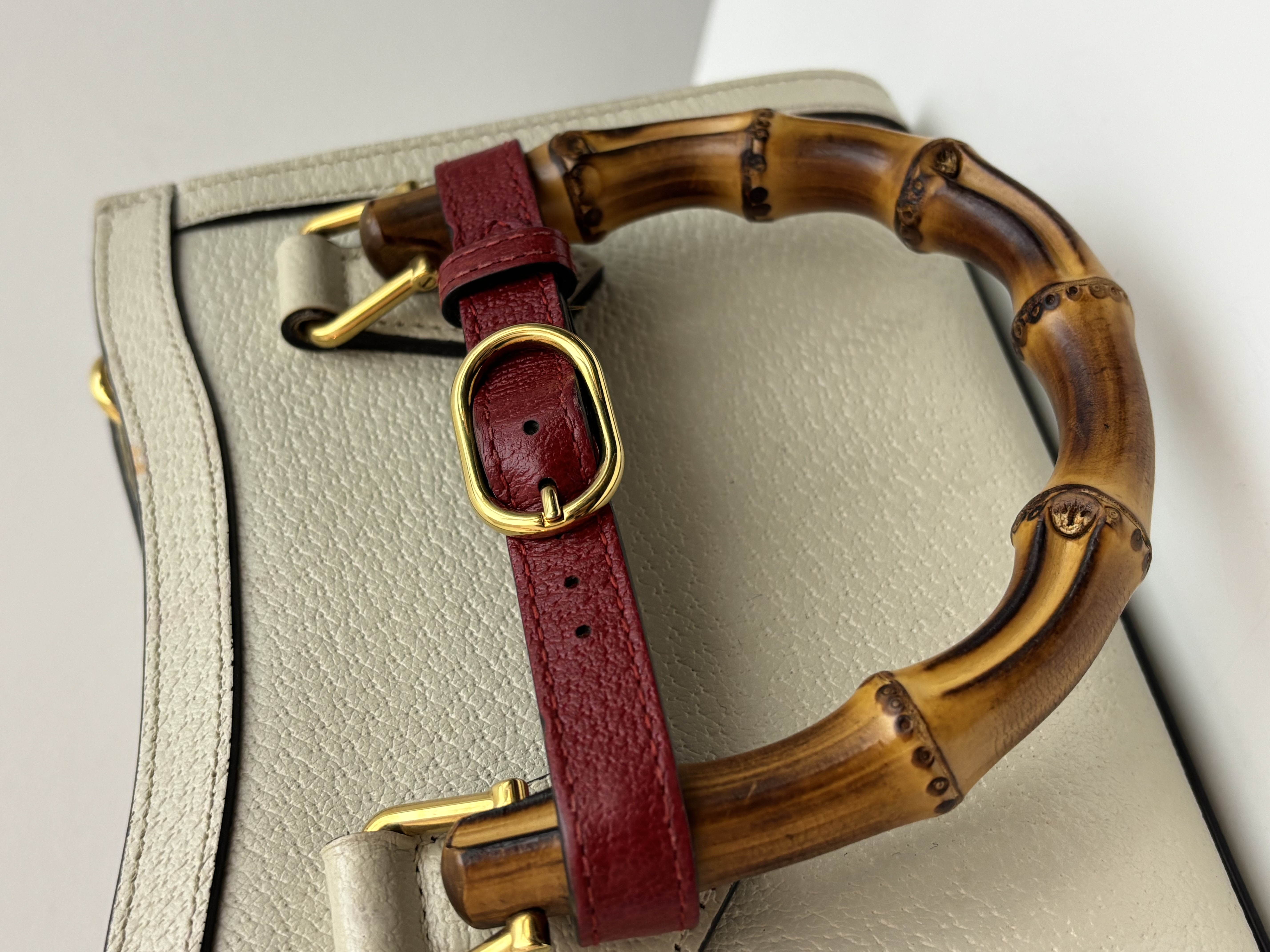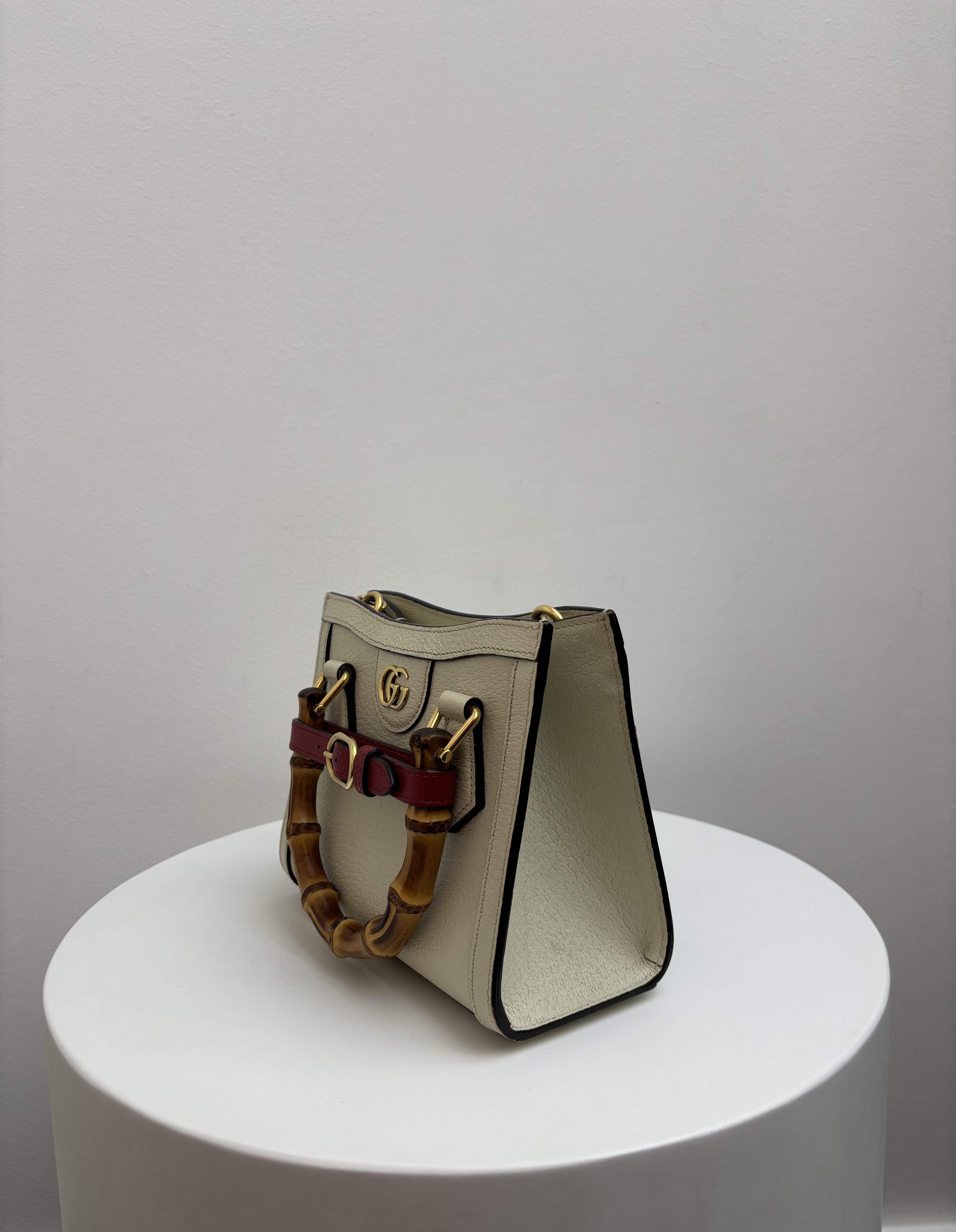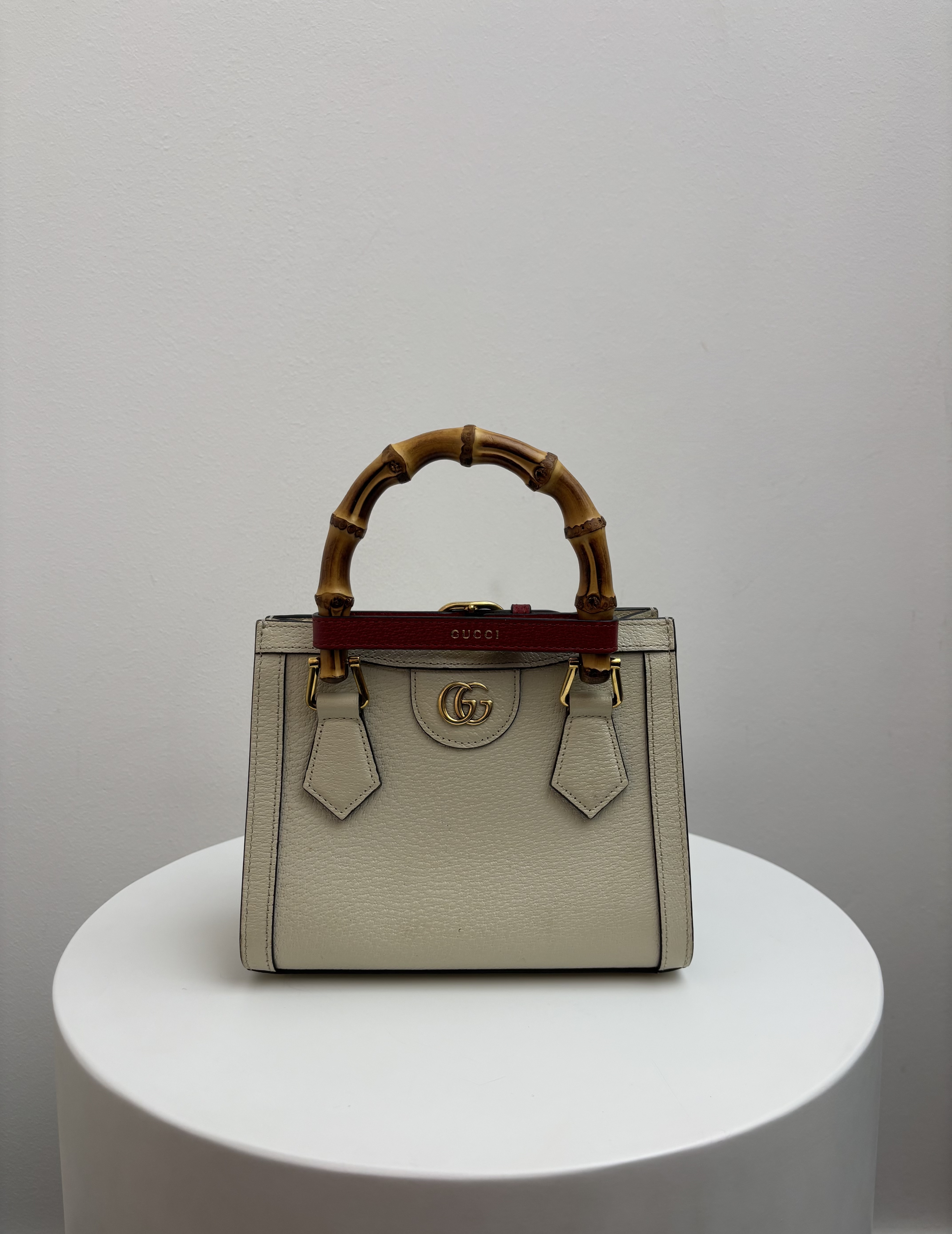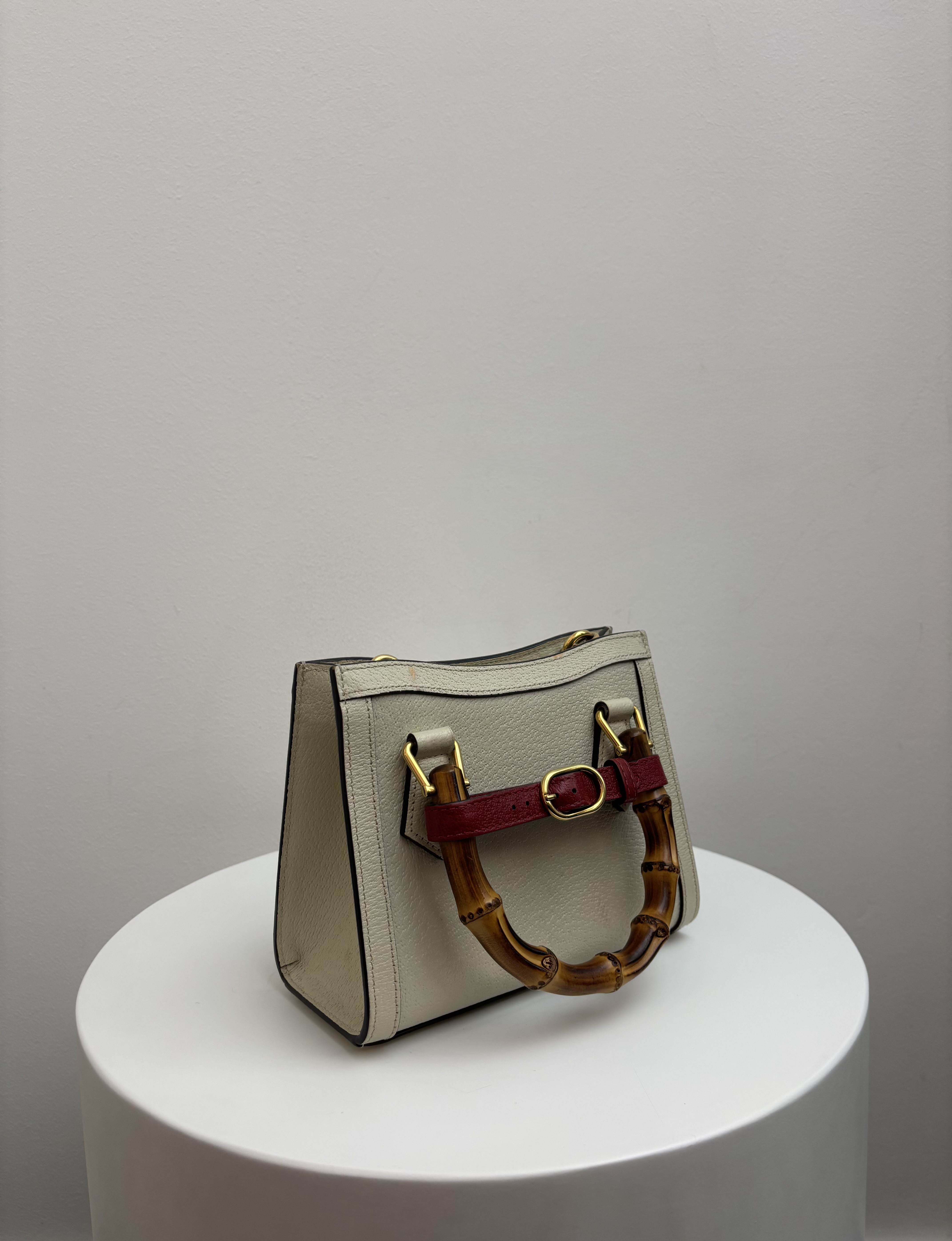 Elevate your accessory game with the Gucci Diana Mini Leather Tote Bag, a piece that beautifully bridges the gap between vintage inspiration and contemporary flair. This stunning tote is crafted from 100% premium white leather, providing a clean and sophisticated backdrop for its most famous feature: the burnished bamboo handles. The striking red leather trim adds a bold pop of color, making it a true statement piece for any wardrobe. Currently held in Slovenia, this bag presents in "like-new" condition with no visible signs of use, offering the allure of a boutique purchase with the character of a modern icon.