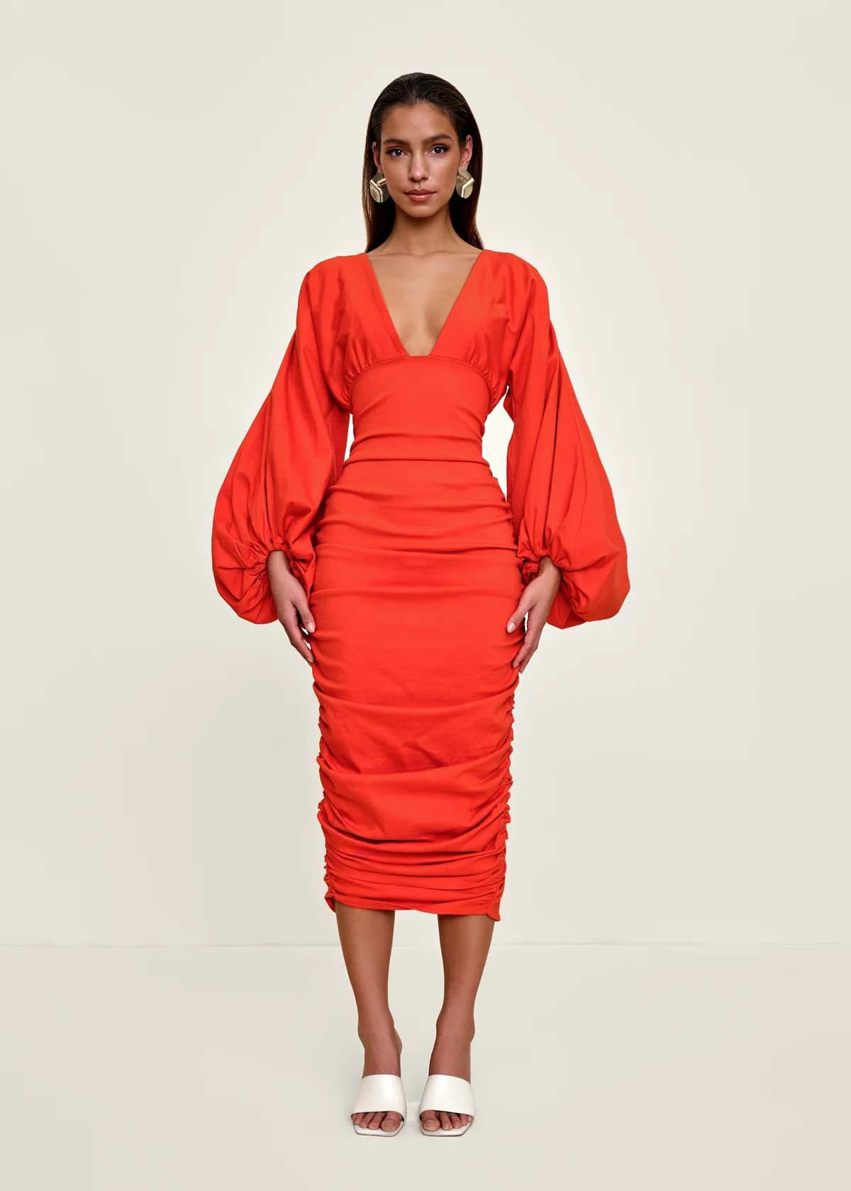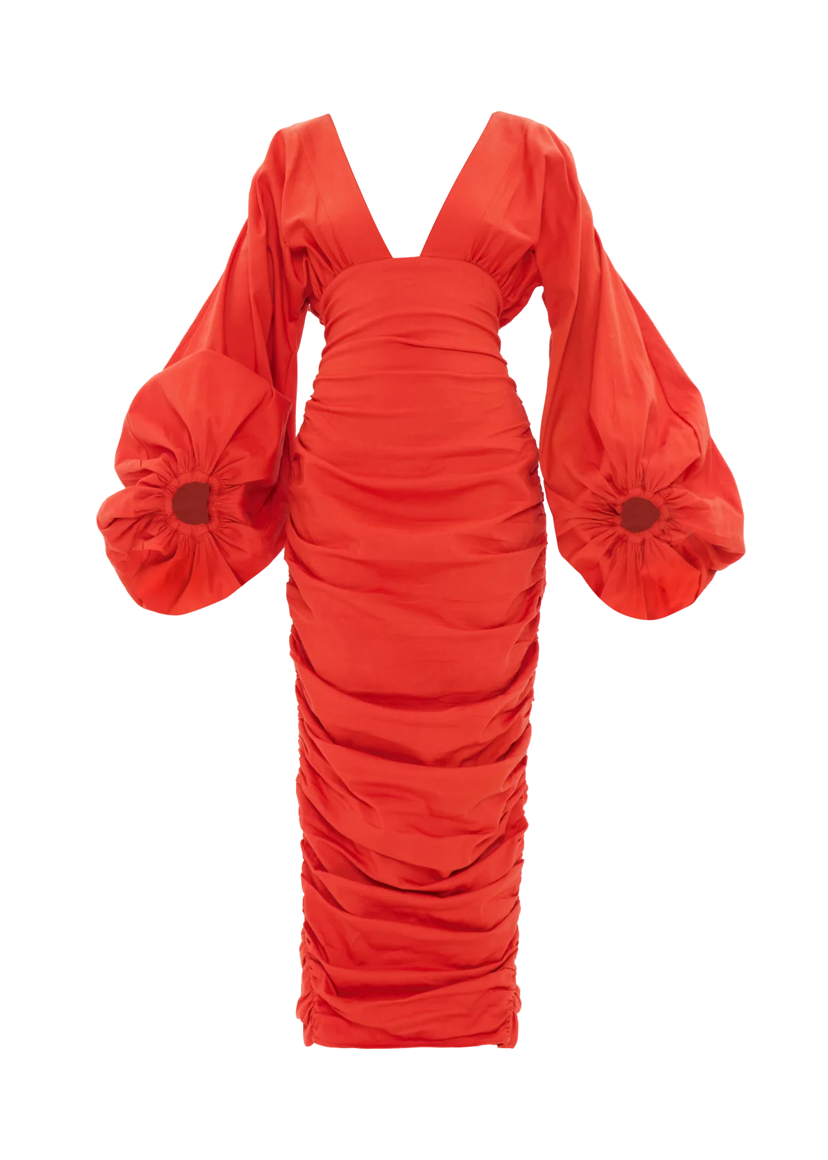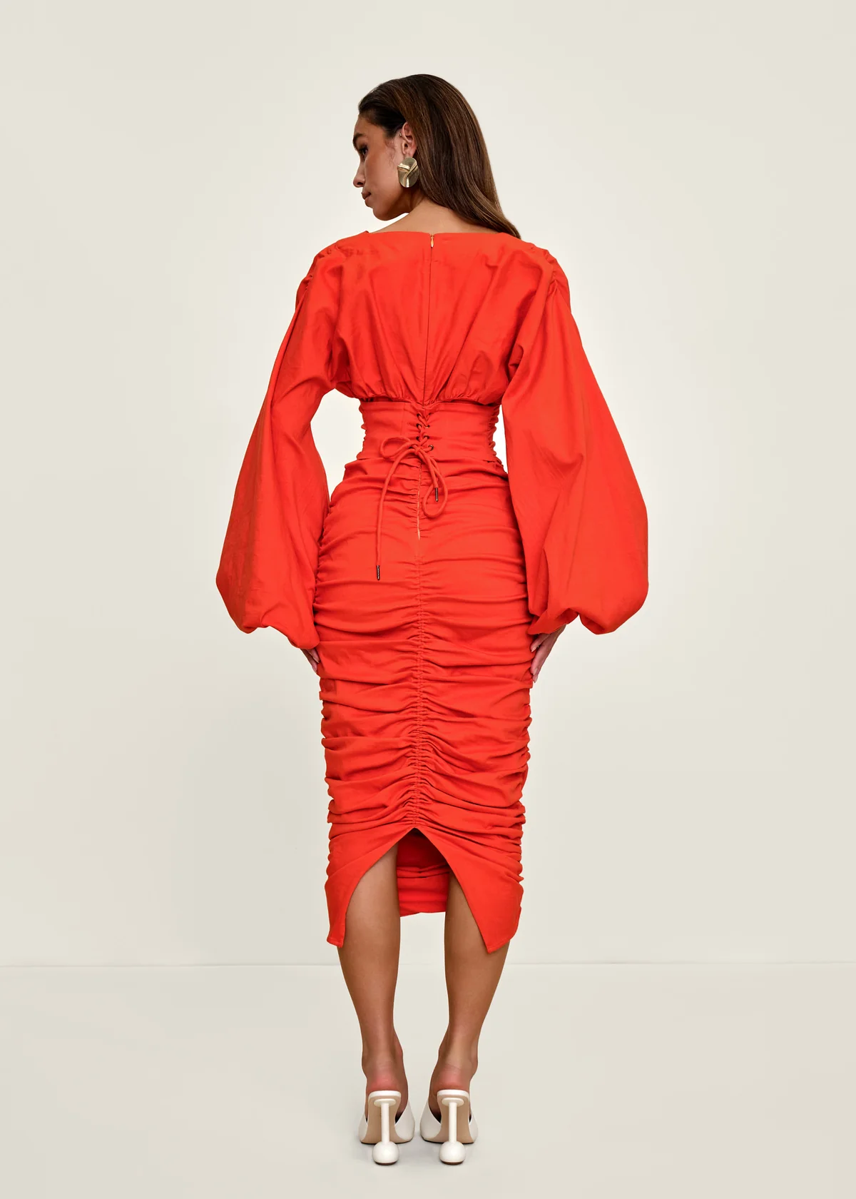 The Anida Midi Cotton Dress is a masterpiece of modern elegance and texture. This gathered midi-length dress features a deep plunging neckline that adds a touch of allure. The bubble sleeves, with their elasticated wrist detail, lend a whimsical and comfortable finish. A separate, functional corset is seamlessly attached at the side seams, providing structure and shaping. The skirt boasts an exquisite ruched design, creating a dynamic, textured effect that moves beautifully with you. A center back hem slit adds a hint of sophistication, while the invisible zip closure ensures a streamlined silhouette. Crafted from soft cotton, the Anida dress merges comfort with high-fashion appeal for a look that’s both stylish and effortless.