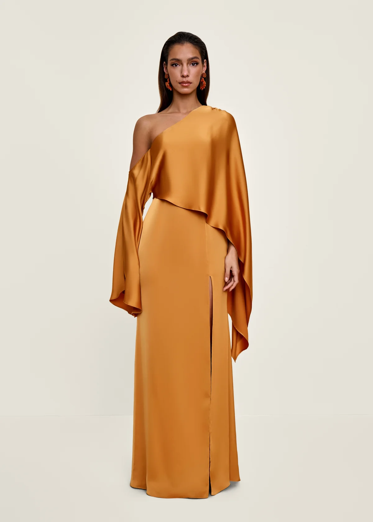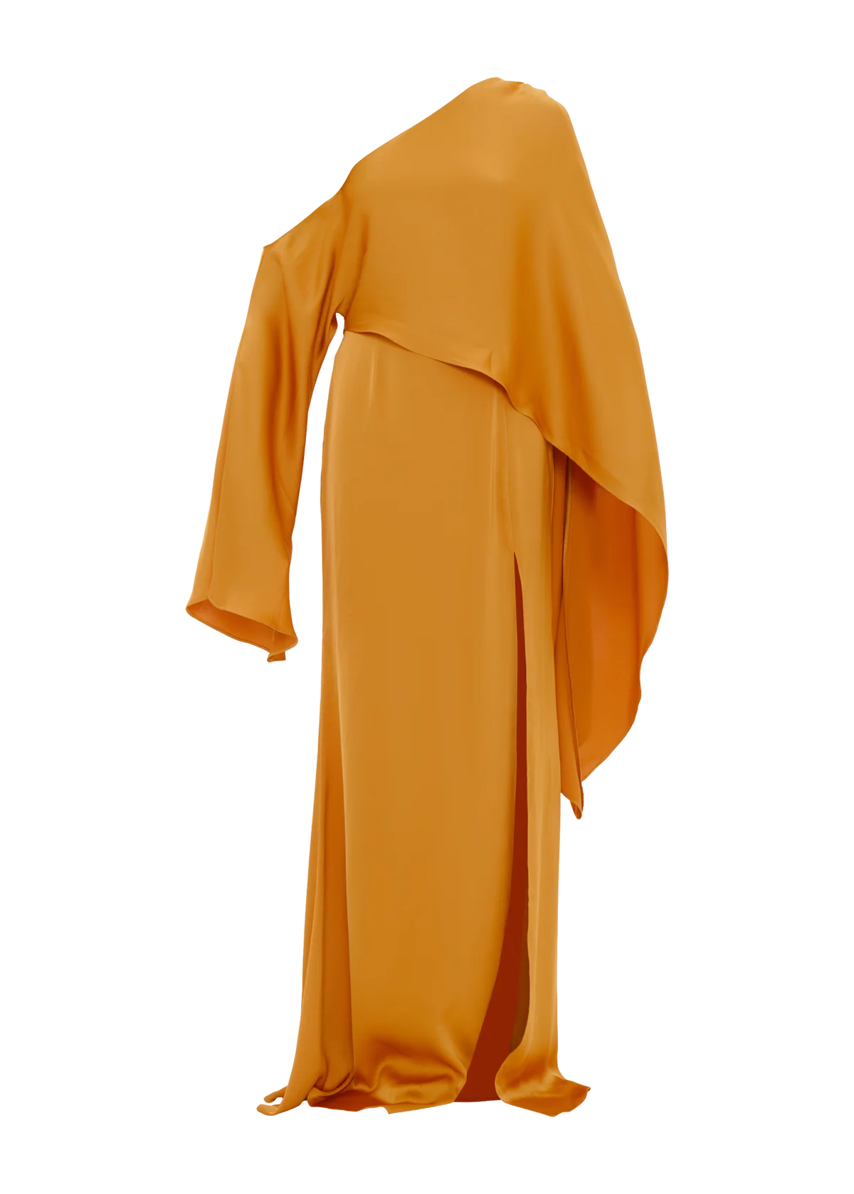 The Leena Full Length Dress is a striking asymmetrical maxi designed to capture liquid gold. In vibrant metallic gold, this dress features an off-the-shoulder cape bodice overlay that adds an air of dramatic elegance. The unique mono-sleeve design highlights the gathered shoulder detail, creating a sophisticated and eye-catching effect. A thigh-high front slit introduces a touch of allure, allowing for graceful movement and a glimpse of the leg. The silk satin finish ensures a smooth, streamlined fit. Perfect for making a memorable entrance at any event, the Leena dress combines bold color with exceptional design.
