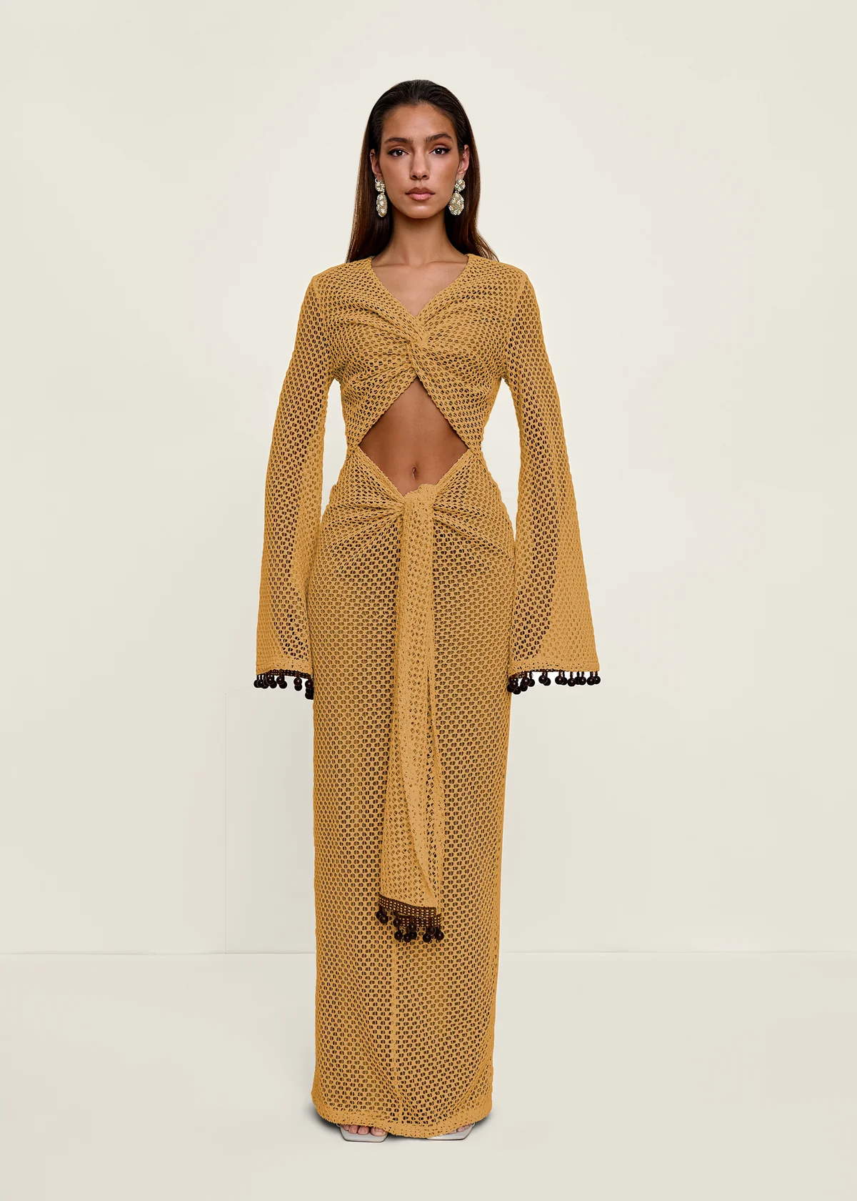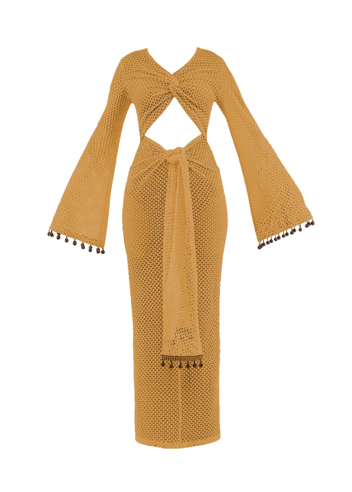 Crafted from open weave mesh fabric, the Teri Crochet Dress is a cream-colored beauty that features a bodice that twists gracefully at the bust, enhancing your silhouette with its unique structure. A center front waist cut-out adds a hint of allure, while the skirt's twisting and knotting with long sash ties secured at the center front creates a dynamic, fluid look. Long, flared sleeves lend a dramatic touch, and beaded trim on the sleeve hem and sash tie ends adds a subtle sparkle and refined detail. The center back invisible zipper closure ensures a seamless finish. Ideal for making a sophisticated statement, the Teri Crochet Dress is perfect for special occasions where you want to stand out with grace.
