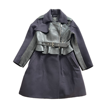 This Mugler x H&M cropped denim jacket offers a bold, sculpted silhouette with a corset-like waist detail. Made from slightly stretchy denim, it features a contrasting stretch jersey panel that enhances the figure. The design includes a structured padded yoke, extra-long sleeves with buttoned cuffs, and strong shoulders for a striking look. A collared neckline, press-stud front closures, and flap chest pockets with metal buttons add to its edgy appeal. Finishing touches include an appliqué designer logo at the back waist and engraved Mugler logo buttons, ensuring a signature luxury feel.