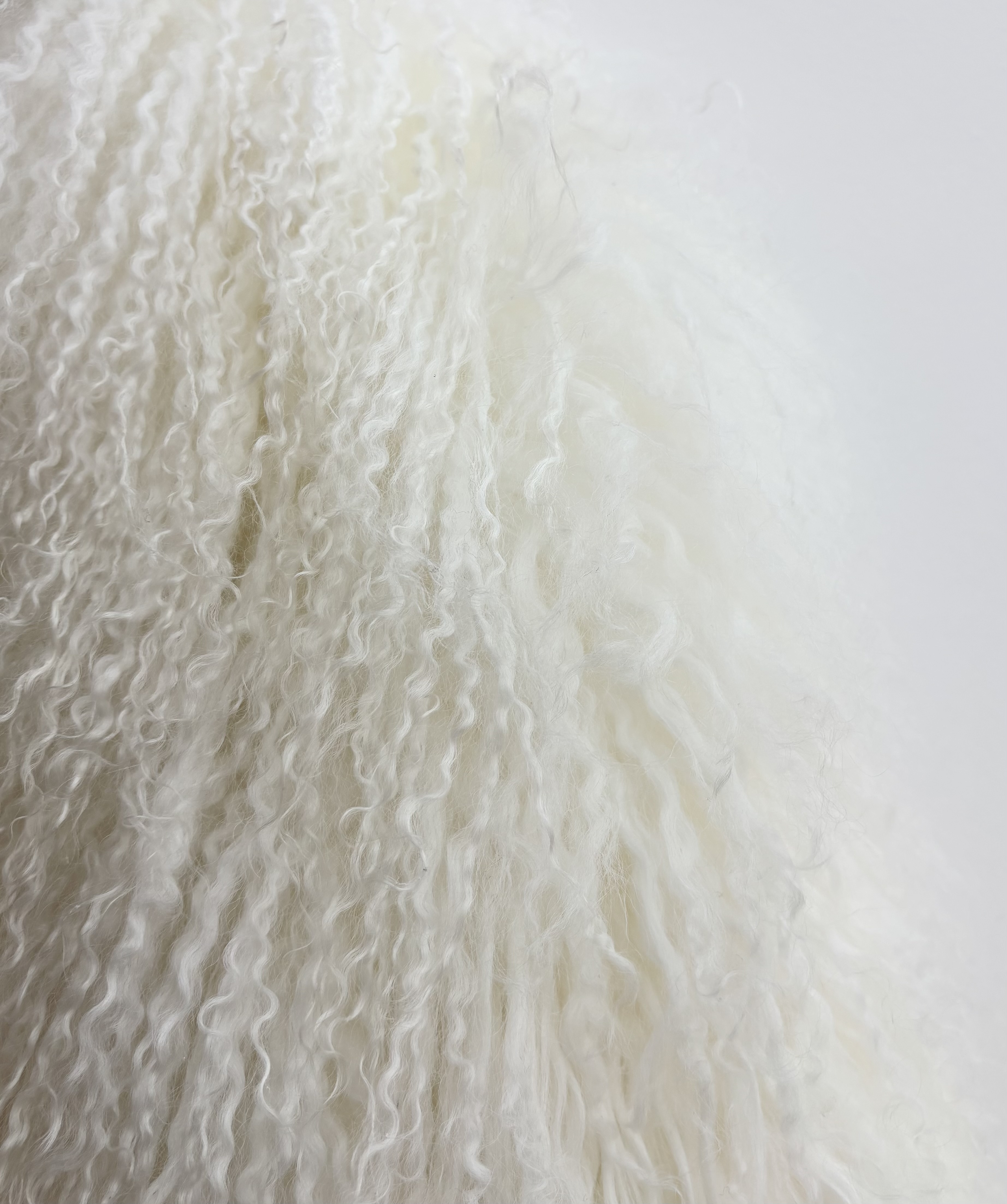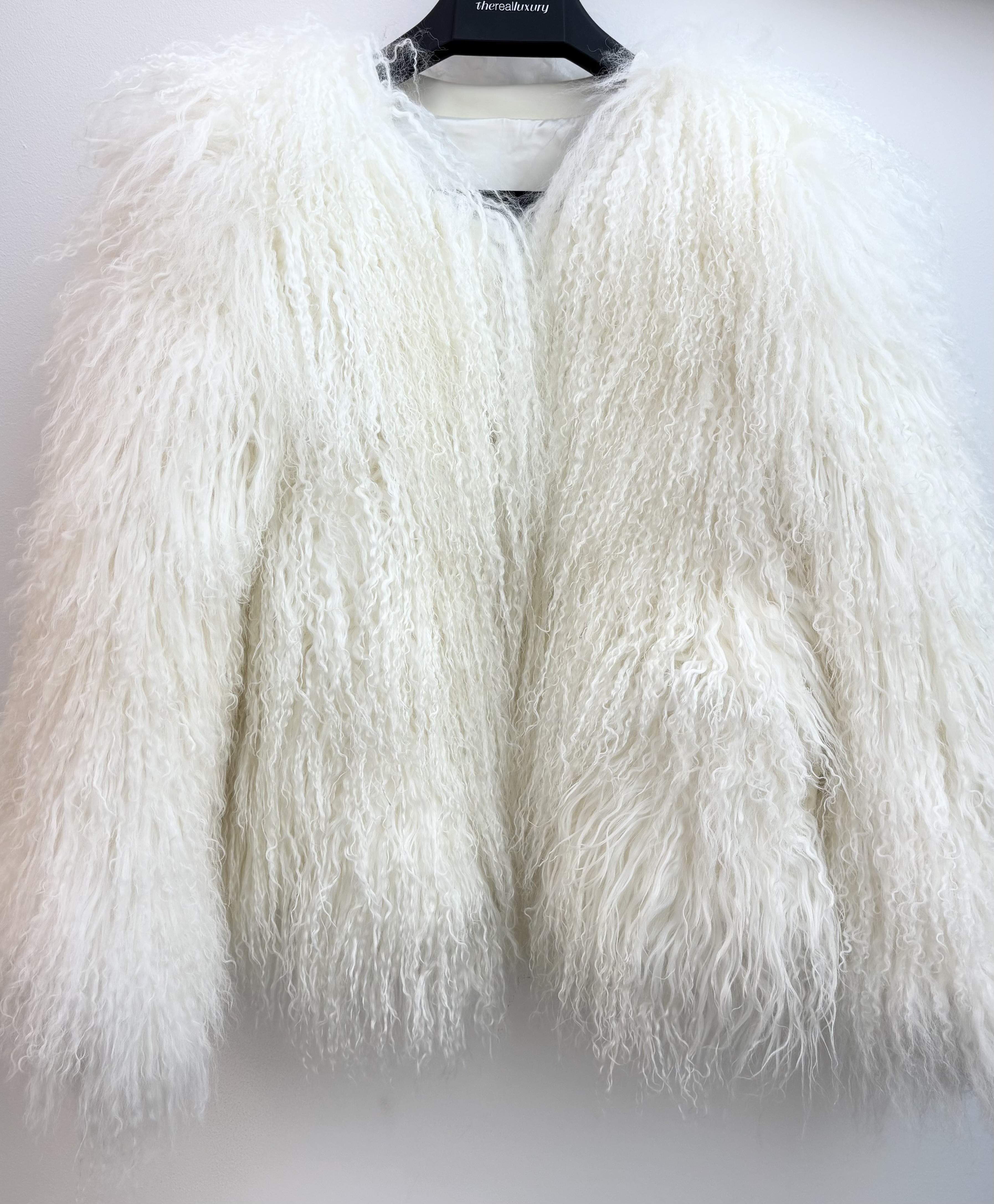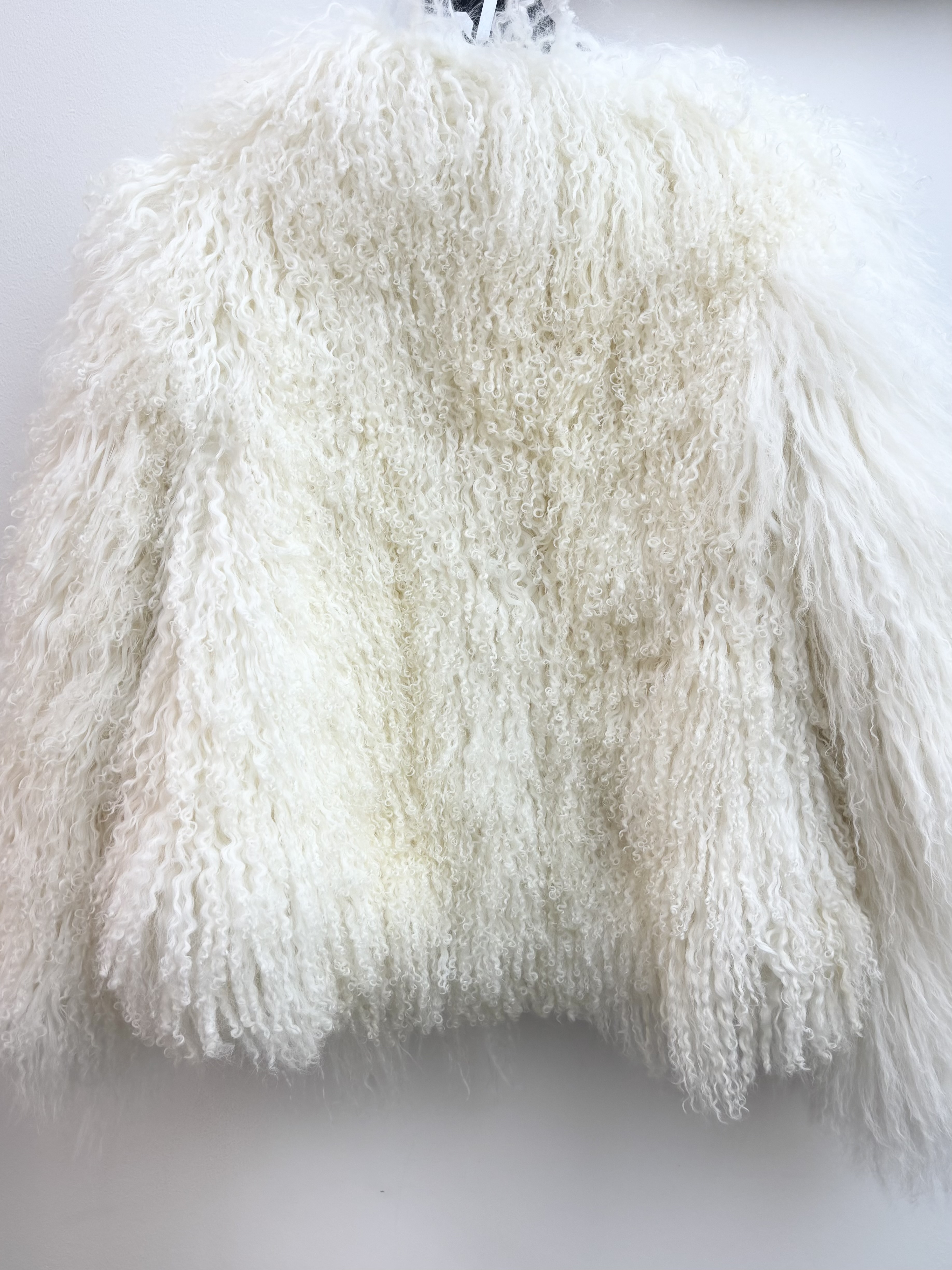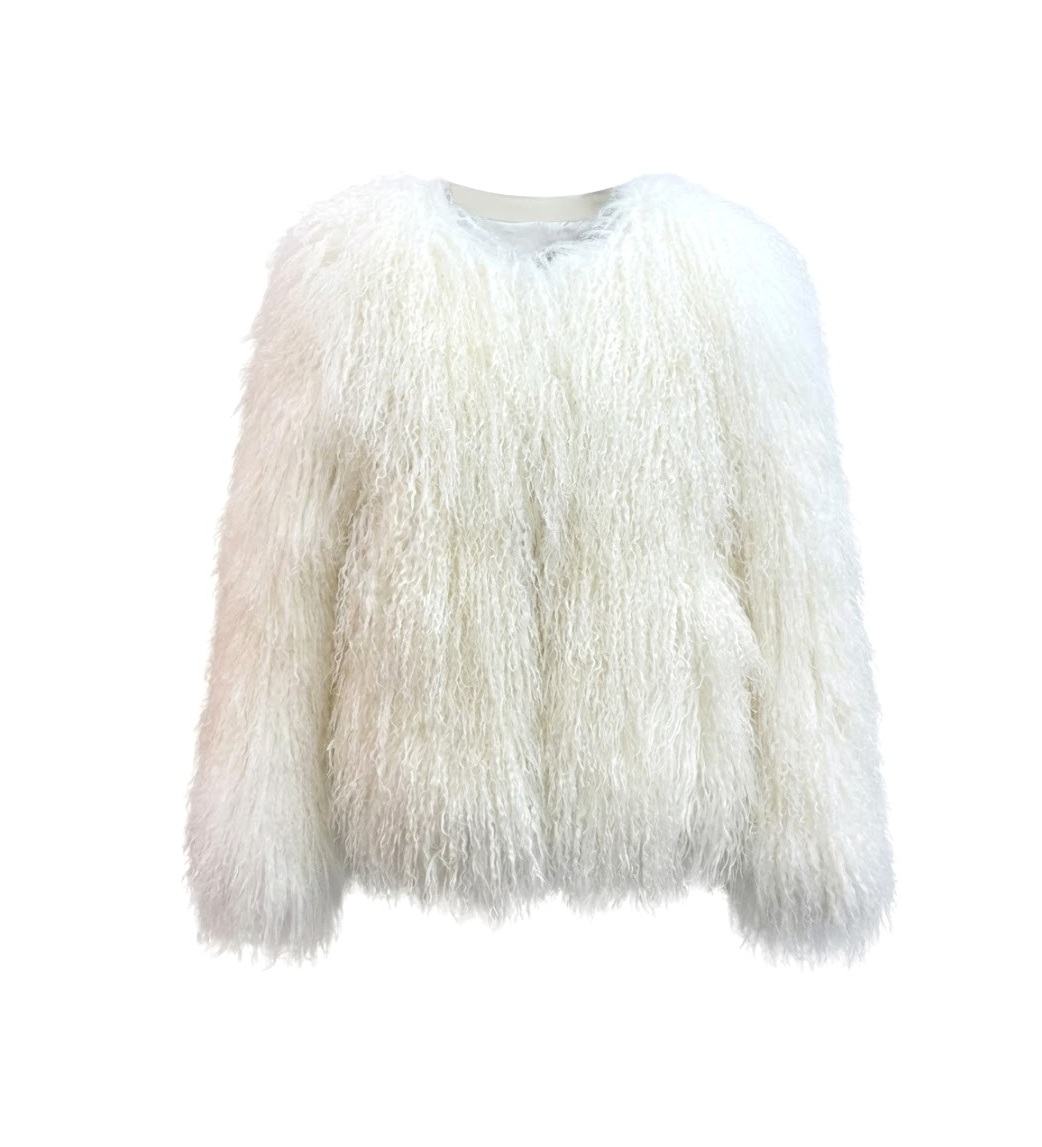 Crafted from genuine fur this statement piece features the breed's signature long, crimped tendrils that create a dramatic, voluminous silhouette with an incredibly soft and fluffy hand feel. Presented in a pristine white hue, the jacket captures an ethereal, cloud-like aesthetic perfect for high-impact winter styling. It is designed with a relaxed, collarless structure and includes a smooth, matching white lining that ensures a comfortable glide over your layers. Whether paired with an evening gown for a gala or used to elevate a casual denim look, this coat delivers effortless boho-luxe glamour.