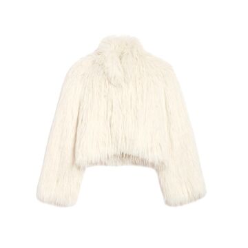 Crafted from genuine fur this statement piece features the breed's signature long, crimped tendrils that create a dramatic, voluminous silhouette with an incredibly soft and fluffy hand feel. Presented in a pristine white hue, the jacket captures an ethereal, cloud-like aesthetic perfect for high-impact winter styling. It is designed with a relaxed, collarless structure and includes a smooth, matching white lining that ensures a comfortable glide over your layers. Whether paired with an evening gown for a gala or used to elevate a casual denim look, this coat delivers effortless boho-luxe glamour.