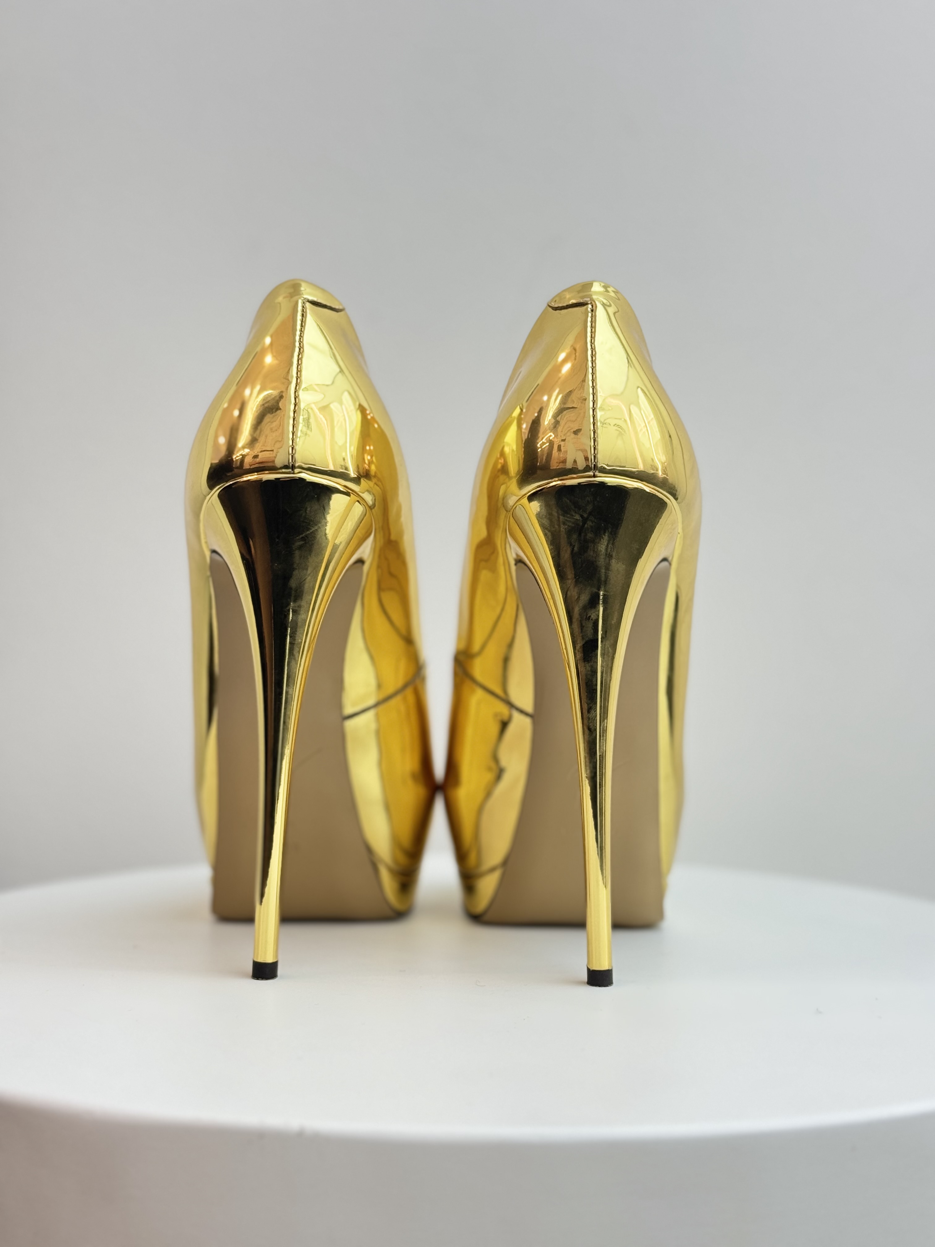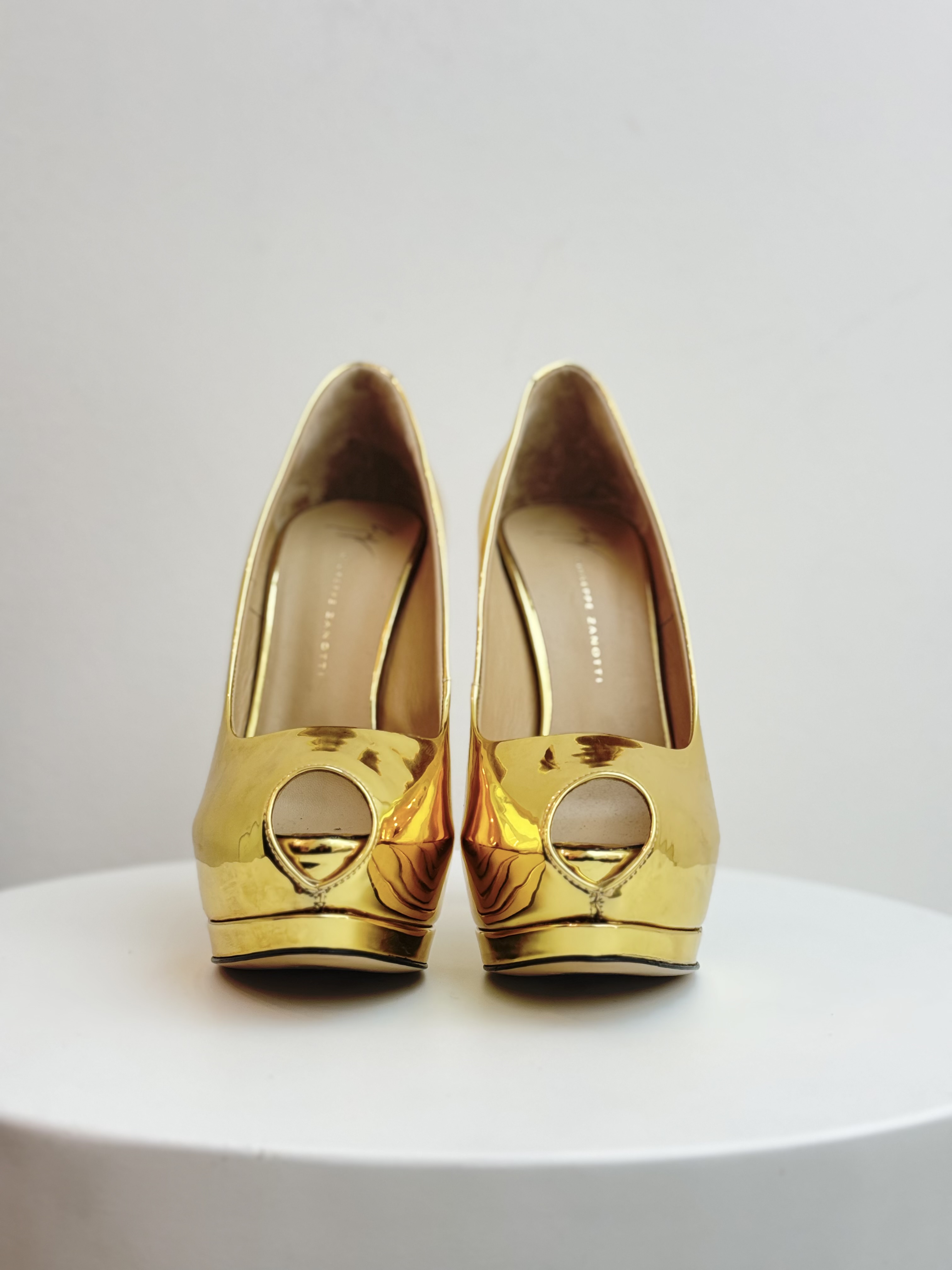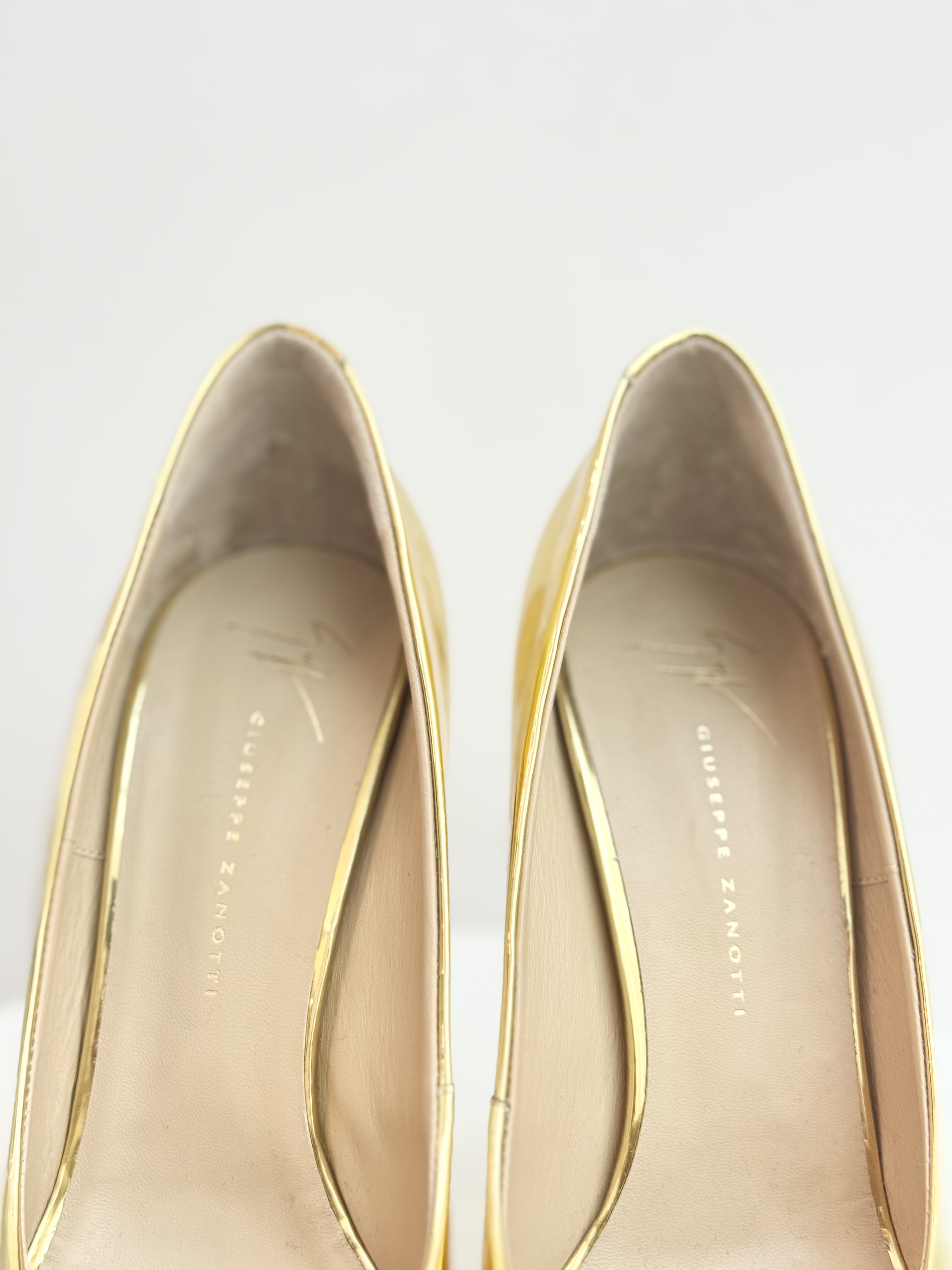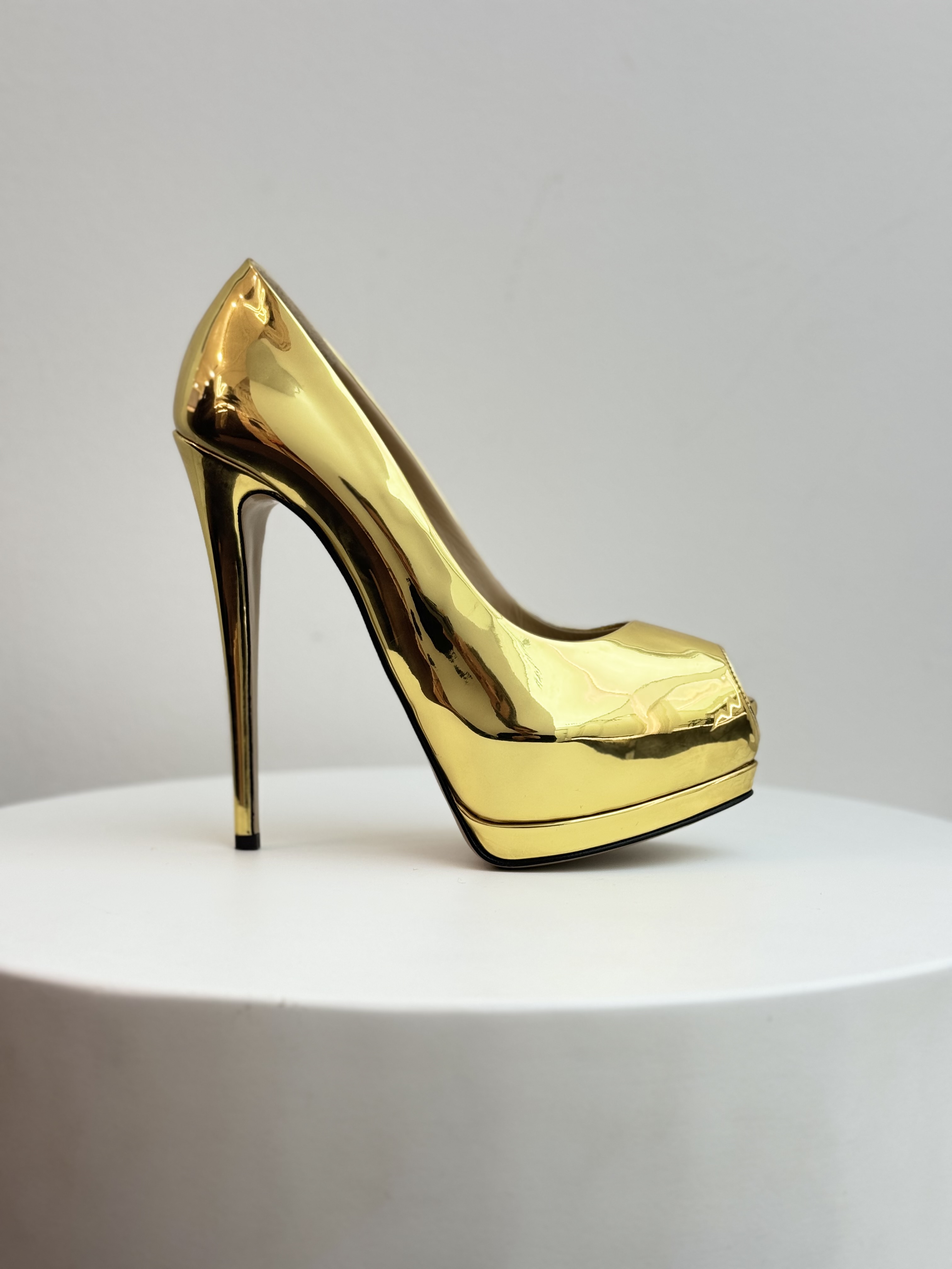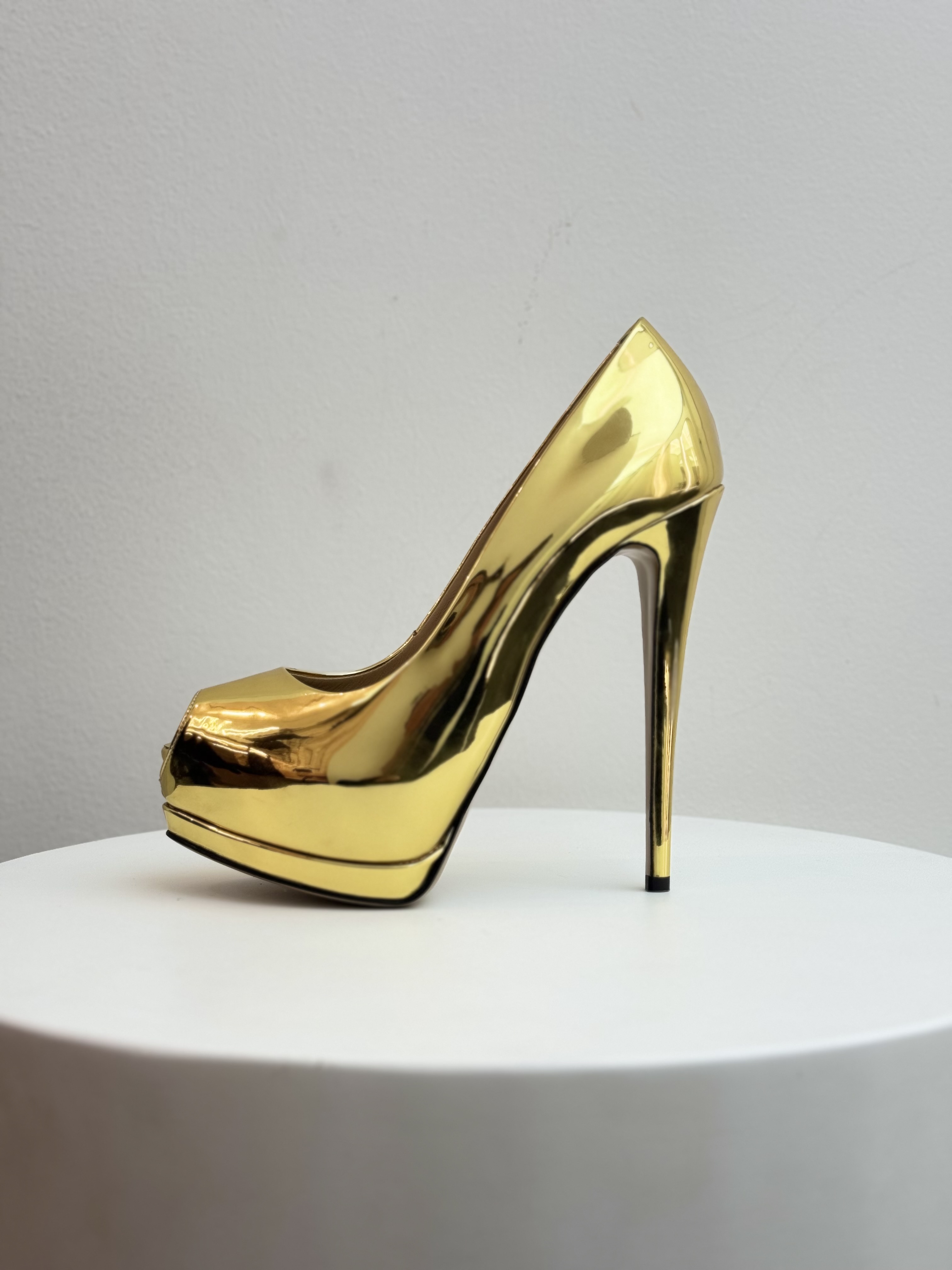 The Giuseppe Zanotti Gold Pumps are a high-glamour footwear choice characterized by their high-shine metallic finish and signature Italian craftsmanship. These statement heels typically feature a peep-toe design, a substantial platform sole, and a towering stiletto heel. Crafted in Italy, they are constructed from premium materials like laminated mirror-effect leather or calf leather, paired with a branded leather insole for a polished luxury feel. The striking gold-tone aesthetic makes them a popular choice for red carpets and evening events, offering a blend of contemporary allure and classic femininity.