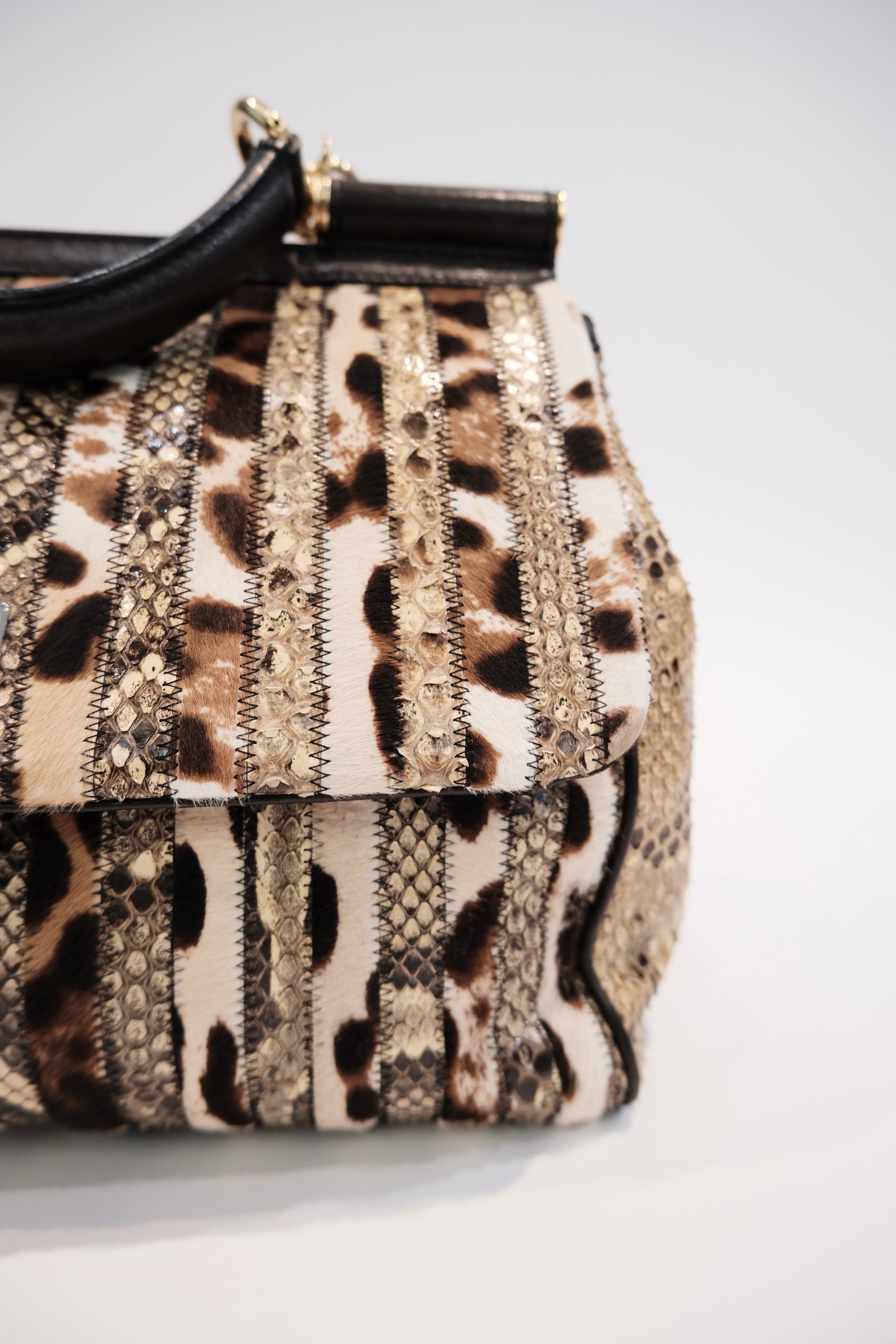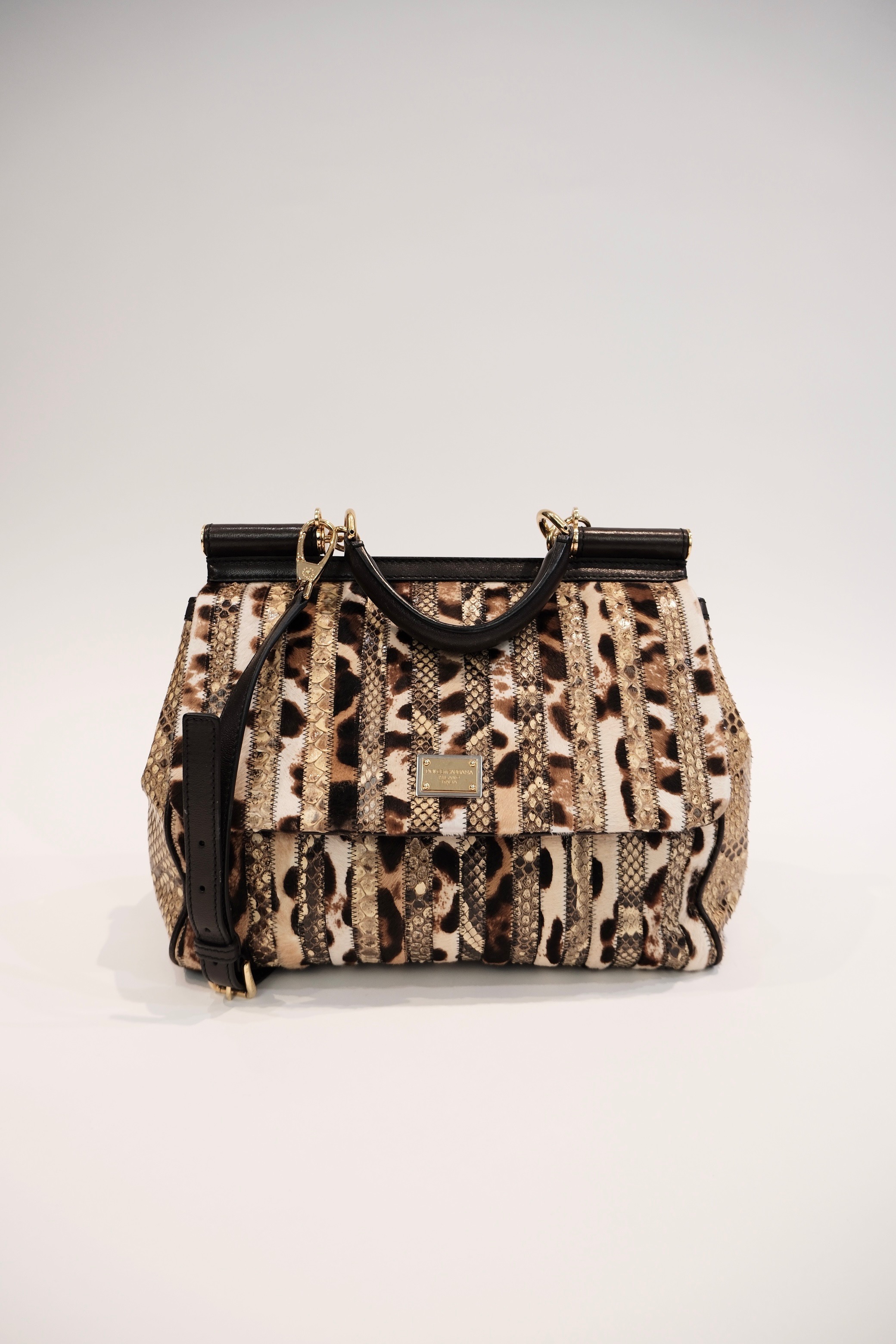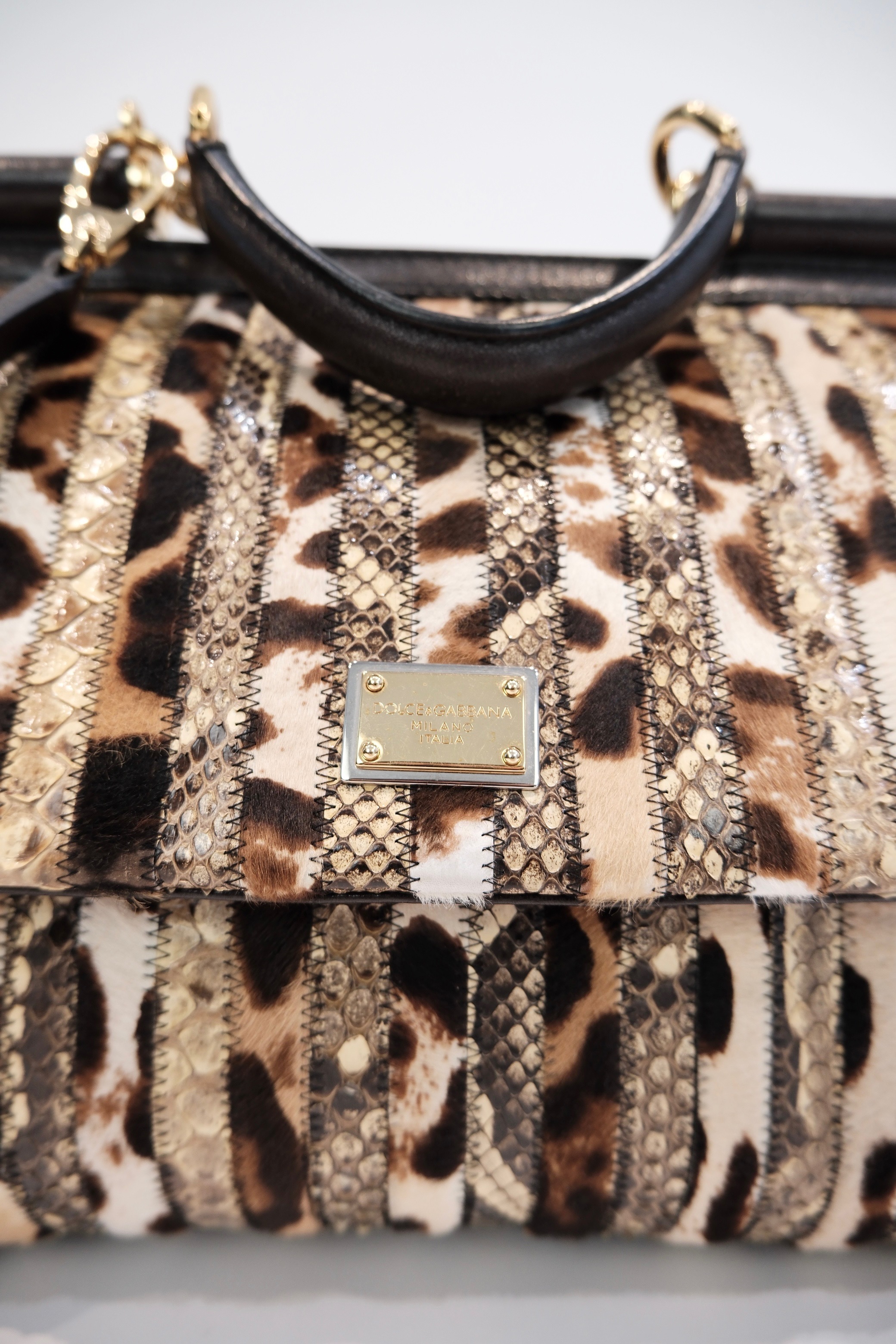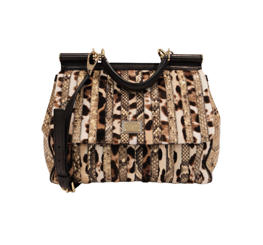 The Dolce & Gabbana Foldover Miss Sicily Heritage Bag is a statement accessory that blends Italian craftsmanship with distinctive style. Crafted from luxurious leather, this bag features a striking multicolor pattern with animal and textured details, ensuring a unique and sophisticated look. The spacious interior and secure foldover design make it both practical and stylish, while the gold-tone hardware and iconic logo plaque add a touch of elegance. Perfect for elevating any ensemble, this bag transitions seamlessly from day to evening wear, making it an essential addition to any fashion-forward wardrobe.