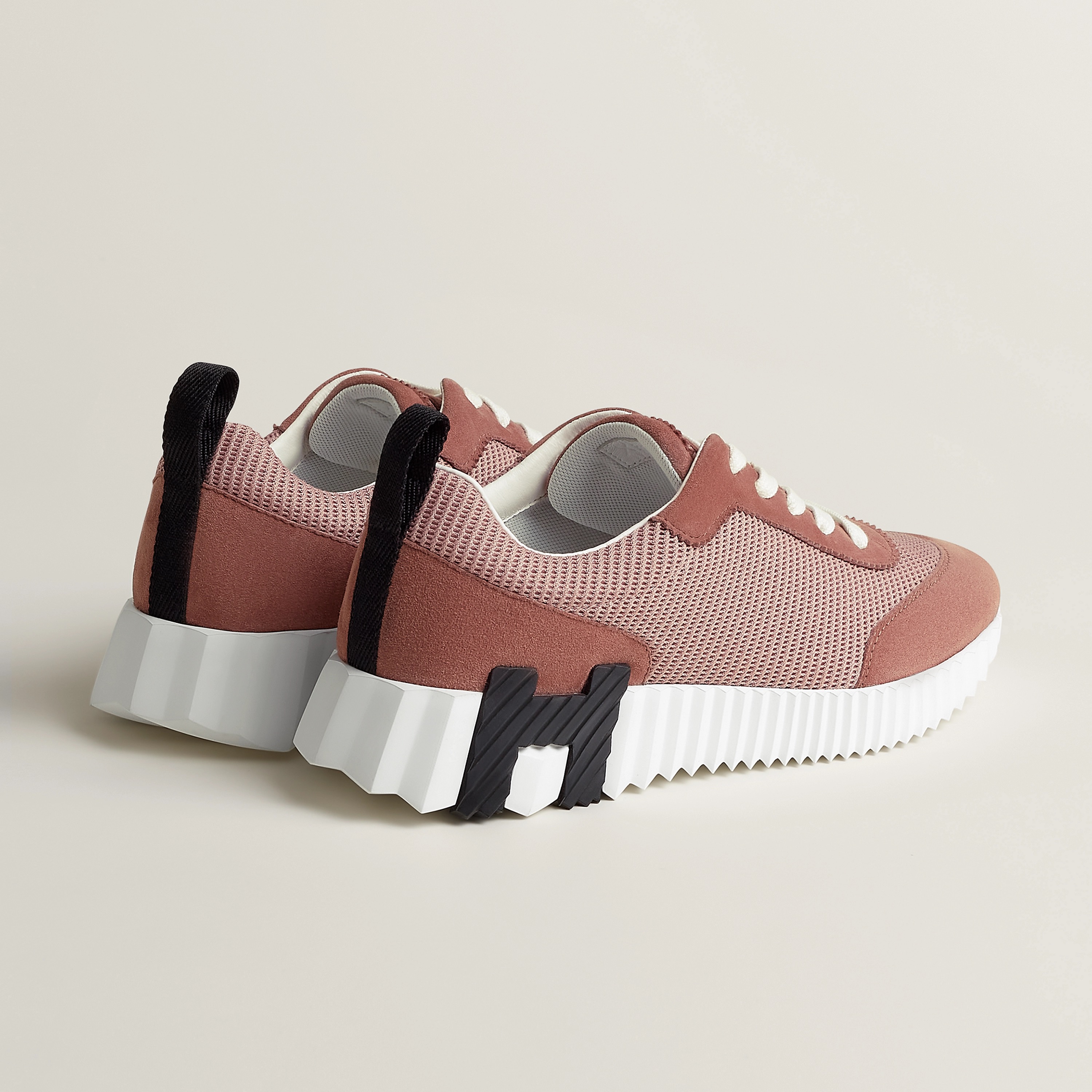 Showing a clean pair of heels, the Bouncing sneaker ventures into urban effervescence. So light that it no longer appears to touch the ground and full of untamed energy, it turns every moment into a high-speed adventure. Thinking big, it features a signature "H en biais" motif in a bold, oversized format.