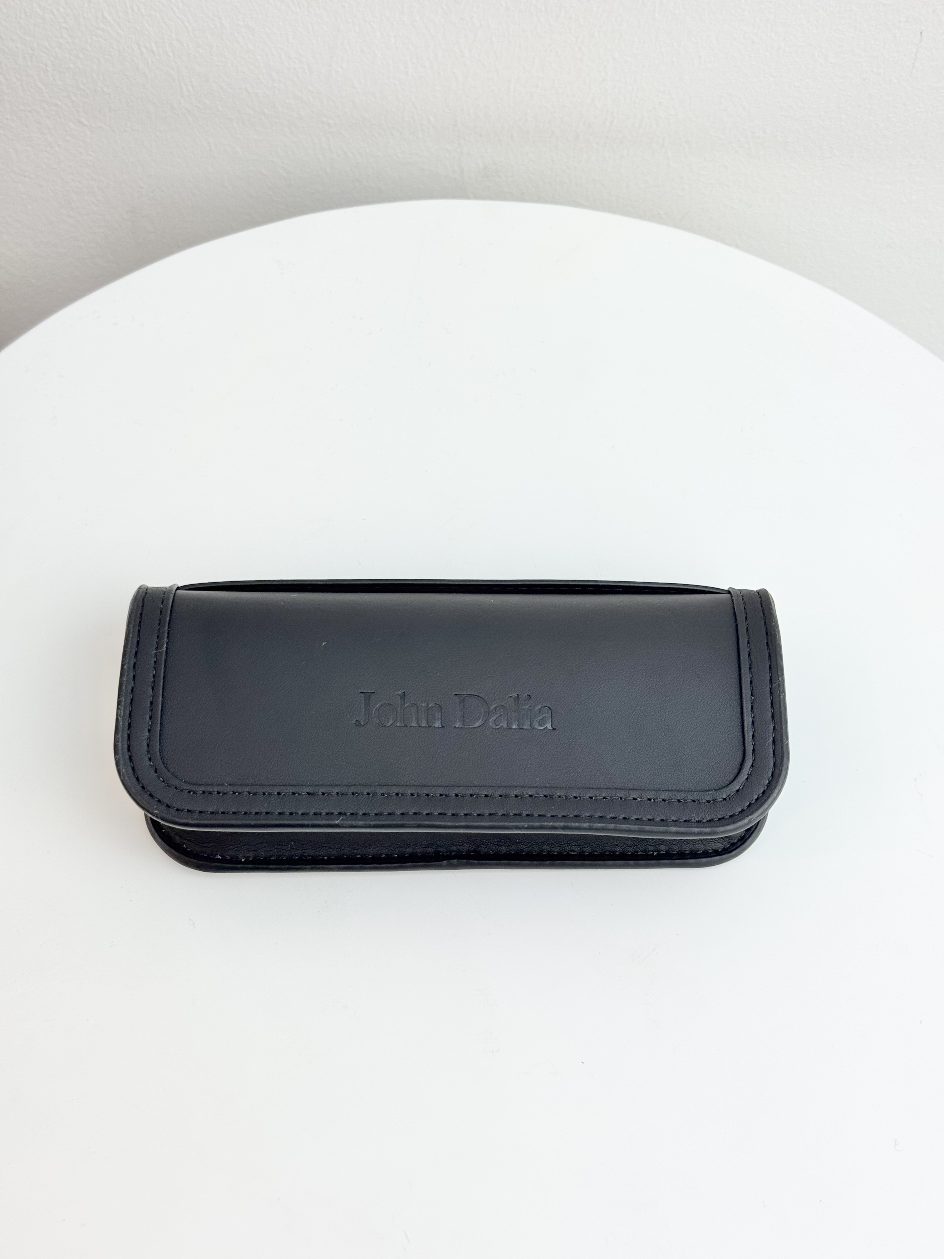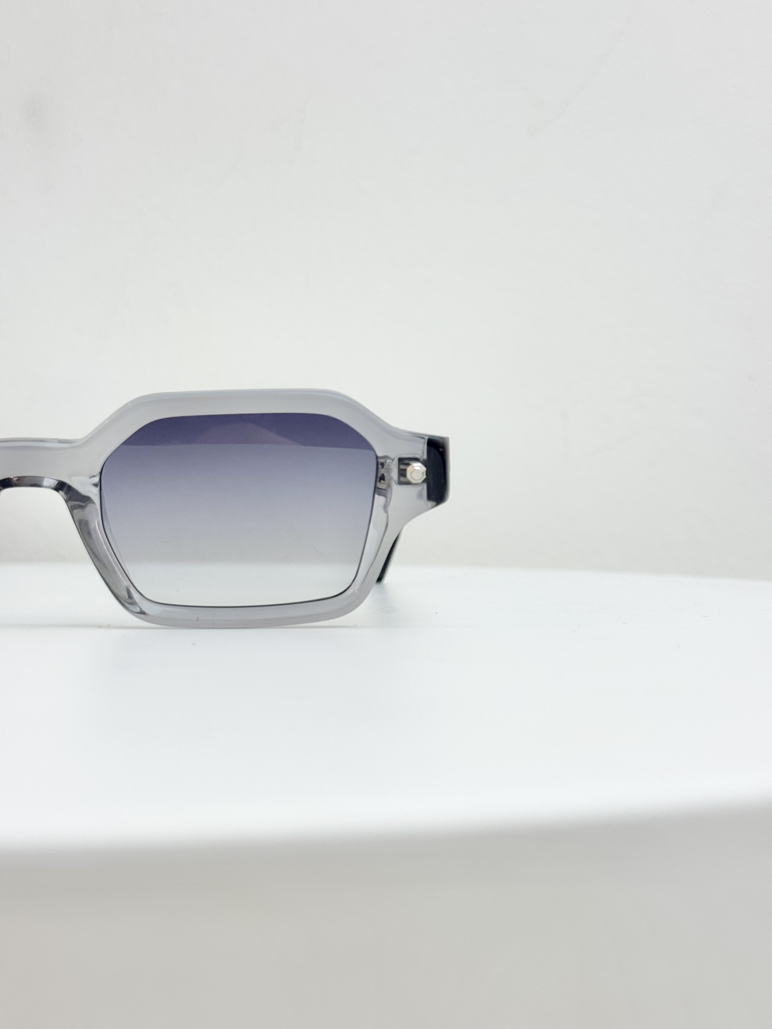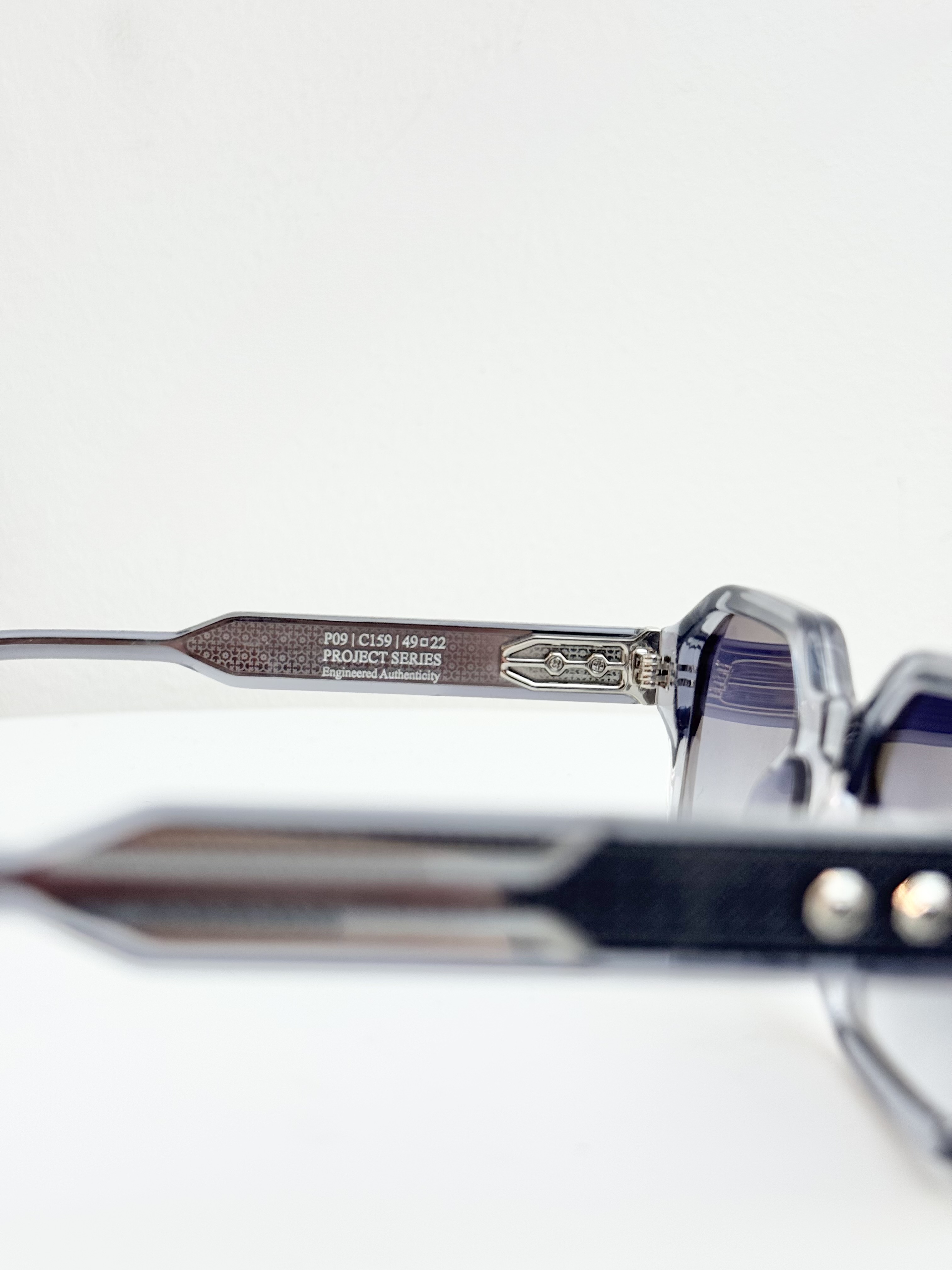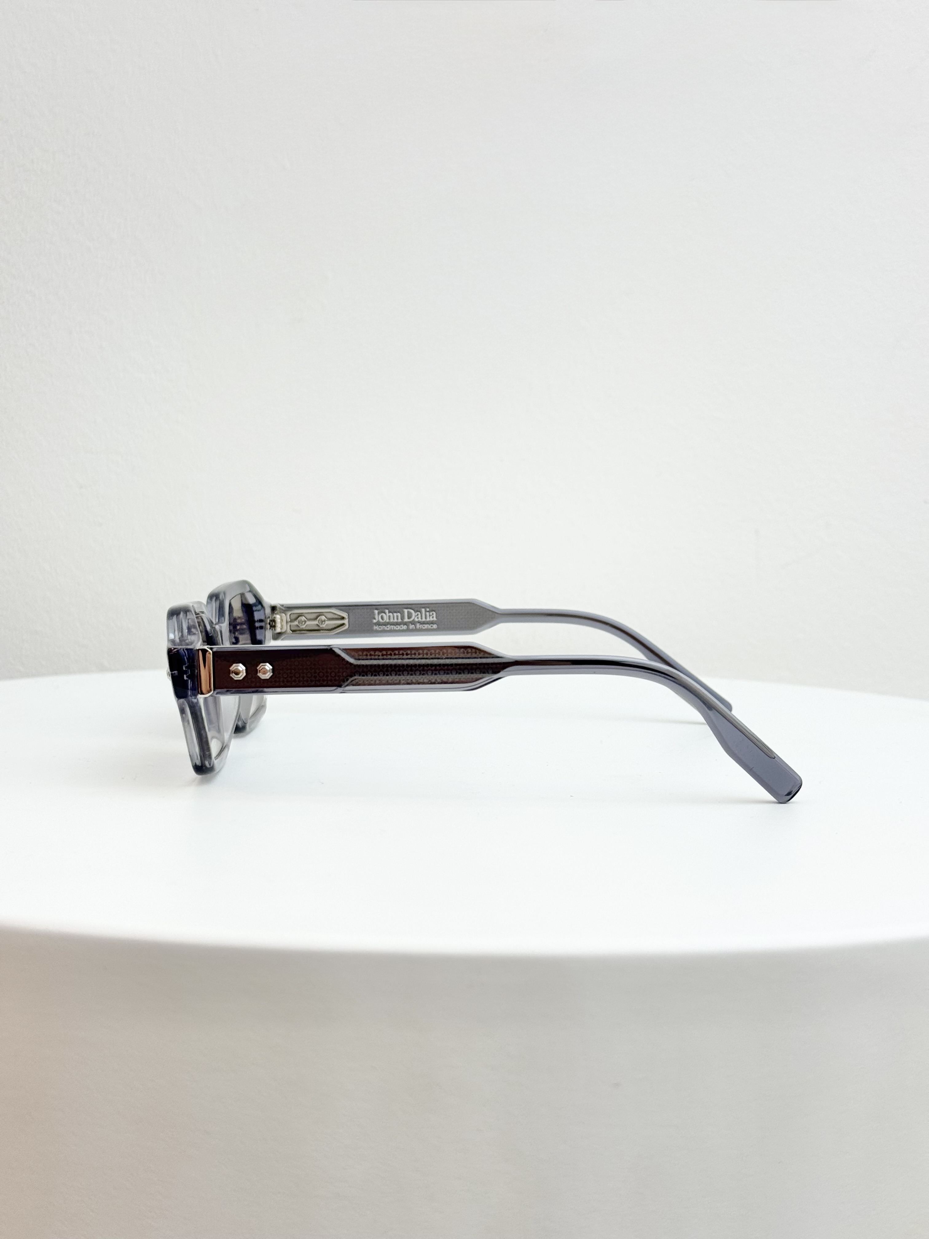 Project 09 is a unisex frame crafted from an 8mm acetate sheet. It features a rectangular shape, a signature John Dalia armature and hinges, as well as decorative pins. The Project series integrates our proprietary authentication system, combining NFC and Blockchain technology. Each frame is equipped with a fully passive NFC chip, seamlessly embedded in the right temple and activated via smartphone. Grey translucid acetate. Corewire, decorative elements in platine colored stainless steel. Dark blue gradient CR39 lenses with an anti-reflective coating on the inner surface. Colorway 159. Includes a carrying case, outer box, and cleaning cloth.