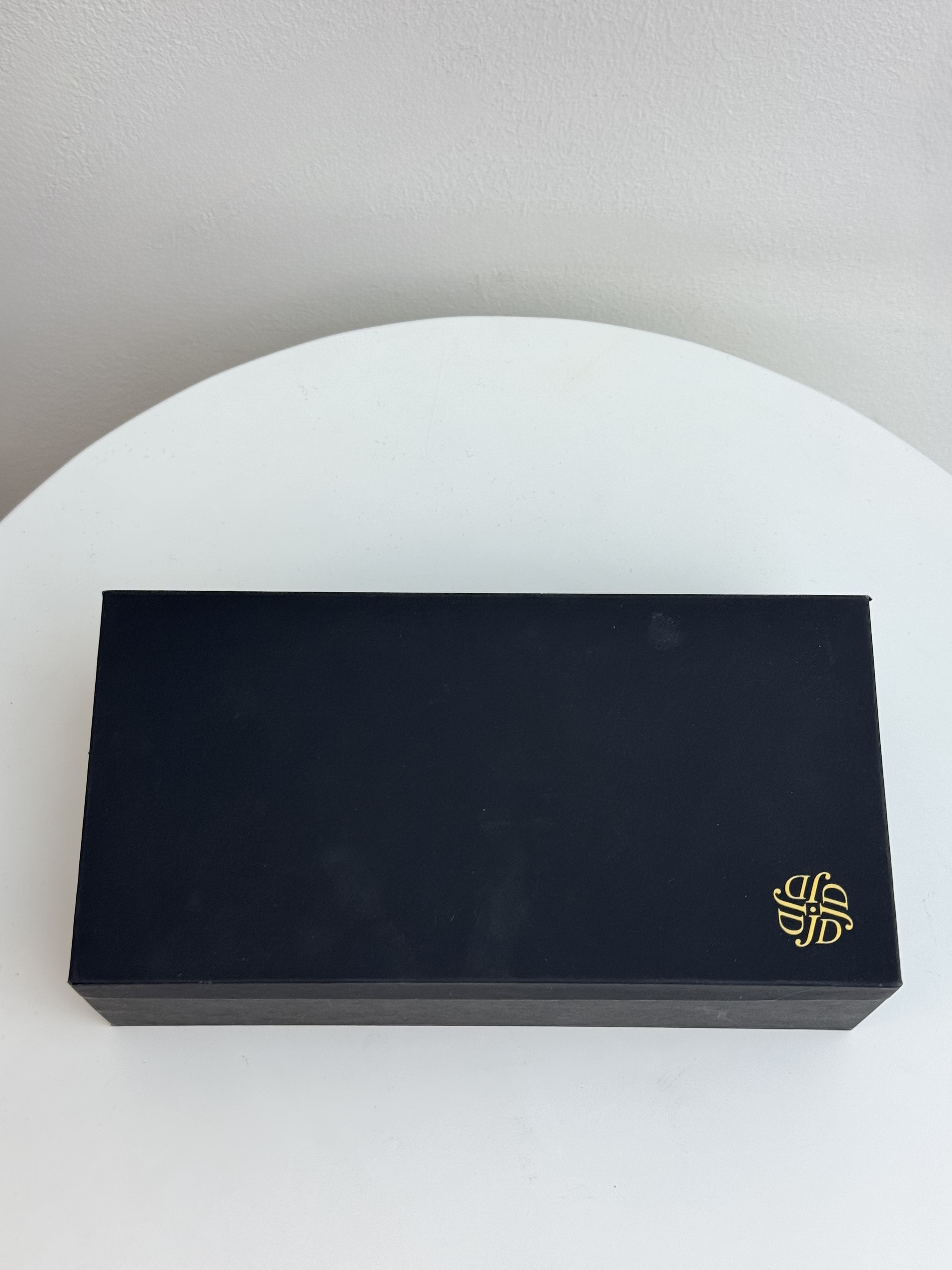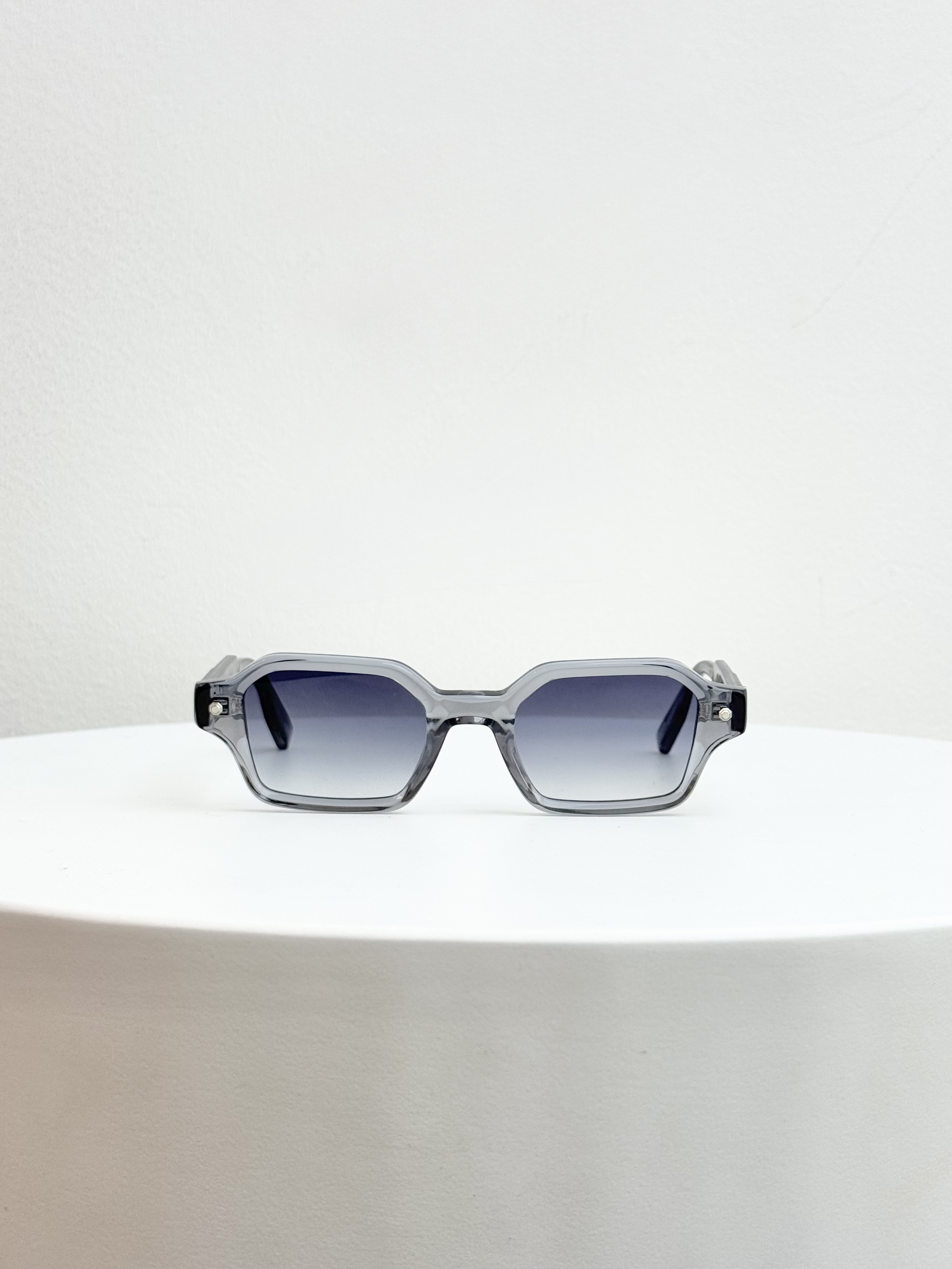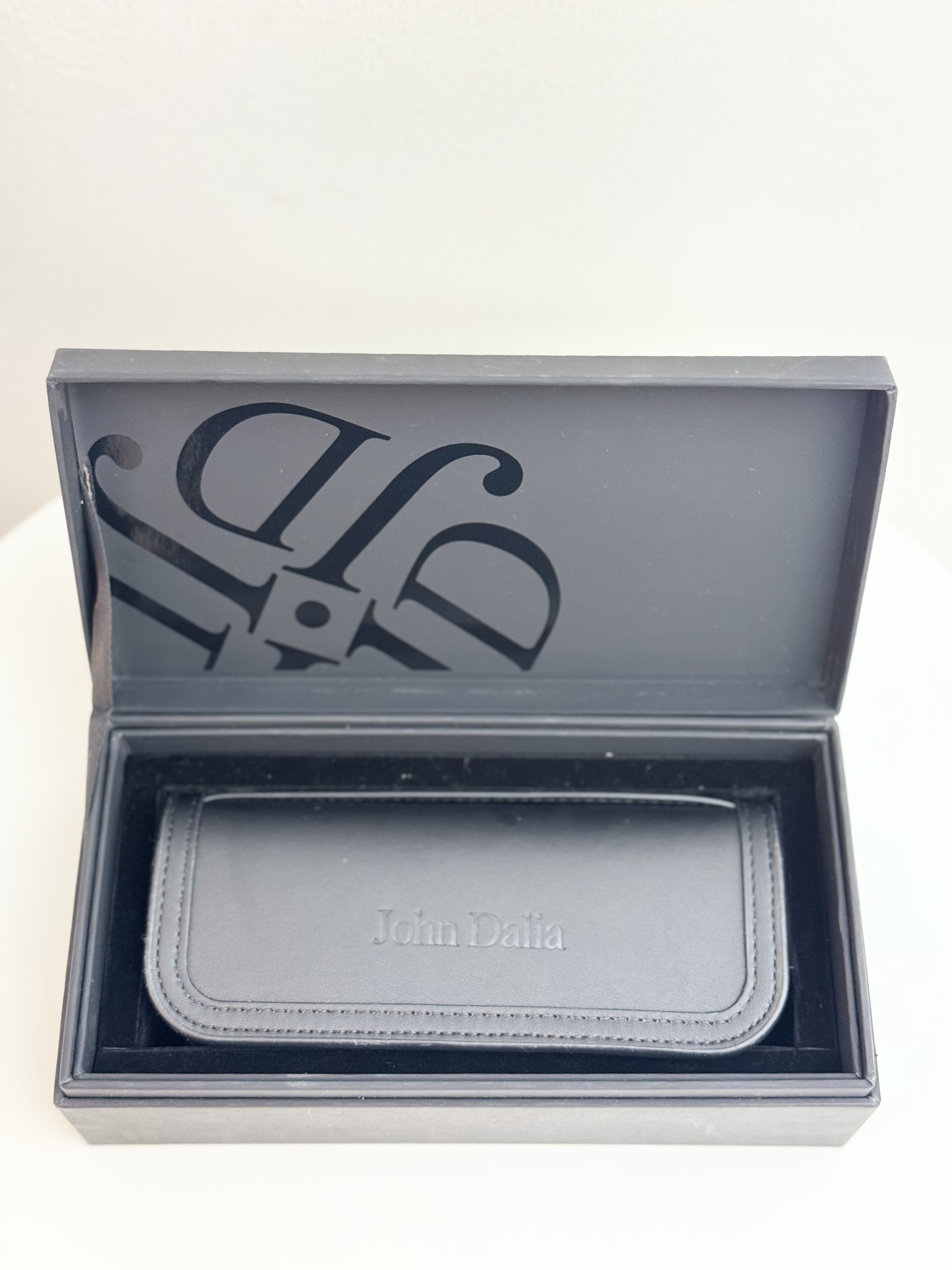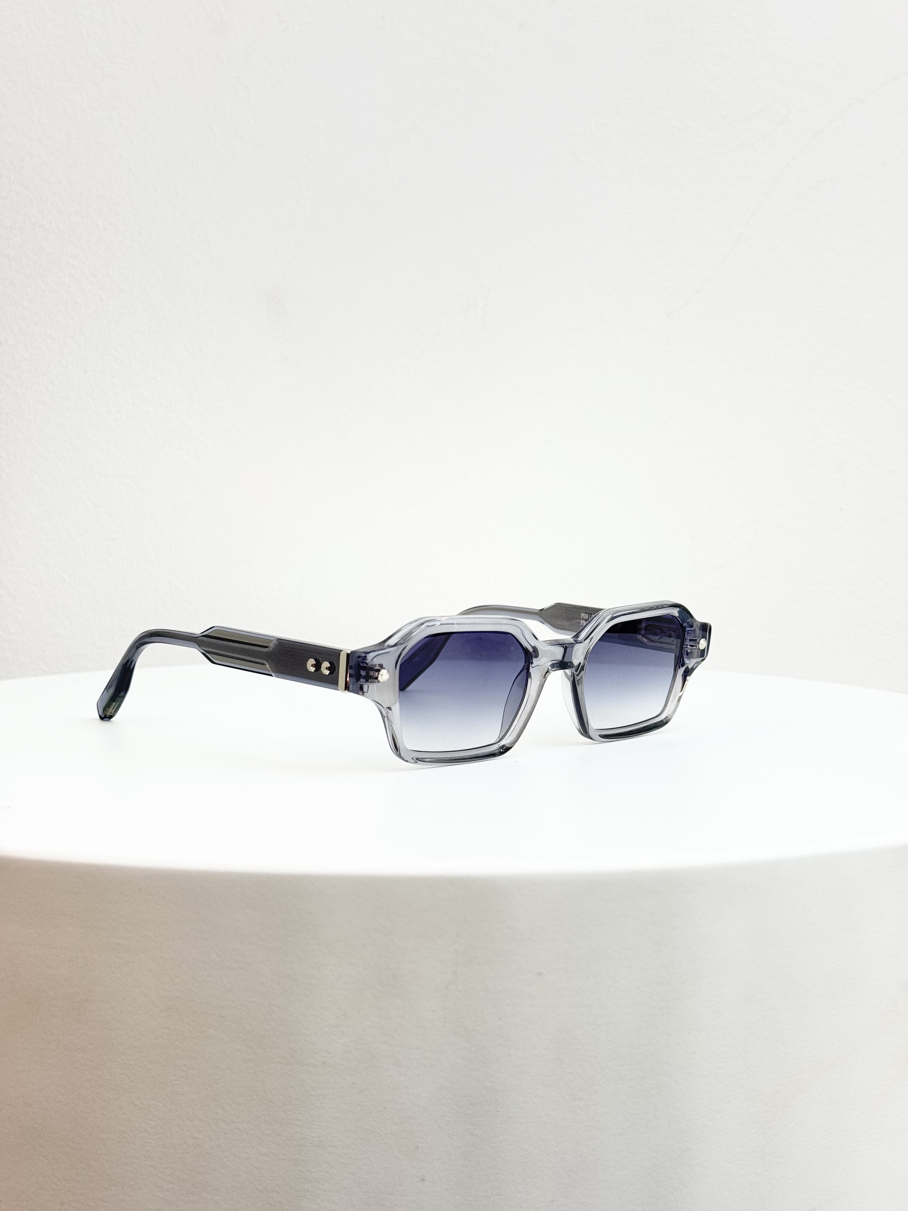 Project 09 is a unisex frame crafted from an 8mm acetate sheet. It features a rectangular shape, a signature John Dalia armature and hinges, as well as decorative pins. The Project series integrates our proprietary authentication system, combining NFC and Blockchain technology. Each frame is equipped with a fully passive NFC chip, seamlessly embedded in the right temple and activated via smartphone. Grey translucid acetate. Corewire, decorative elements in platine colored stainless steel. Dark blue gradient CR39 lenses with an anti-reflective coating on the inner surface. Colorway 159. Includes a carrying case, outer box, and cleaning cloth.