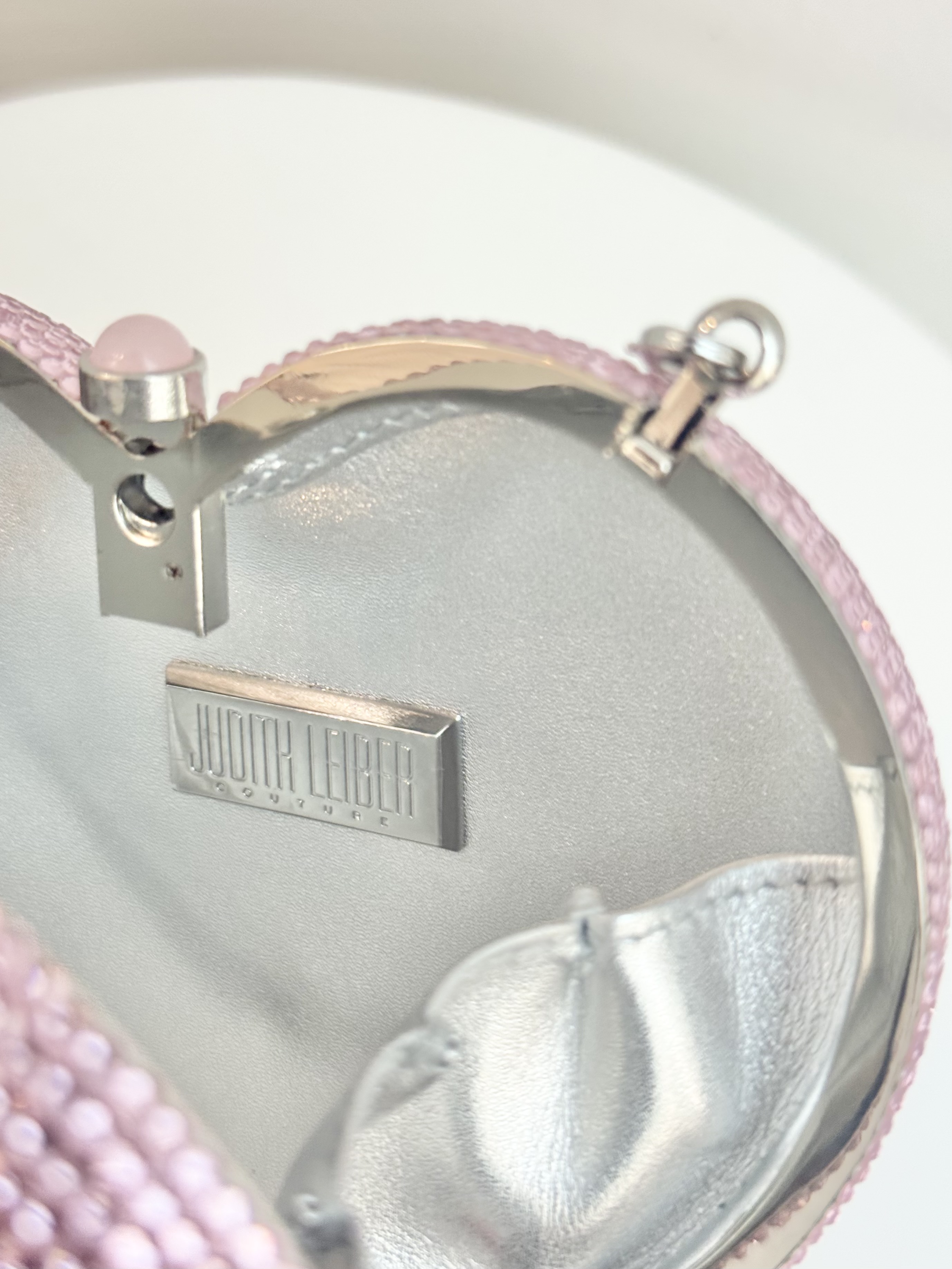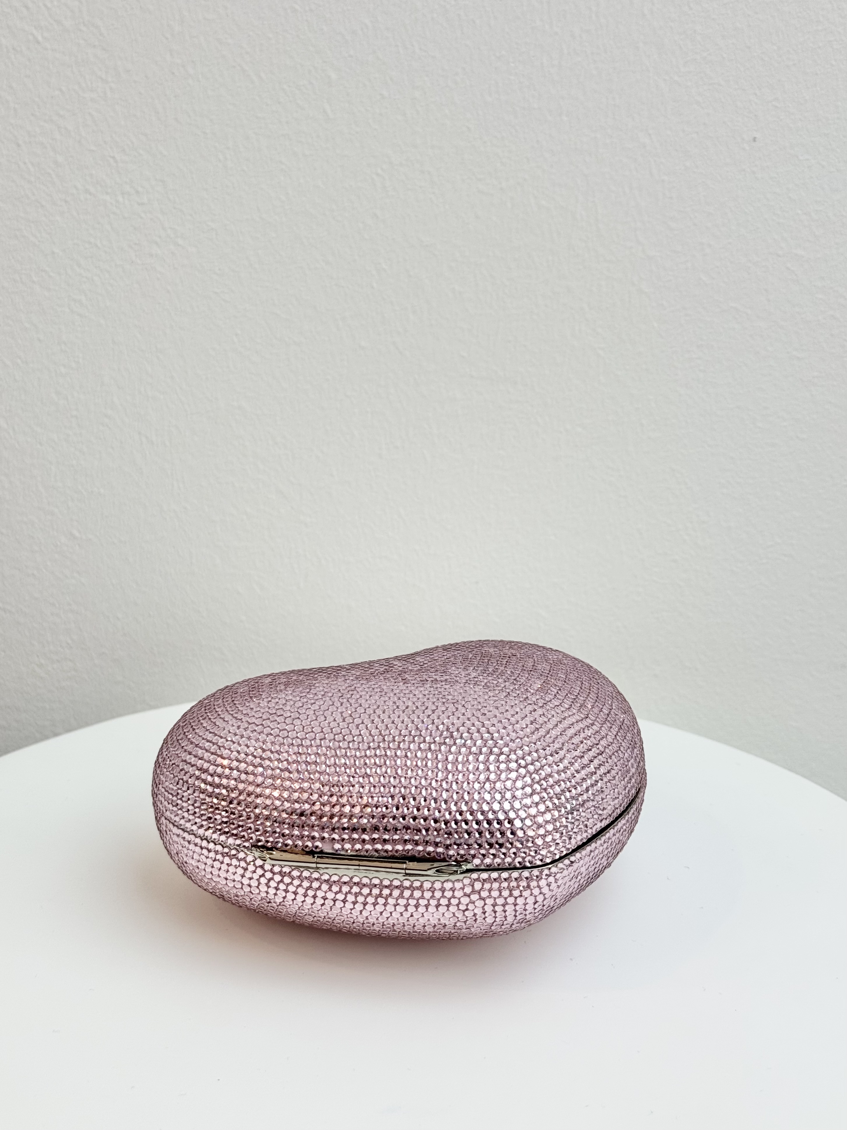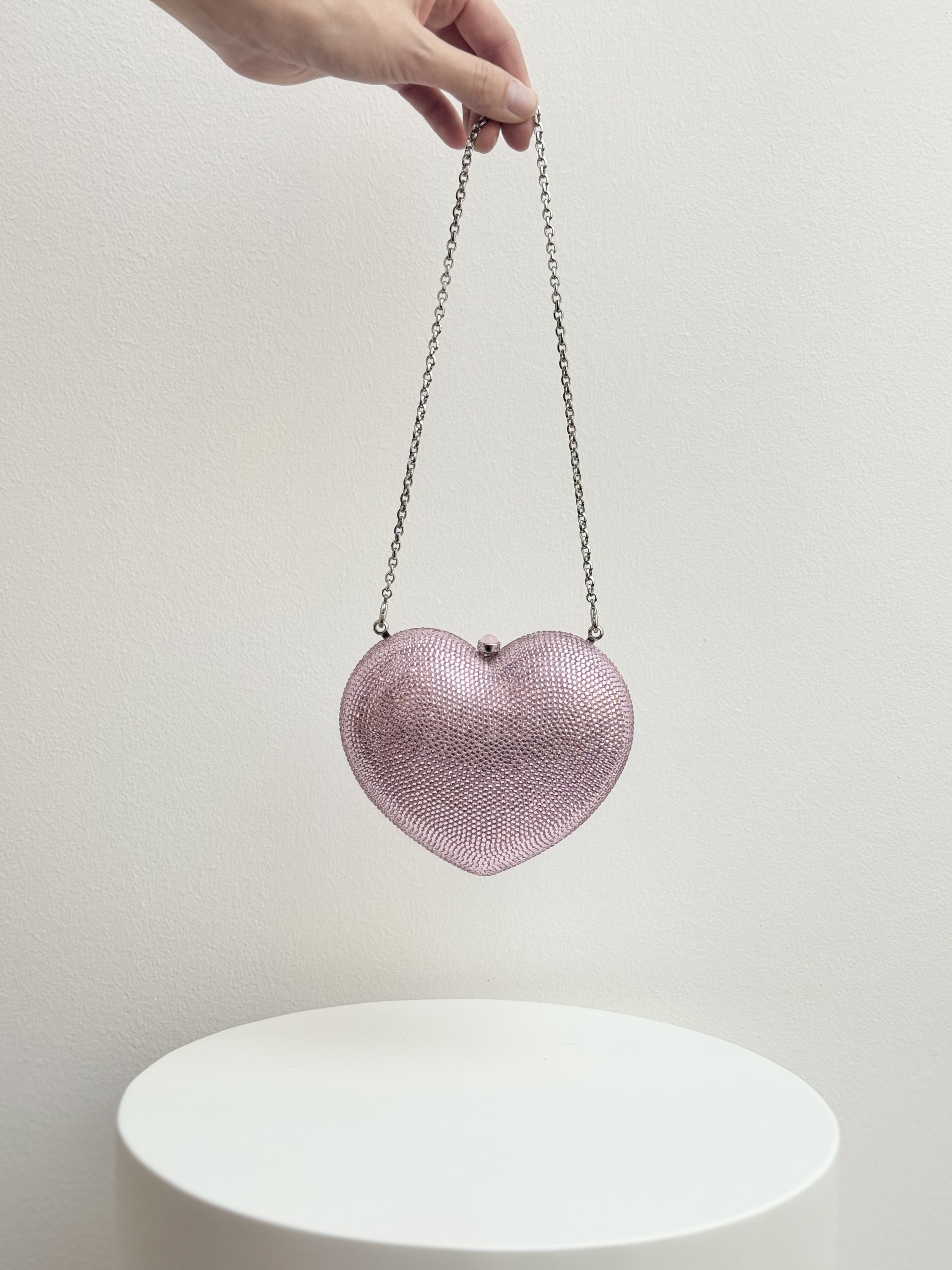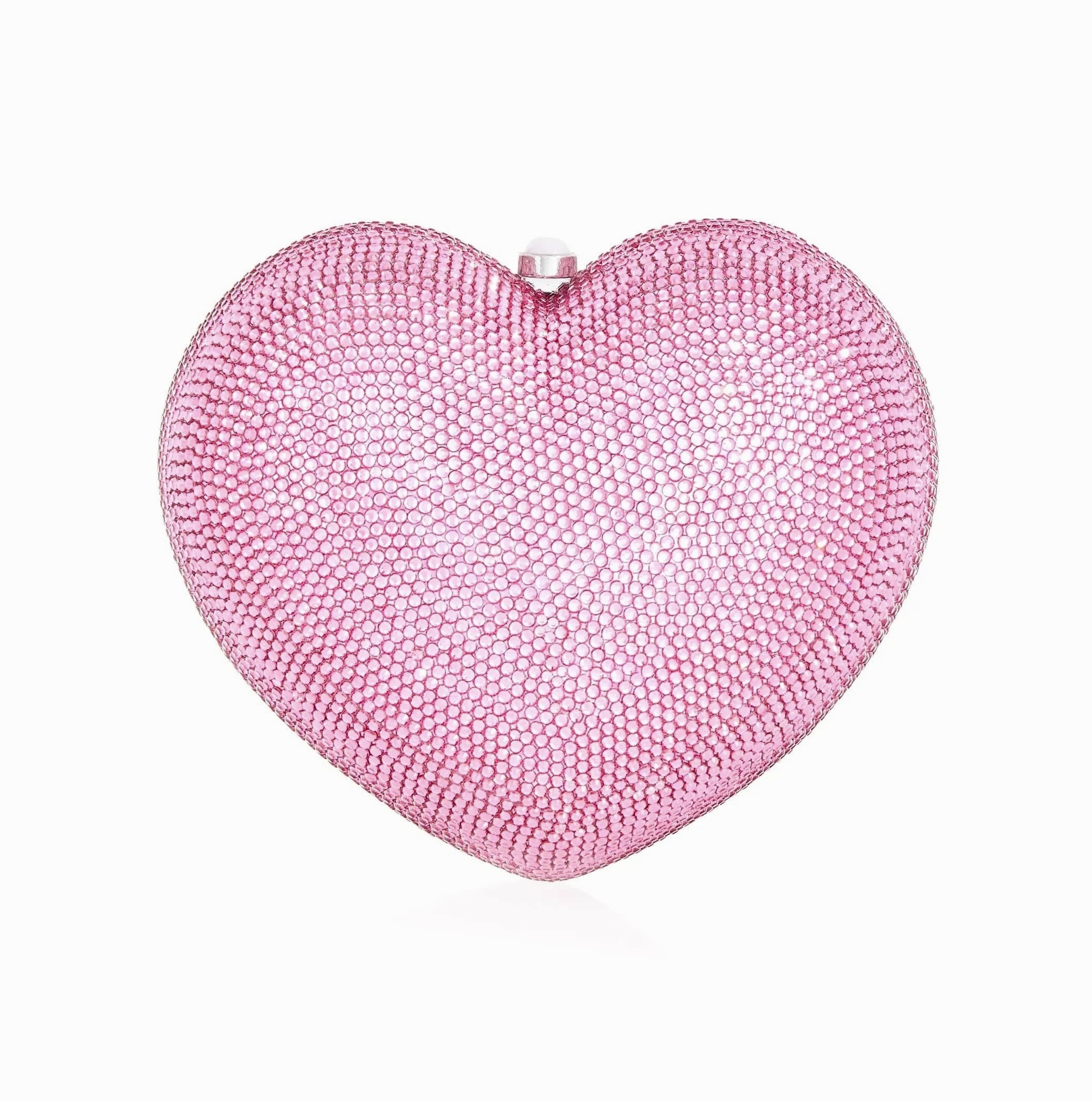 Elevate your evening look with this exquisite heart-shaped L’Amour Petit Coeur clutch by Judith Leiber. Crafted in a blush-pink hue and fully embellished with brilliant crystals, it delivers signature sparkle and timeless charm. Finished with a sleek silver-tone chain, this collectible piece is the perfect blend of whimsy and luxury—ideal for special occasions or adding a standout touch to any ensemble.