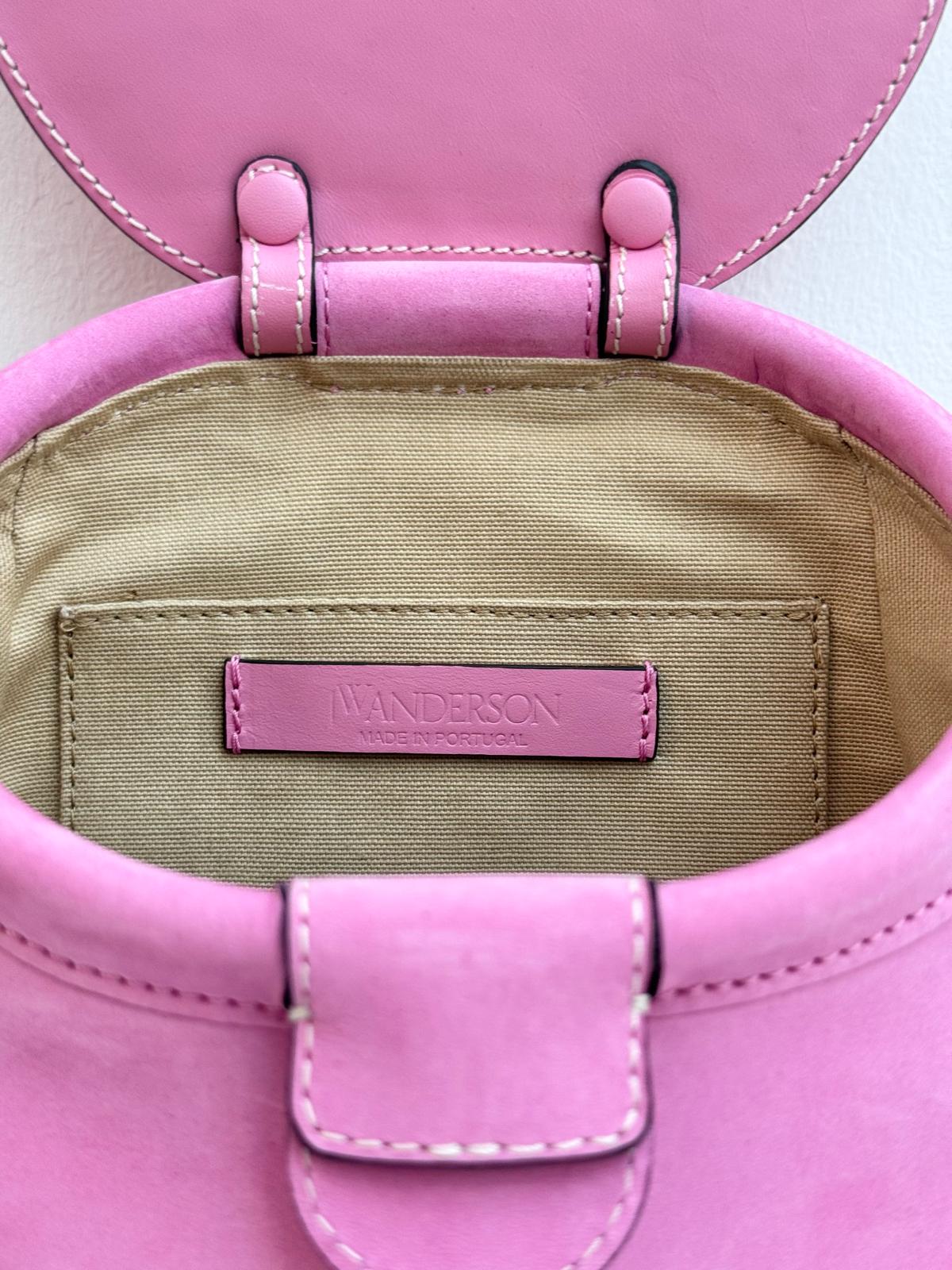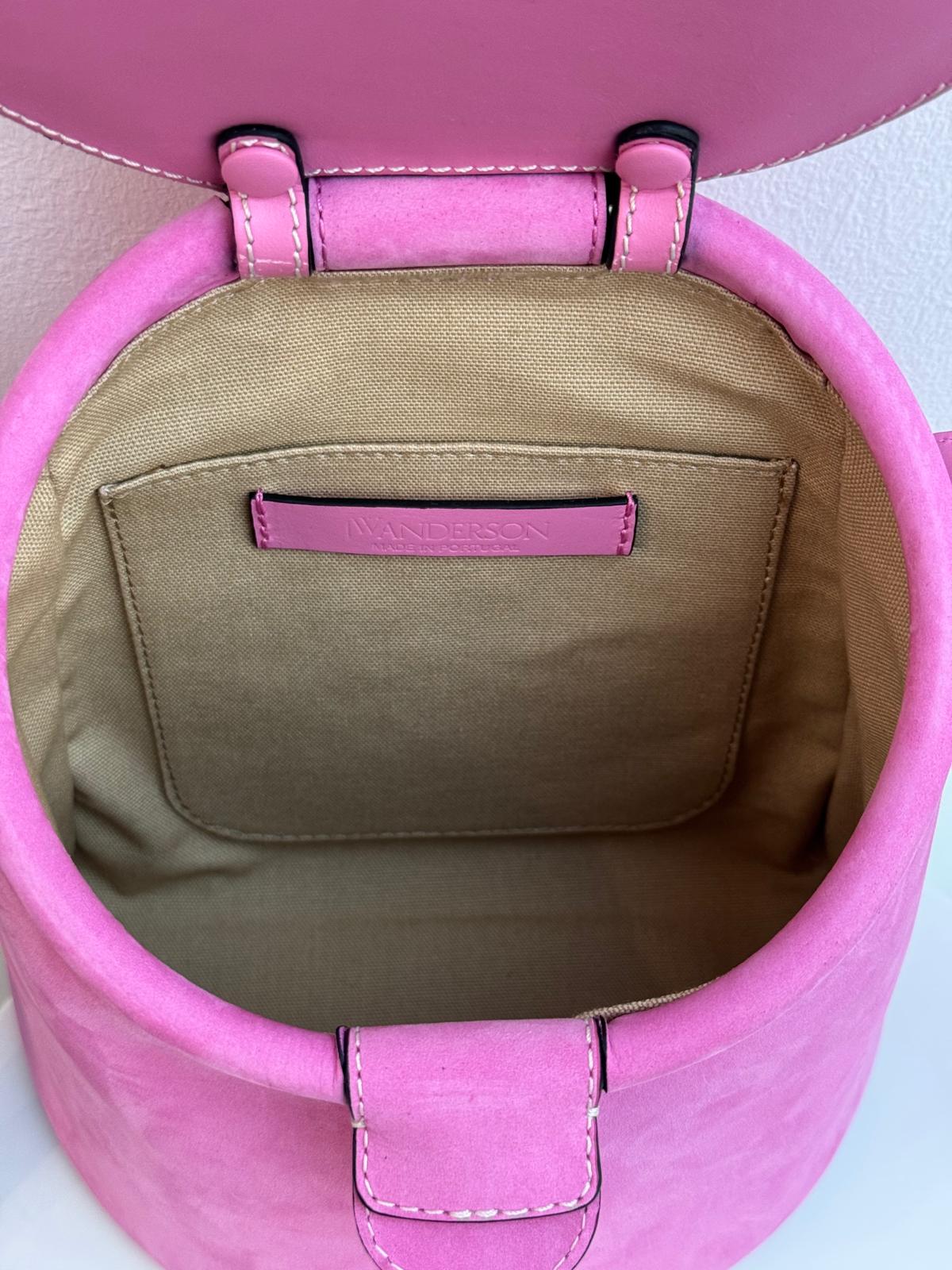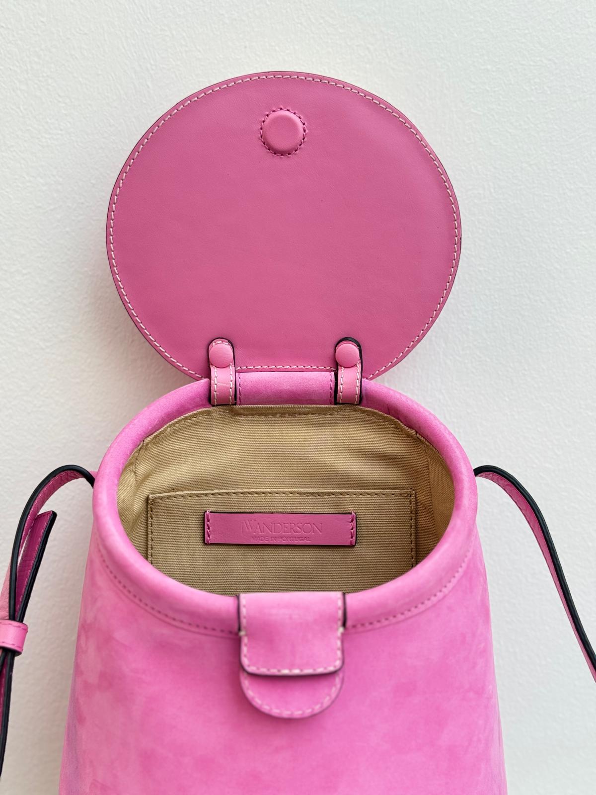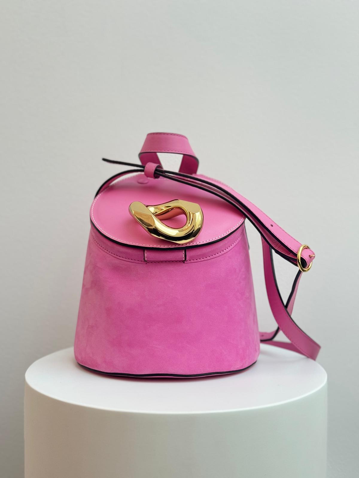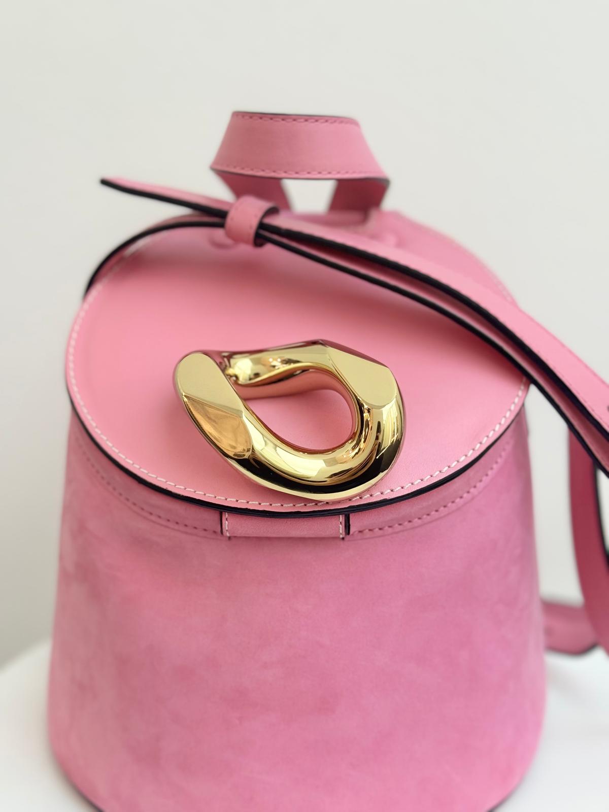 Stylish and contemporary, the JW Anderson Lid Bucket Bag is crafted from smooth pink calf leather with a signature oversized chain detail. Its compact yet structured silhouette features a drawstring closure and versatile top handle, perfect for shoulder or hand carry. A modern statement piece, combining bold design with everyday practicality.