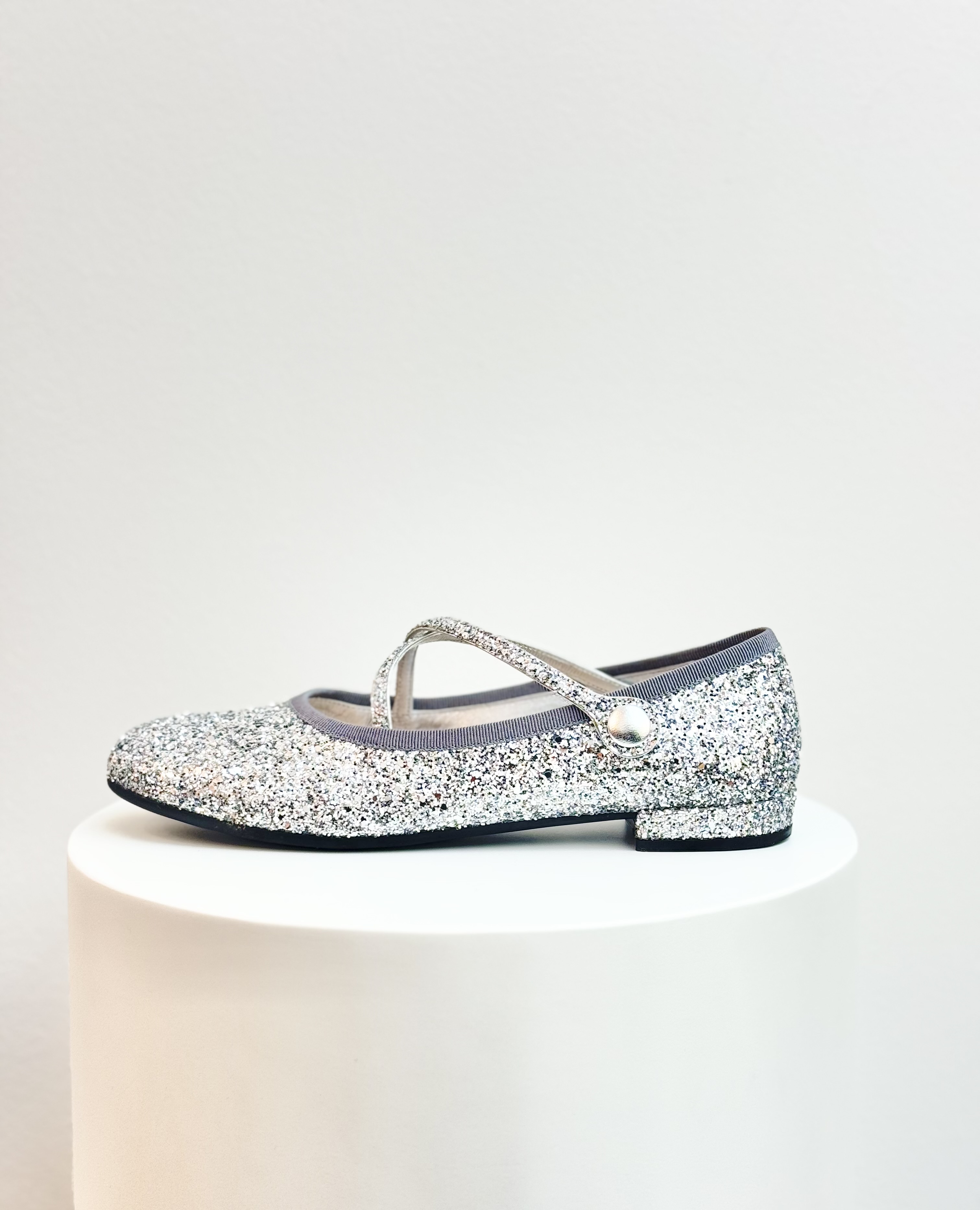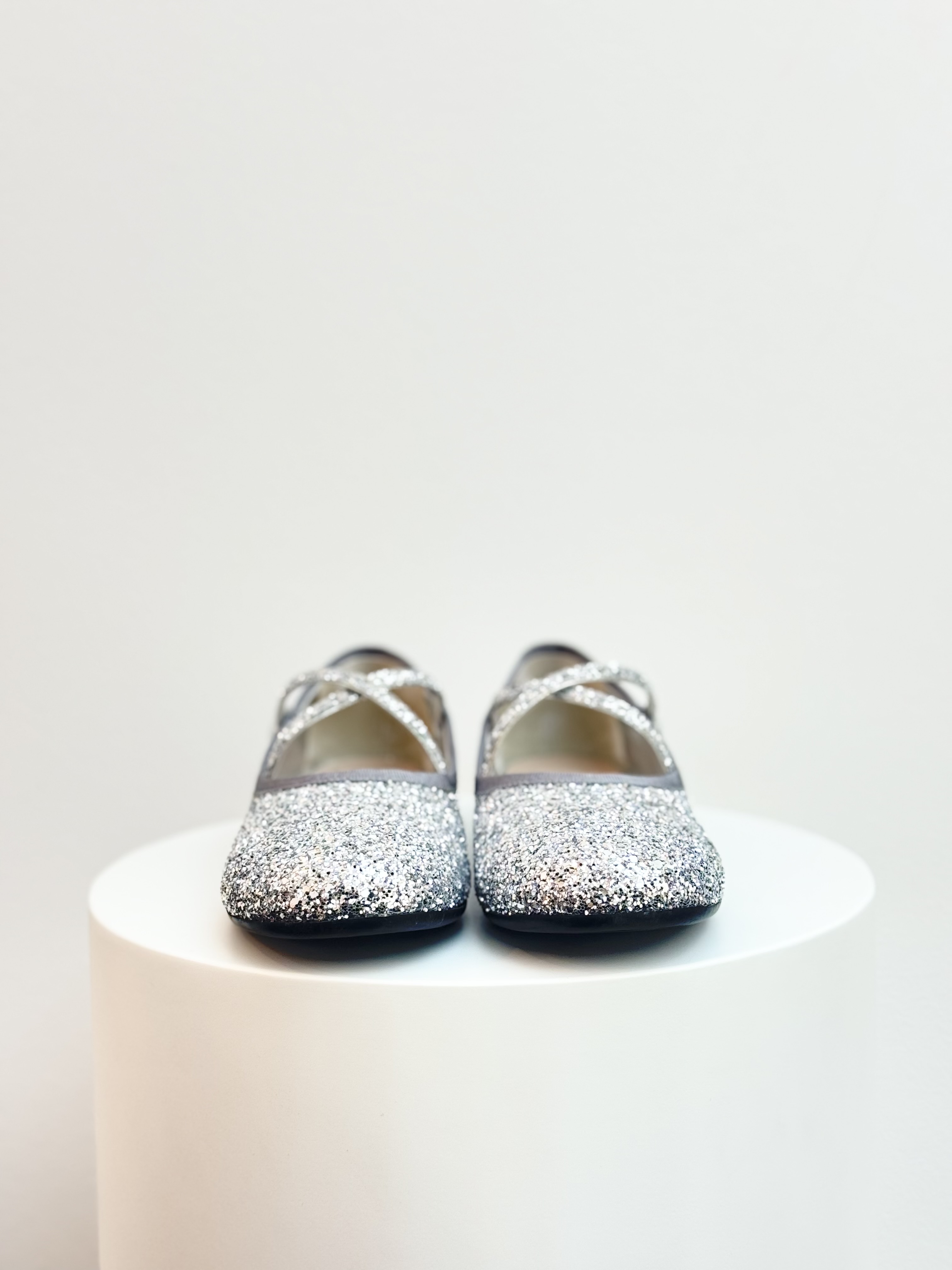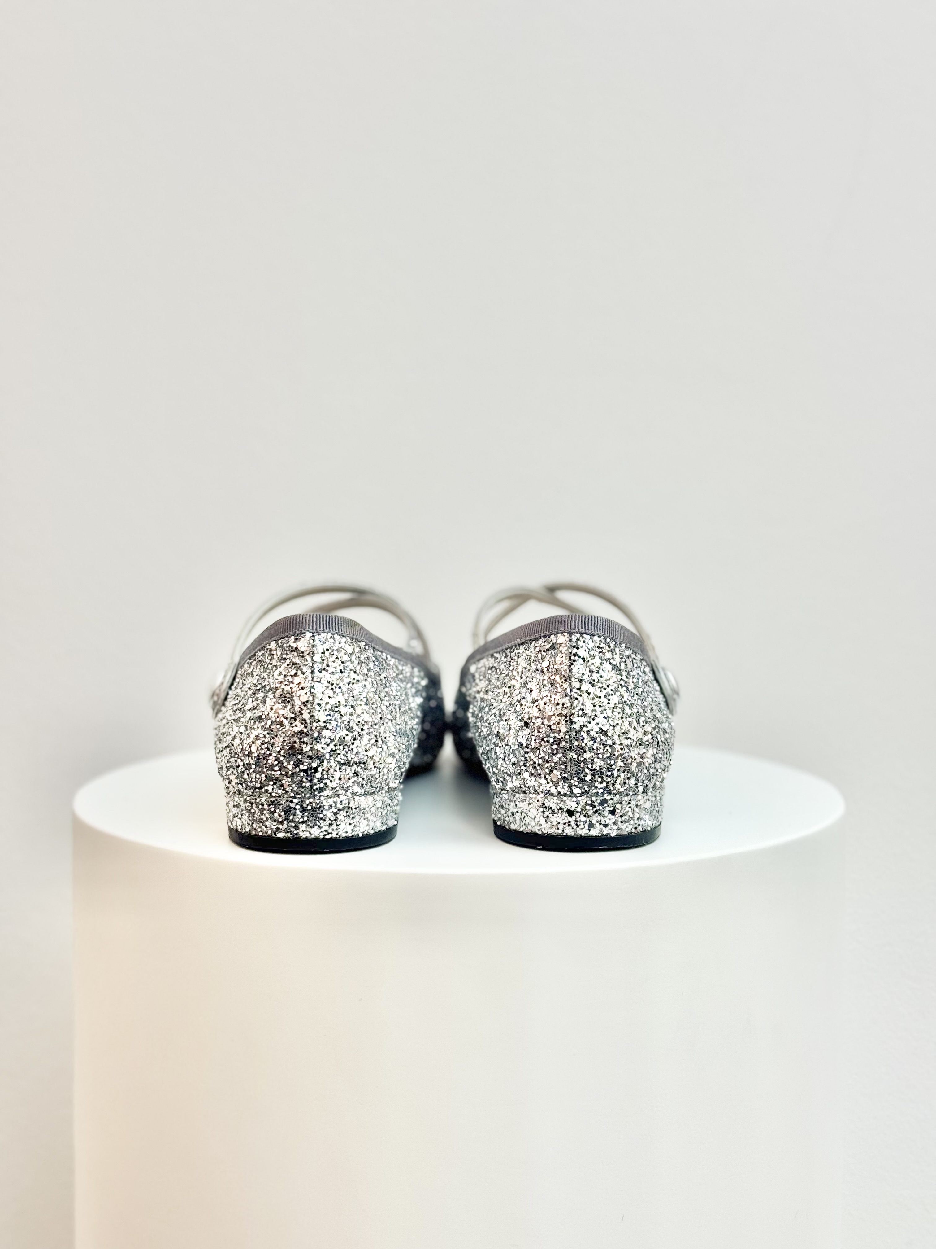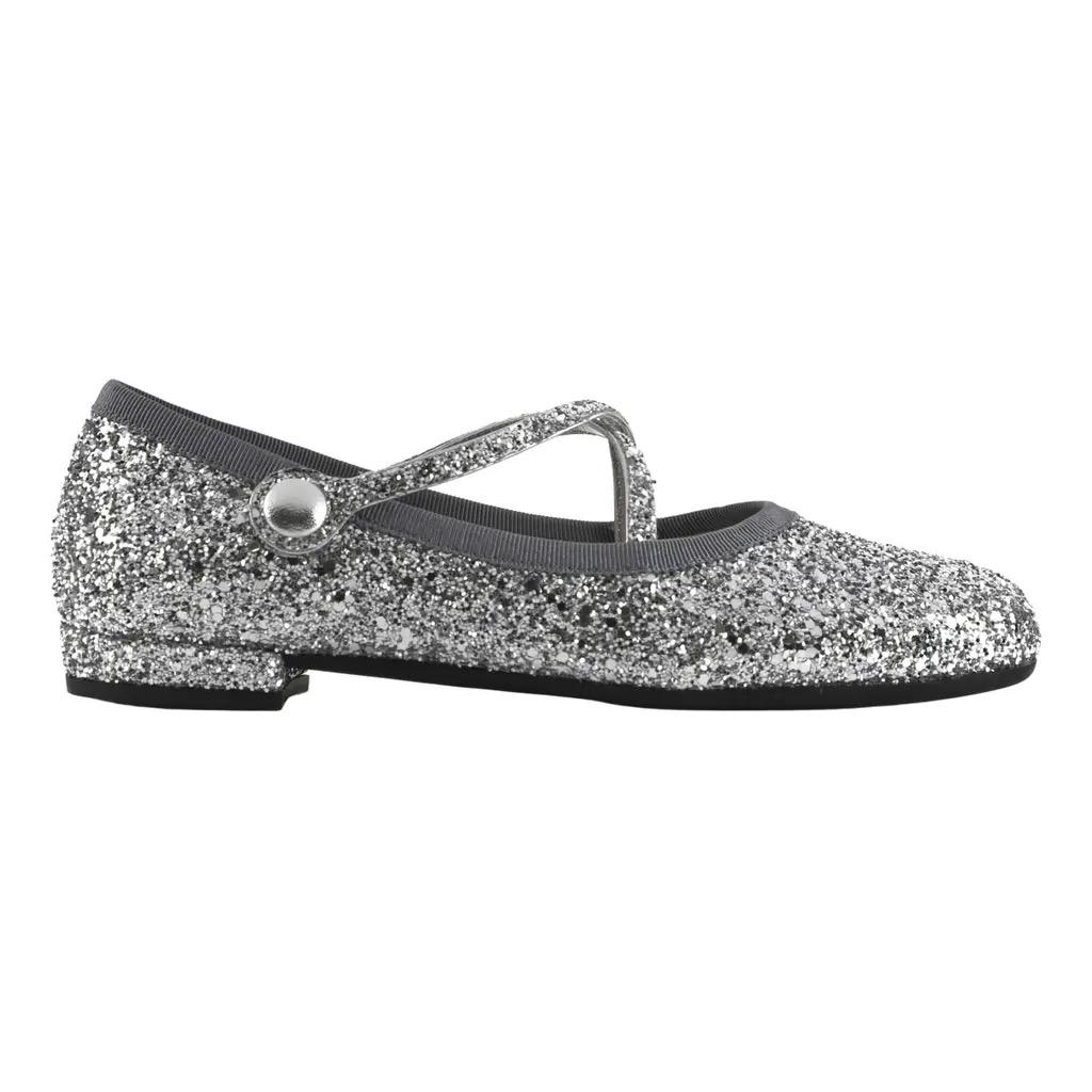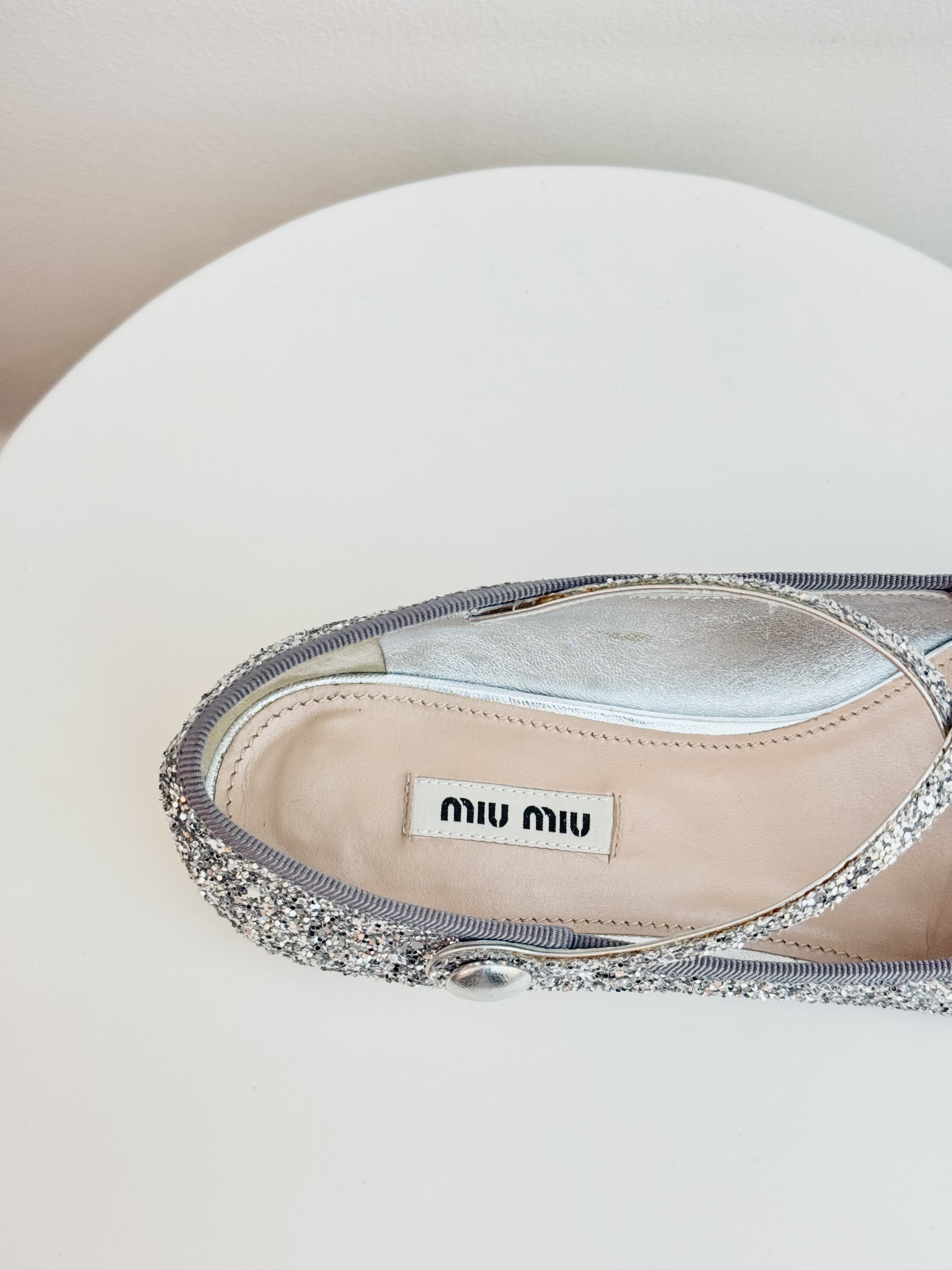 Add a touch of sparkle to your look with these Miu Miu ballet flats in dazzling silver glitter. Featuring a delicate criss-cross strap with button detail and a low heel, they combine playful charm with timeless elegance — perfect for elevating both casual and evening ensembles.