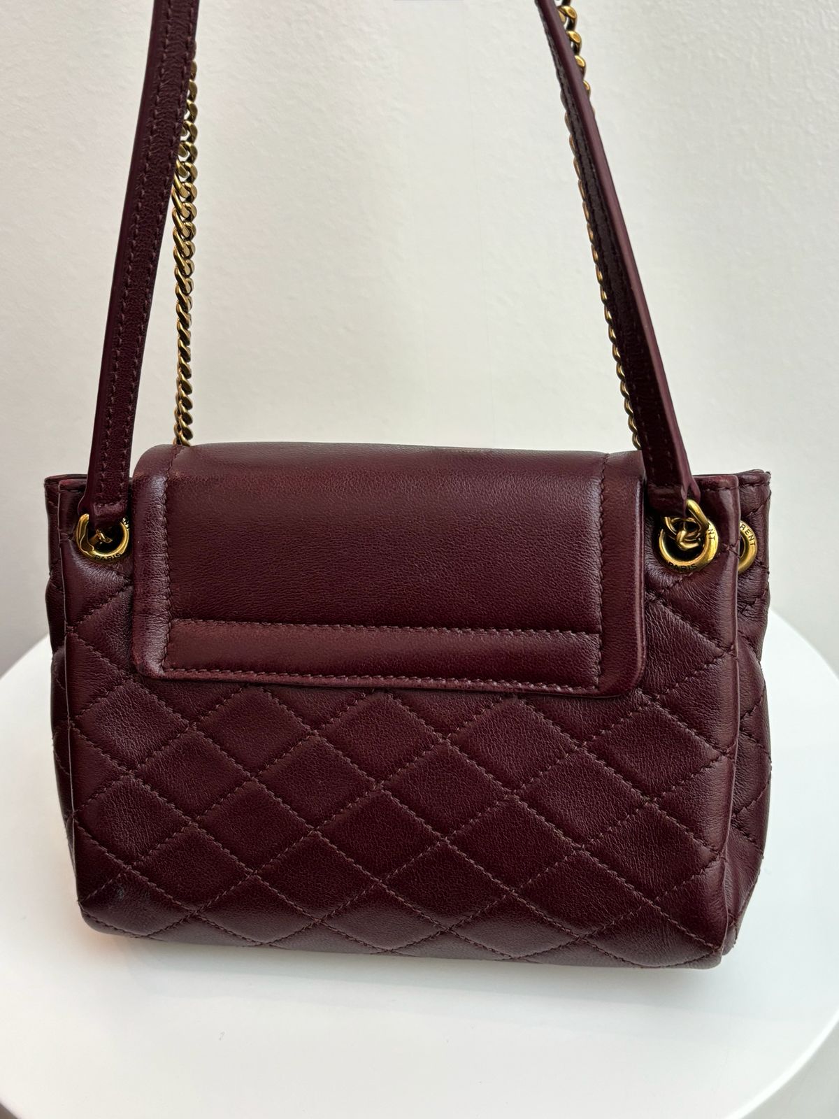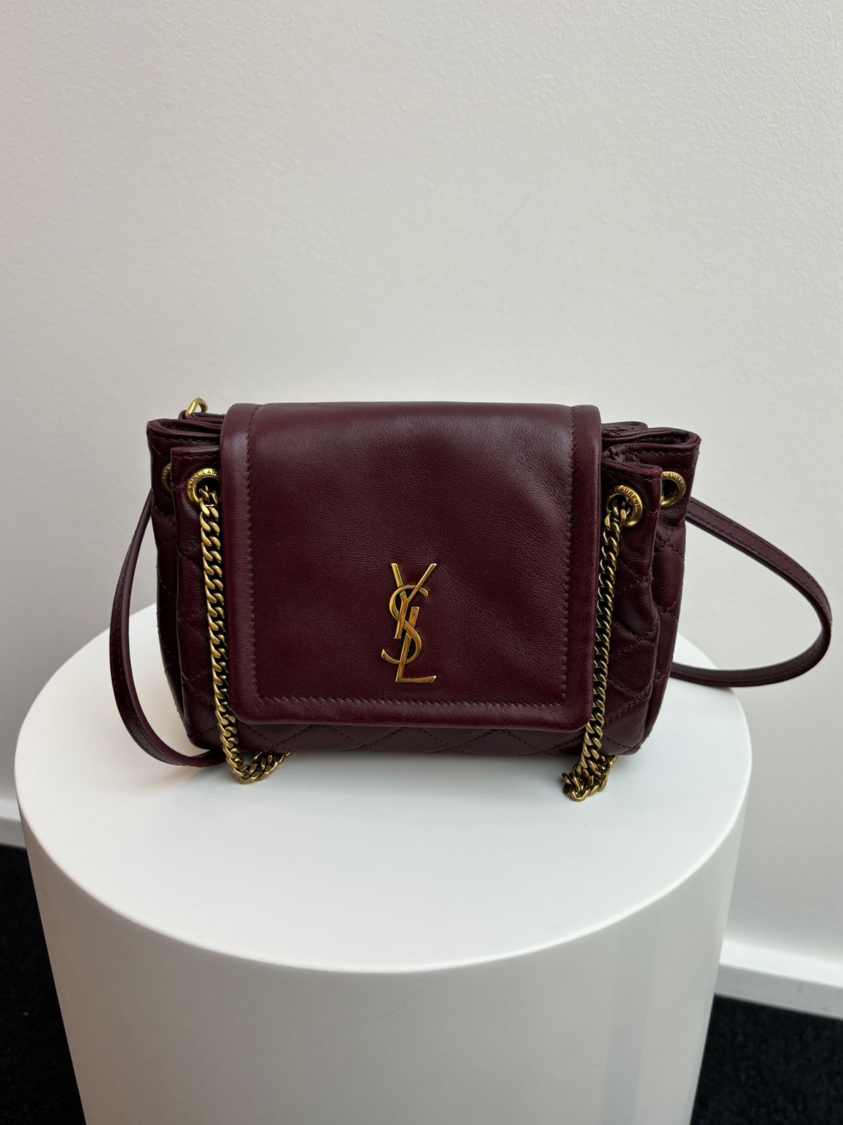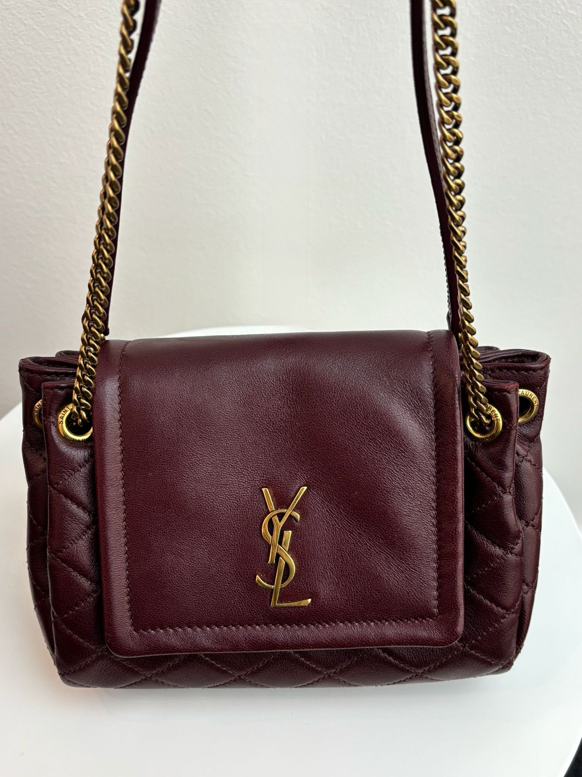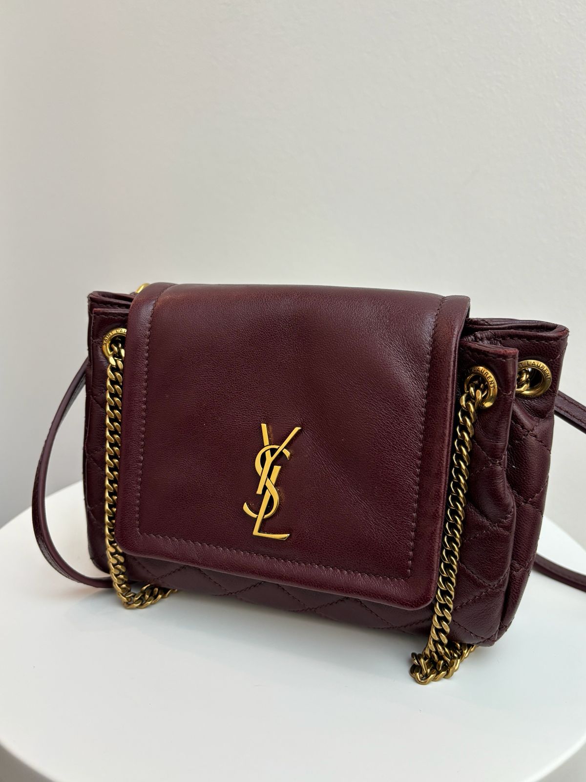 This pre-owned Saint Laurent Mini Nolita Crossbody Bag offers a blend of luxurious craftsmanship and effortless Parisian style, realized in supple lambskin leather in the deep, captivating shade of Hot Wine. Perfect for streamlined essentials, the bag features a compact silhouette with a signature YSL logo plaque on the front flap and an elegant chain-link strap for versatile crossbody or shoulder wear. This piece is an exquisite choice for adding a rich pop of color and undeniable luxury to any ensemble.