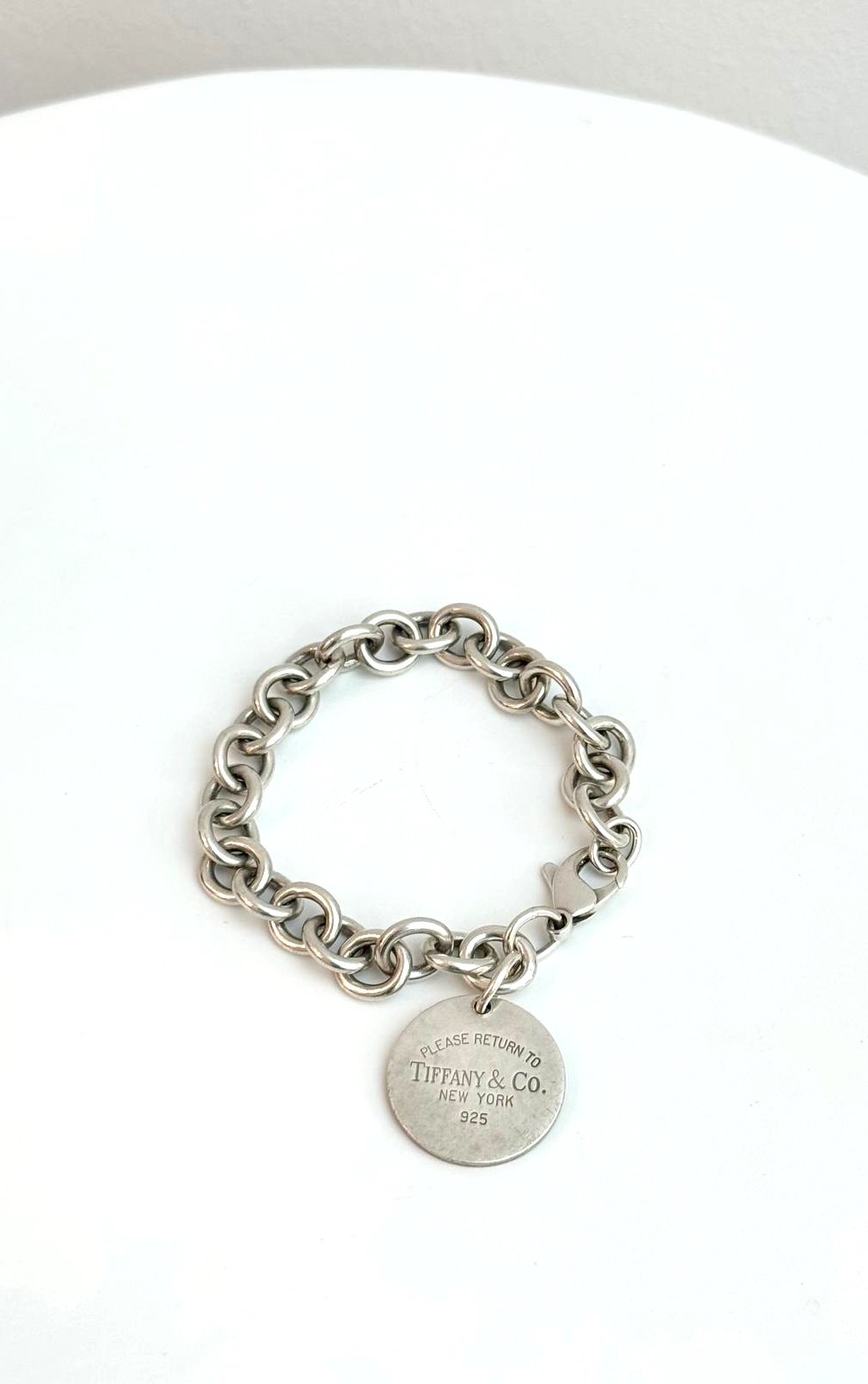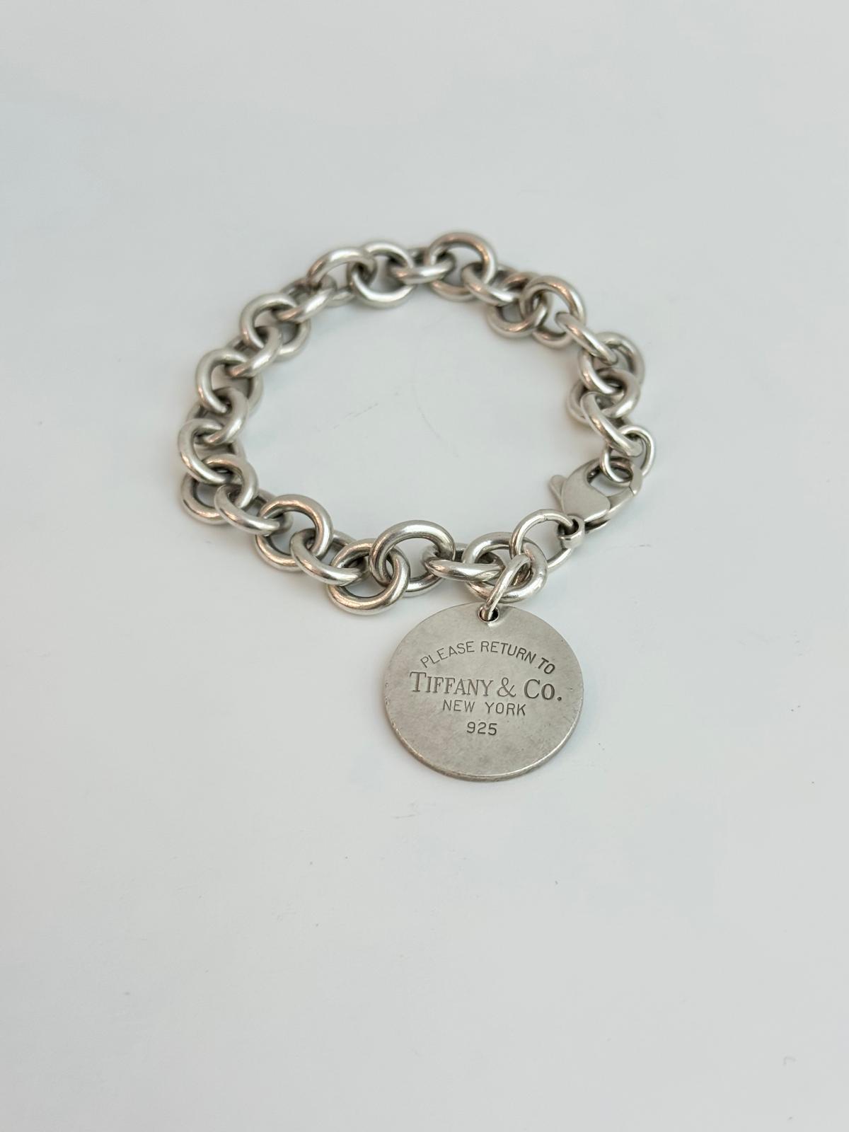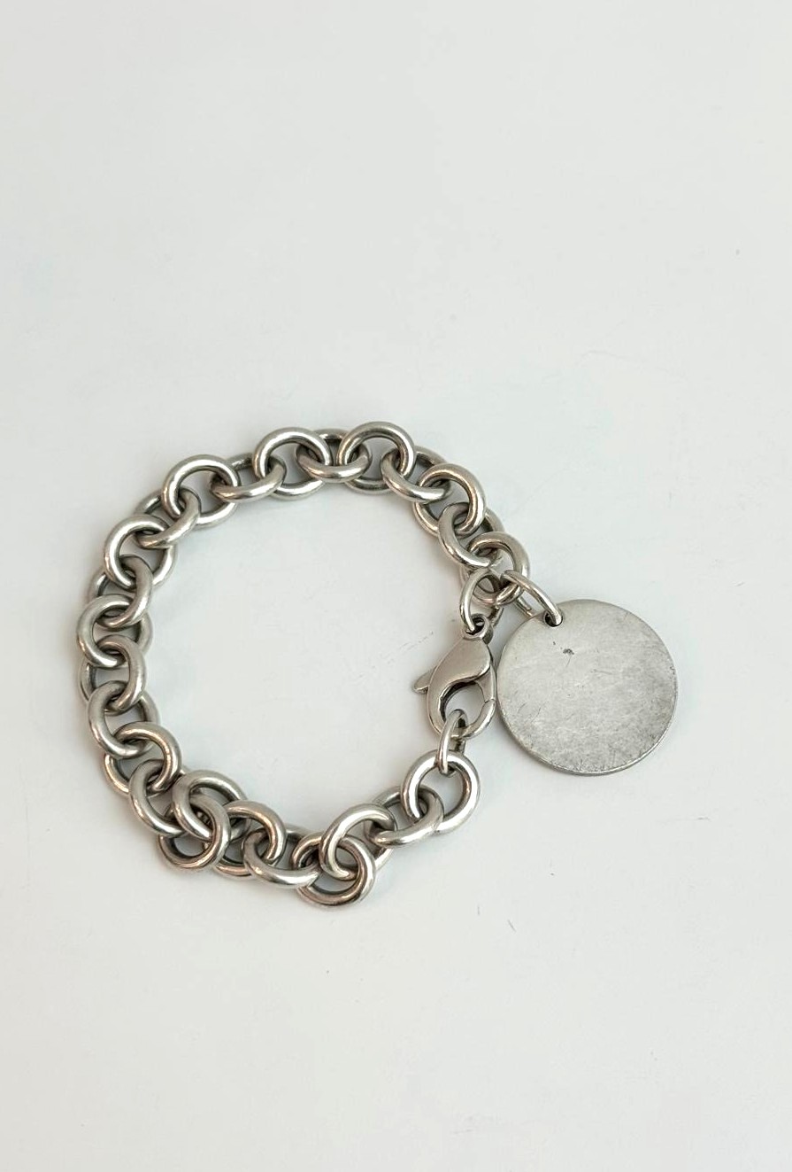 A timeless icon of Tiffany & Co., the Return to Tiffany Round Tag Bracelet is crafted from polished 925 sterling silver and features the signature engraved round tag charm. Its elegant link chain and secure clasp make it versatile for everyday wear or layered styling. Sleek, sophisticated, and unmistakably Tiffany, this bracelet embodies classic luxury with a modern, understated edge.